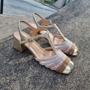 Sandali gabbia modello gilda realizzati in camoscio e pelle laminata tacco 5 cm fasciato pelle