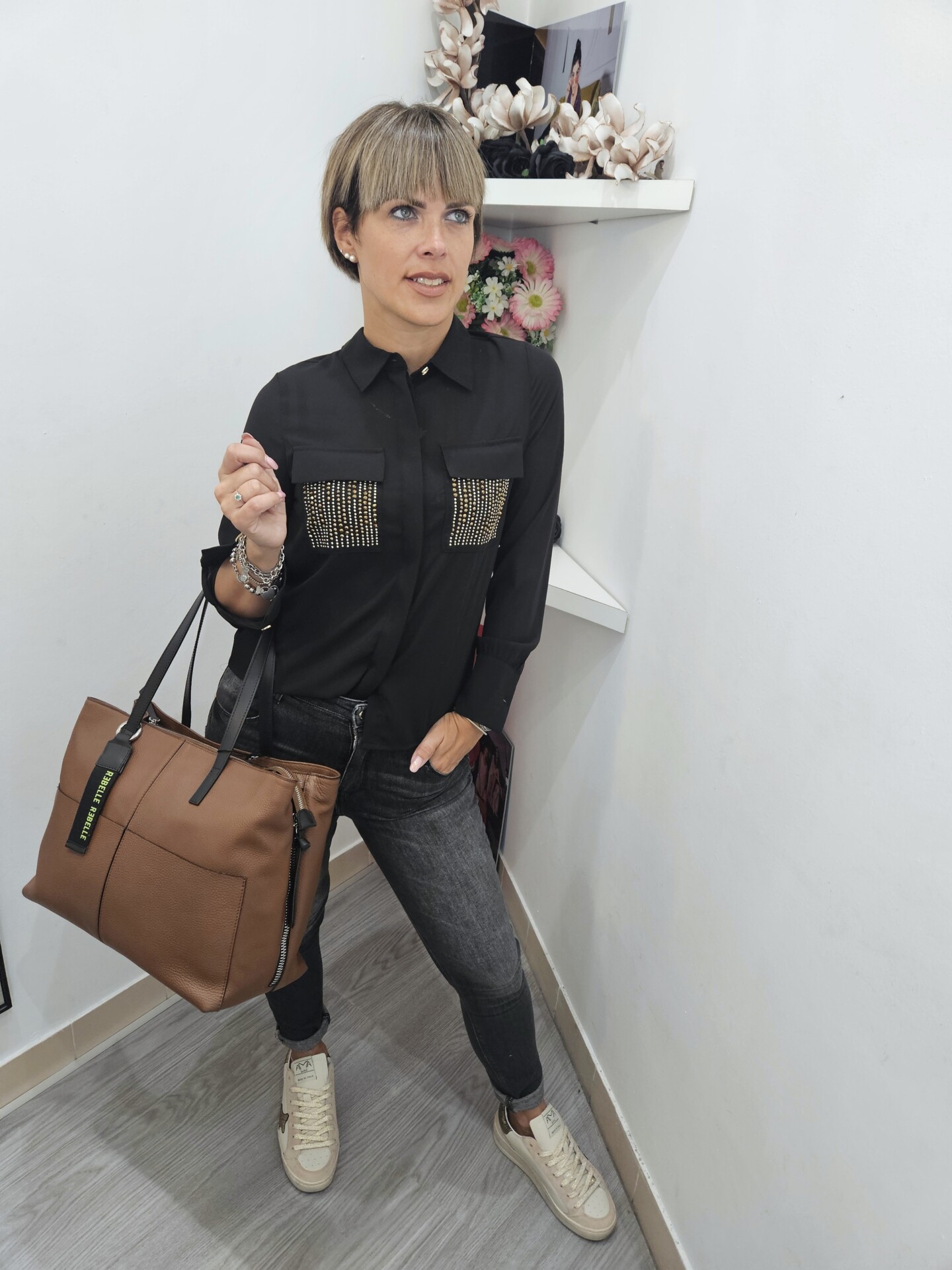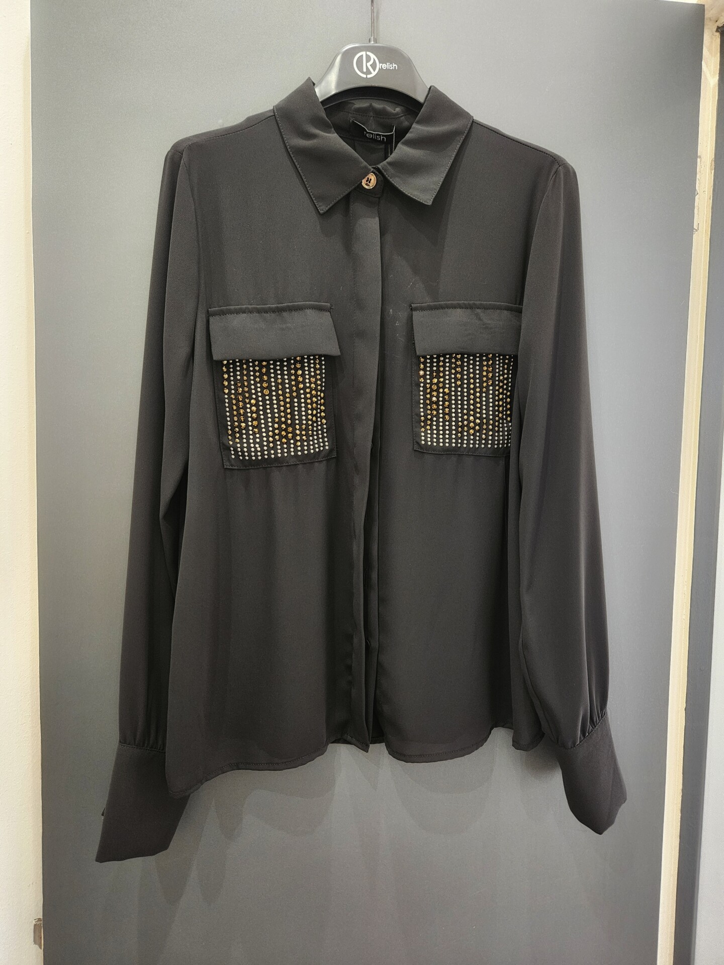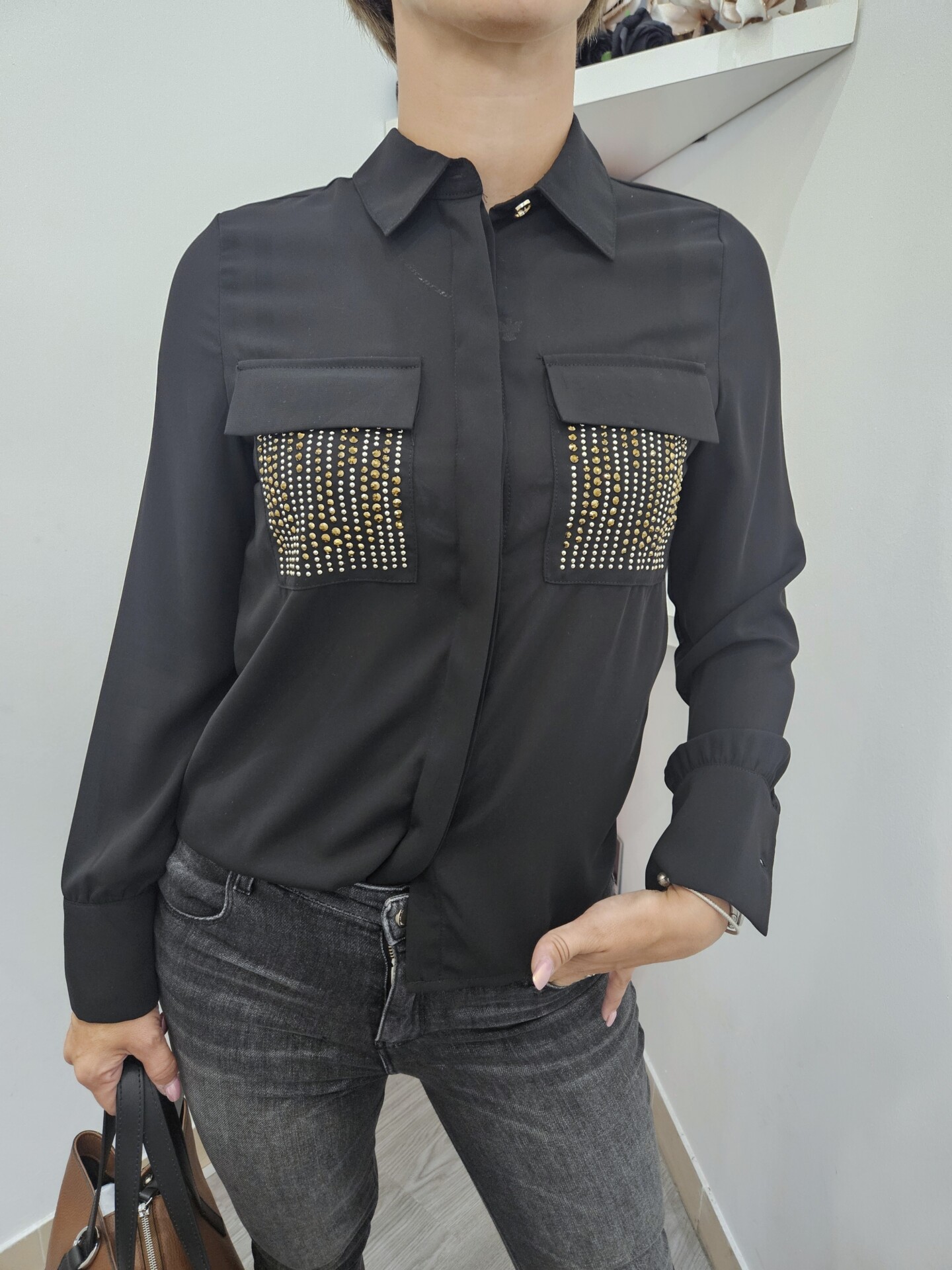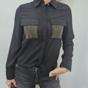 Camicia Juwell a maniche lunghe, con tasche frontali arricchite da strass, borchie e patte decorative. Un capo dal carattere deciso che unisce stile urban e dettagli preziosi, perfetto per look grintosi e glamour.