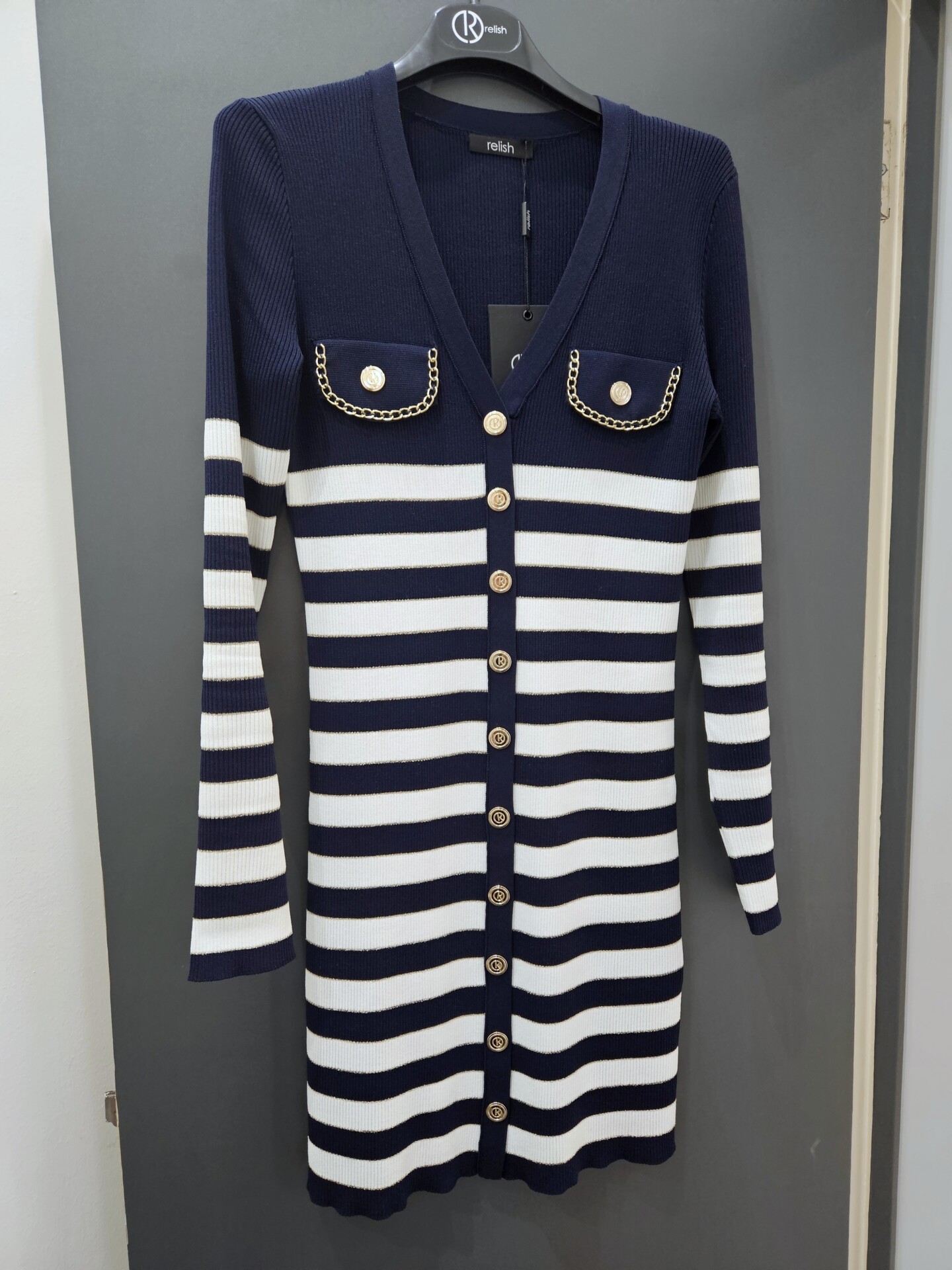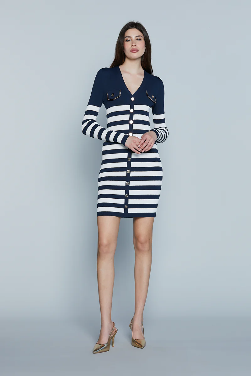 L’Abito Vilanova è il capo perfetto per chi cerca un look sofisticato con dettagli unici. Lo scollo a V e i bottoni sul davanti donano eleganza e femminilità. Le patte impreziosite da profili a catena aggiungono un tocco glamour, mentre la fantasia a righe regala dinamismo e stile. Un abito versatile, ideale per per essere chic anche nelle occasioni quotidiane.