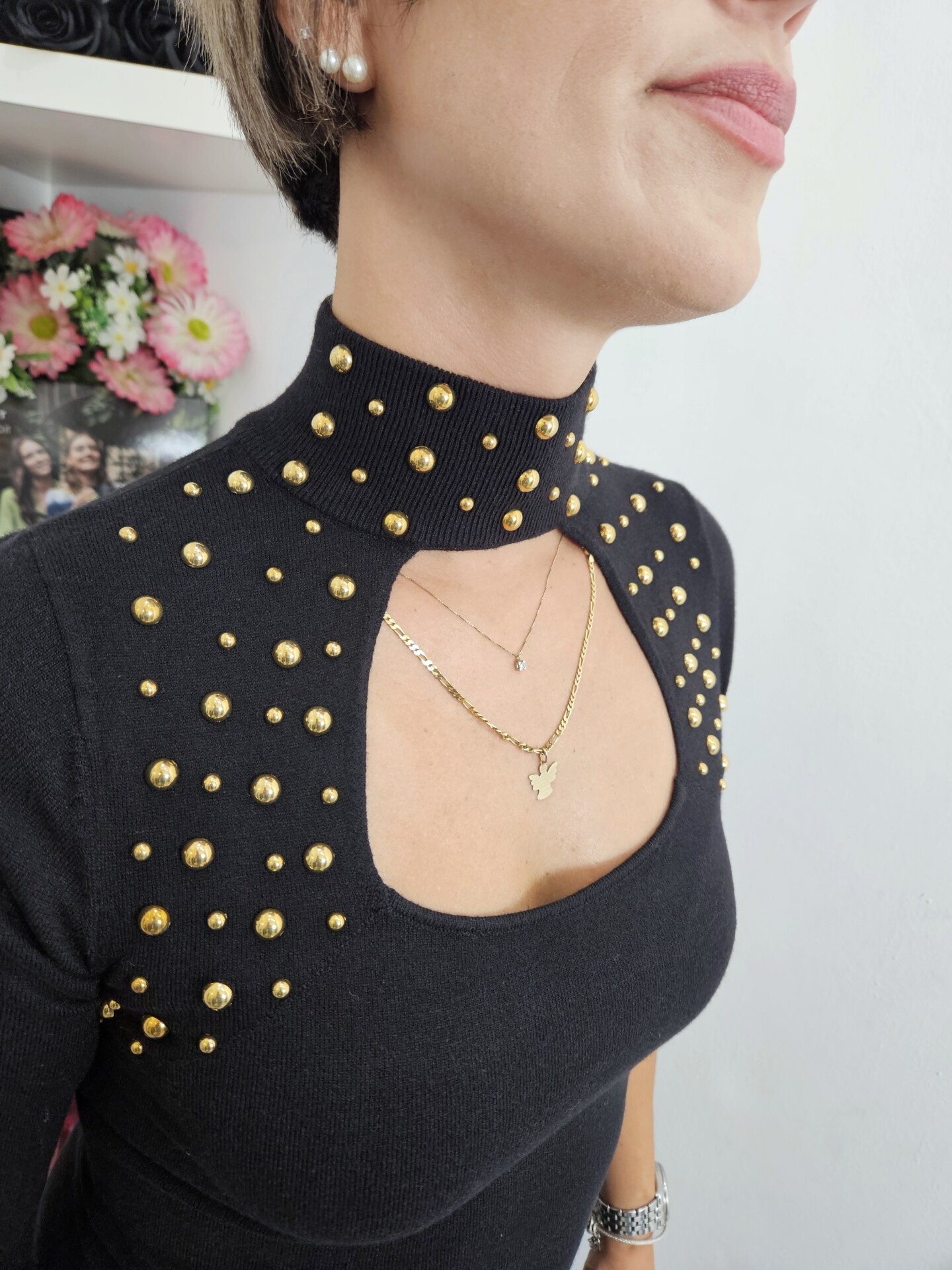 L’abito SIGUANG unisce linee sensuali e dettagli di carattere. Il collo alto contrasta con l’apertura frontale a forma di cuore, creando un effetto elegante ma audace. Le borchie applicate aggiungono un tocco grintoso e moderno, perfetto per chi ama distinguersi con stile. Il taglio corto valorizza la silhouette, rendendolo ideale per party, eventi o serate speciali.