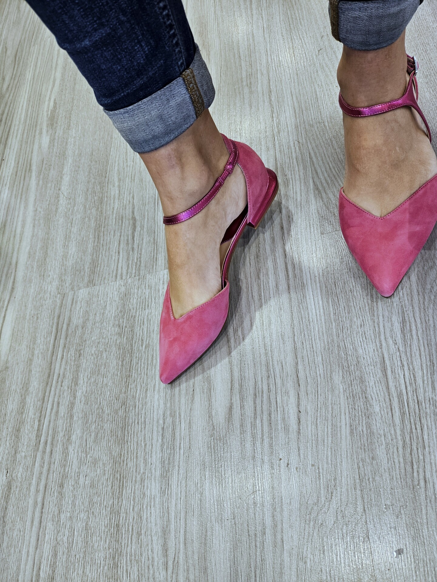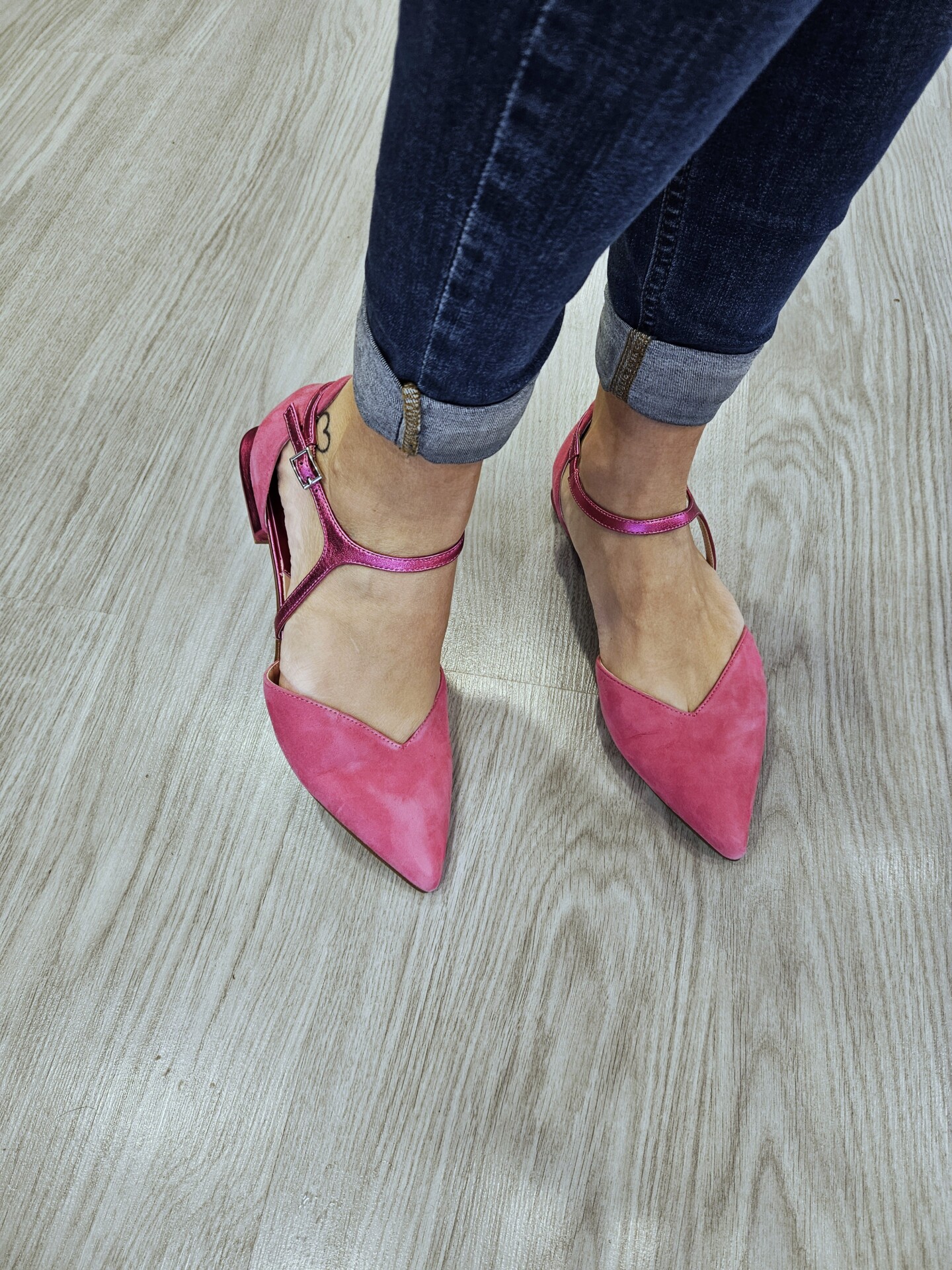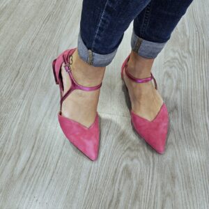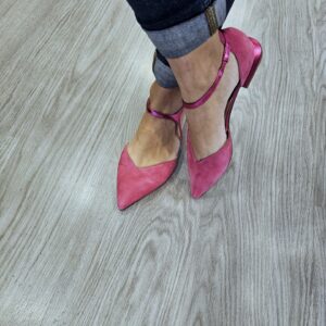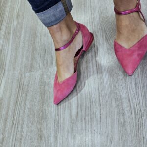 Ballerine in pelle scamosciata con laccio alla caviglia di forma asimettrica in effetto laminato. tacco fasciato in pelle laminata alto 15mm.
