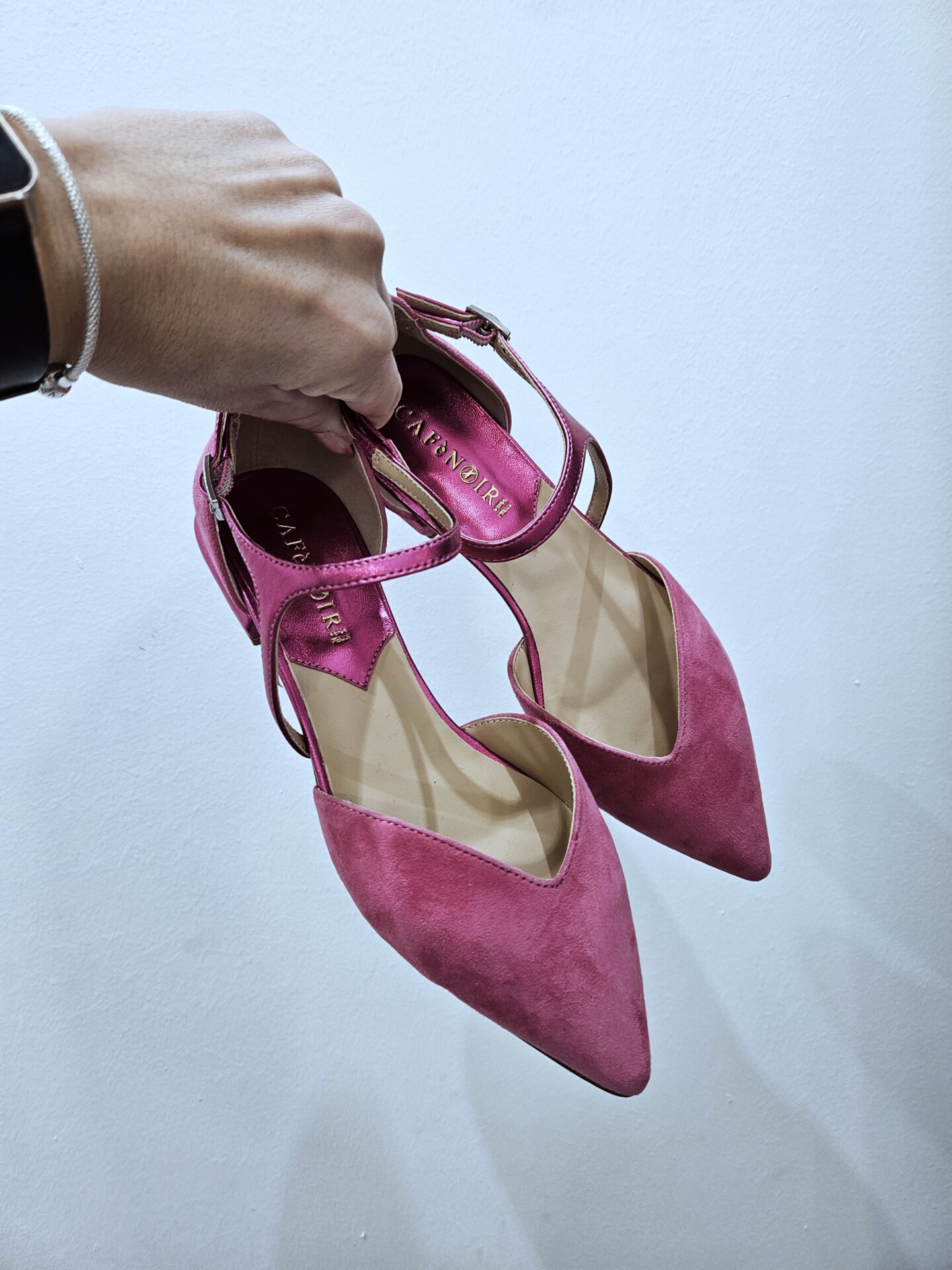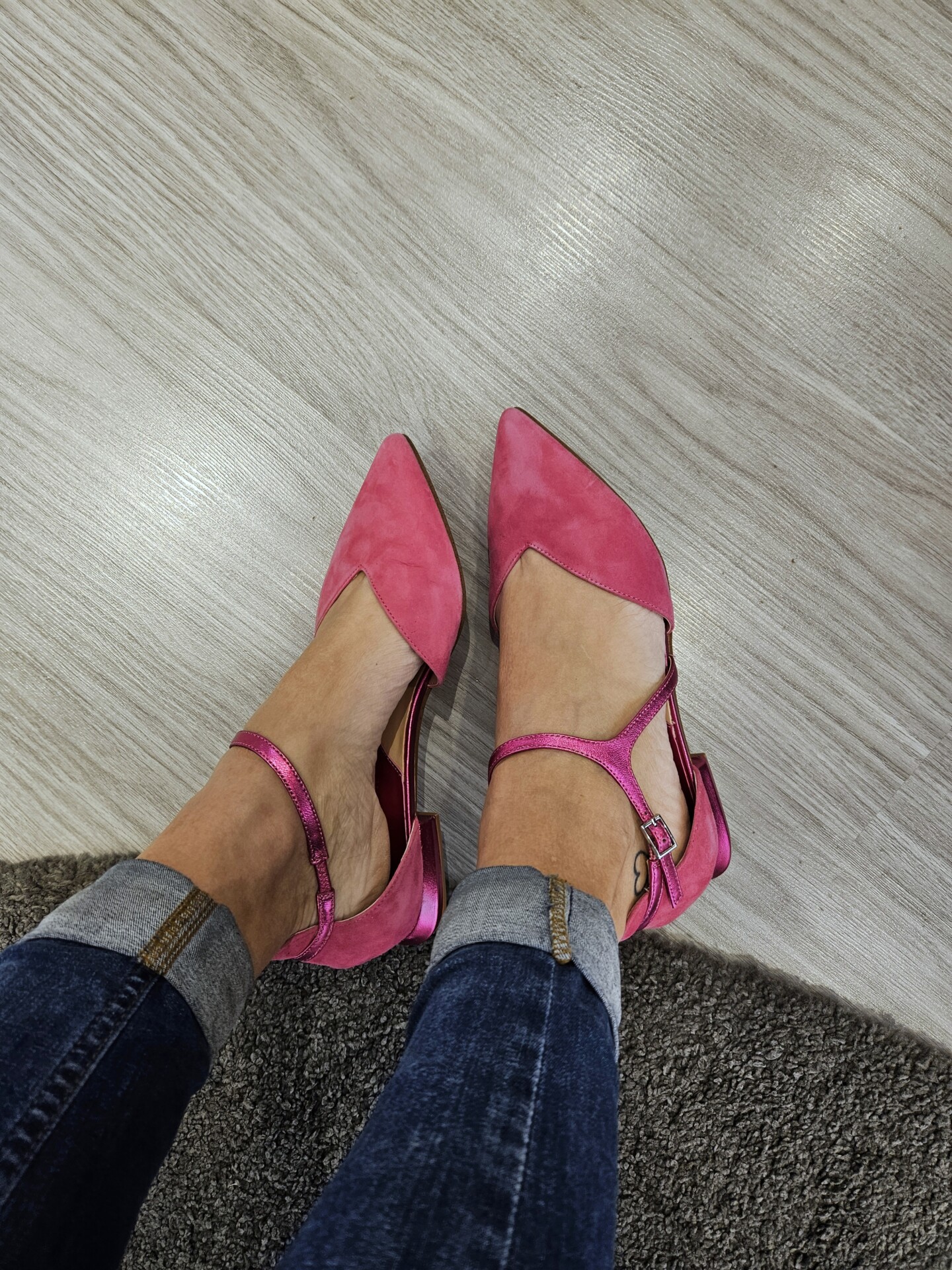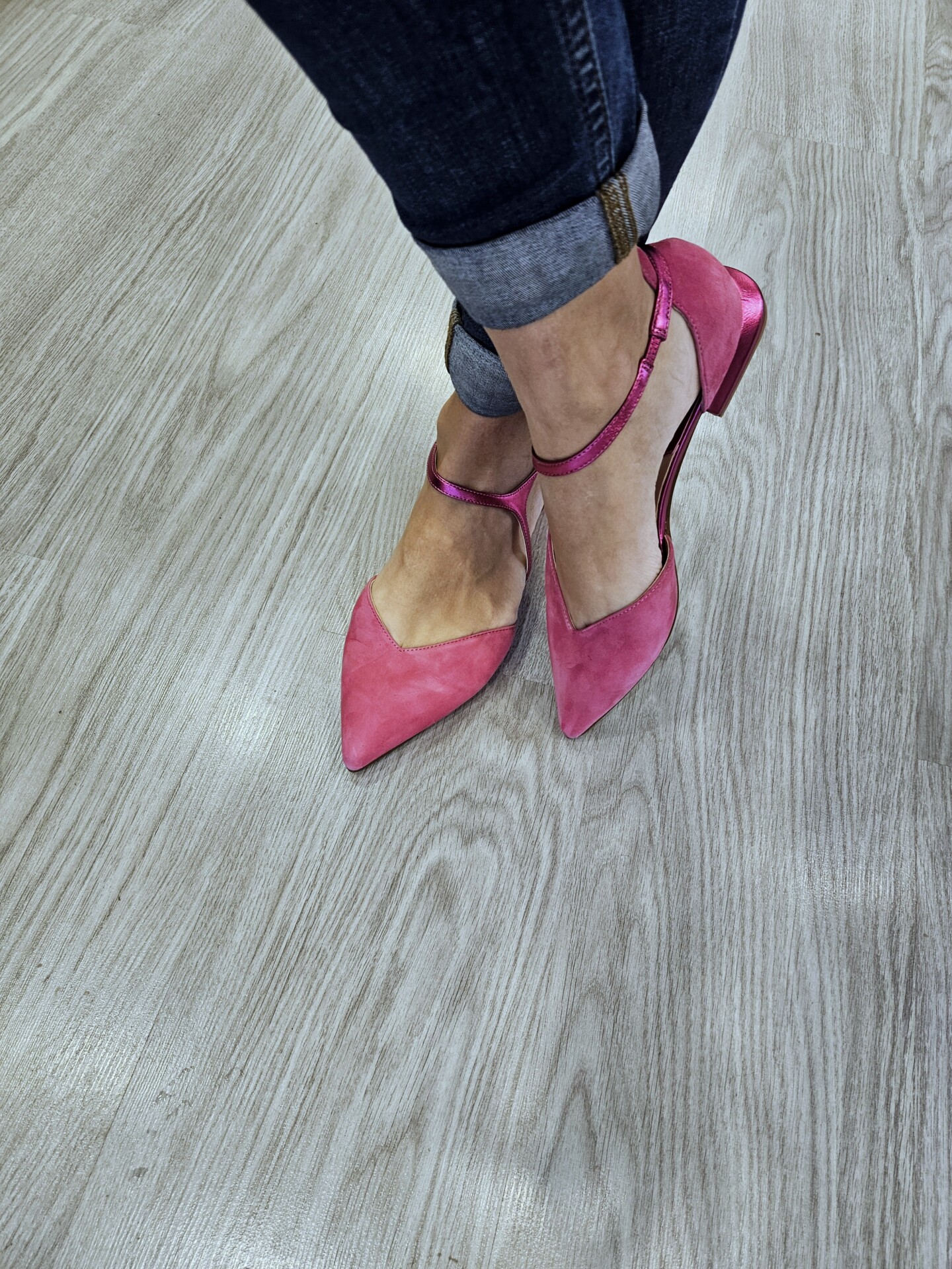 Ballerine in pelle scamosciata con laccio alla caviglia di forma asimettrica in effetto laminato. tacco fasciato in pelle laminata alto 15mm.