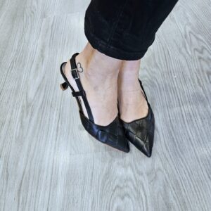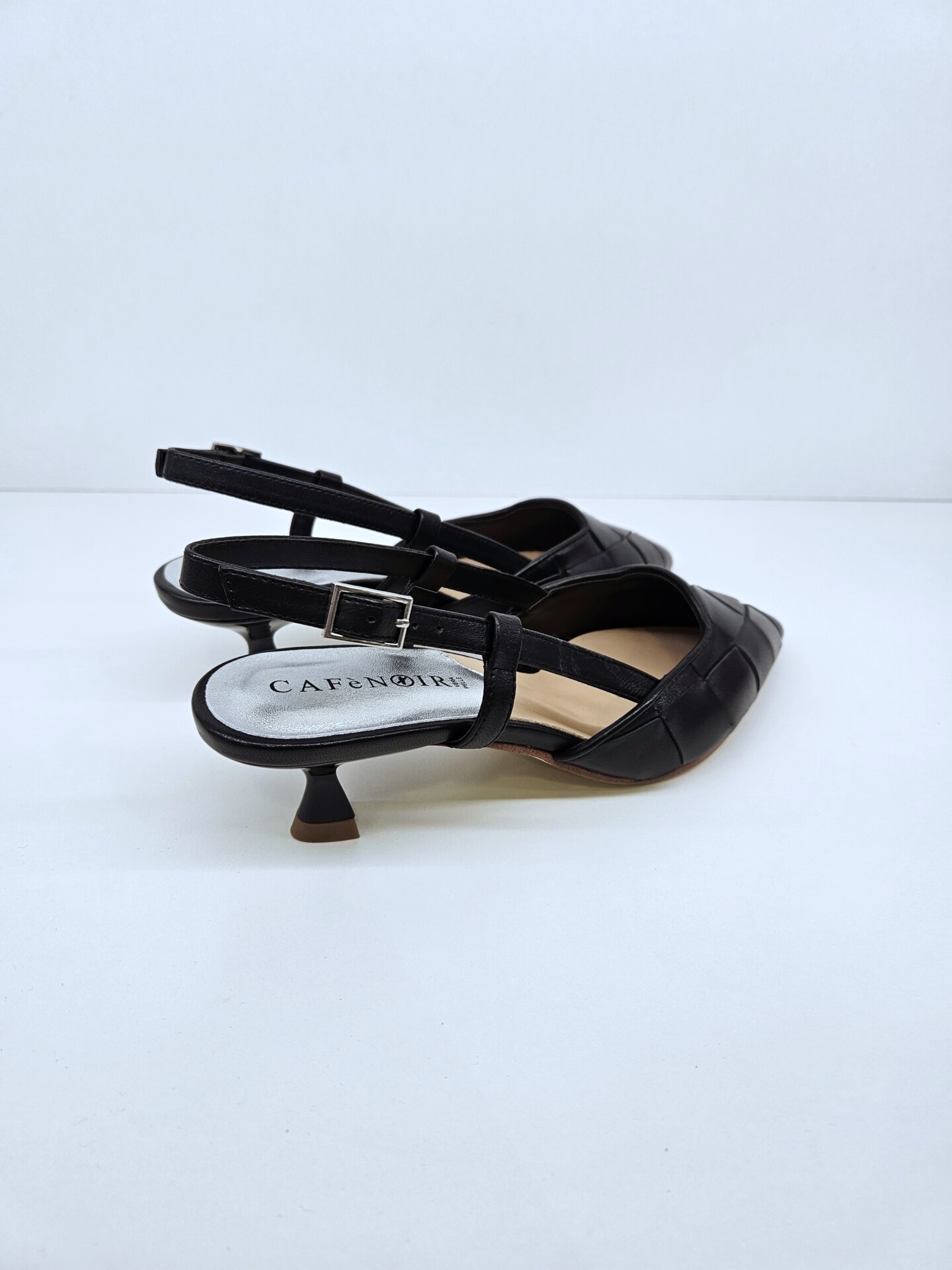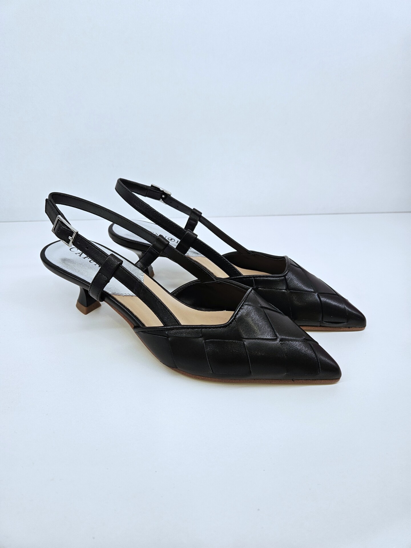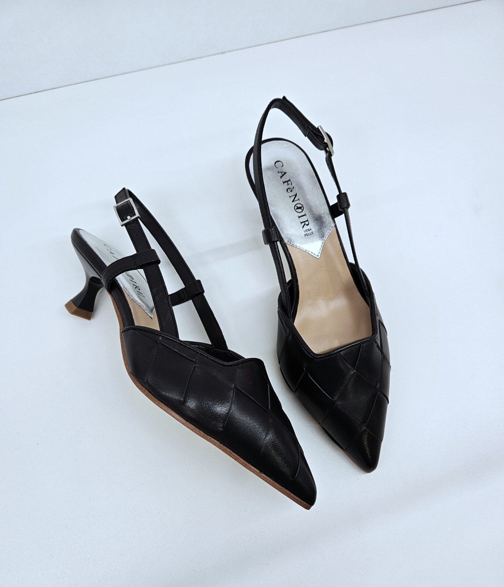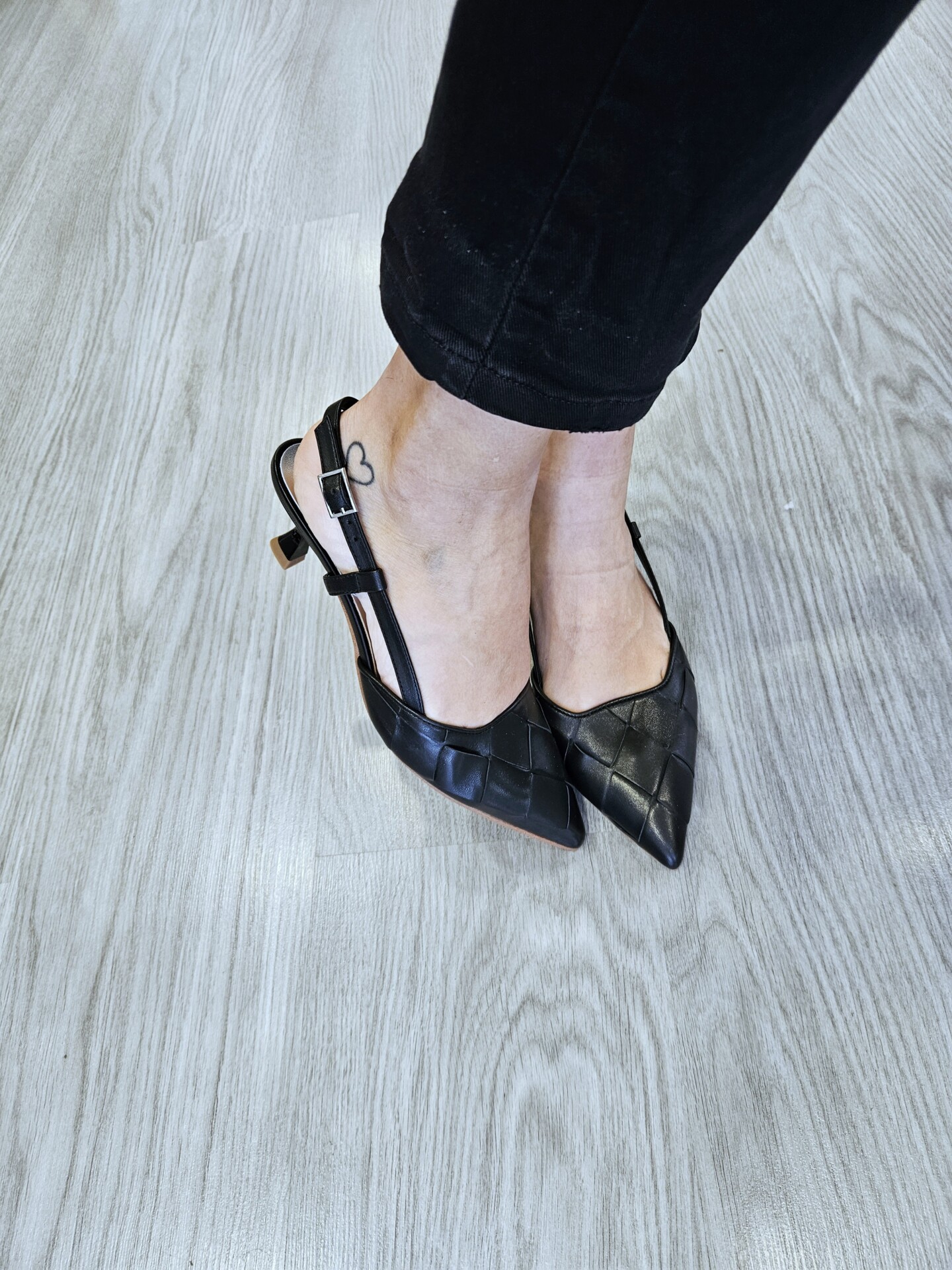 Elegante décolleté in pelle intrecciata con cinturino sul retro. forma sfilata. tacco a rocchetto alto 45mm. calzatura alla moda ma indossabile anche nel quotidiano per soddisfare le esigenze di uno stile di vita dinamico.