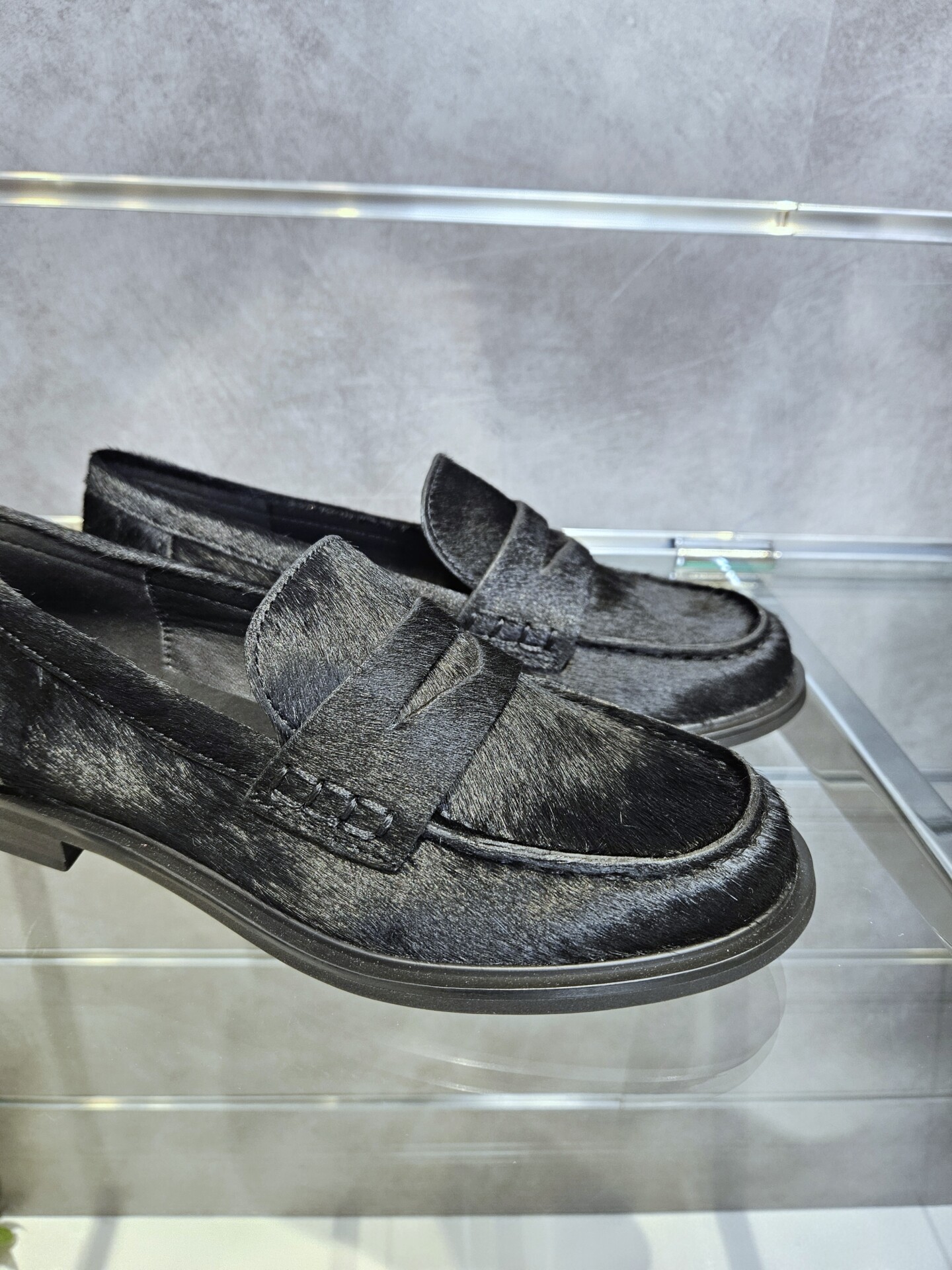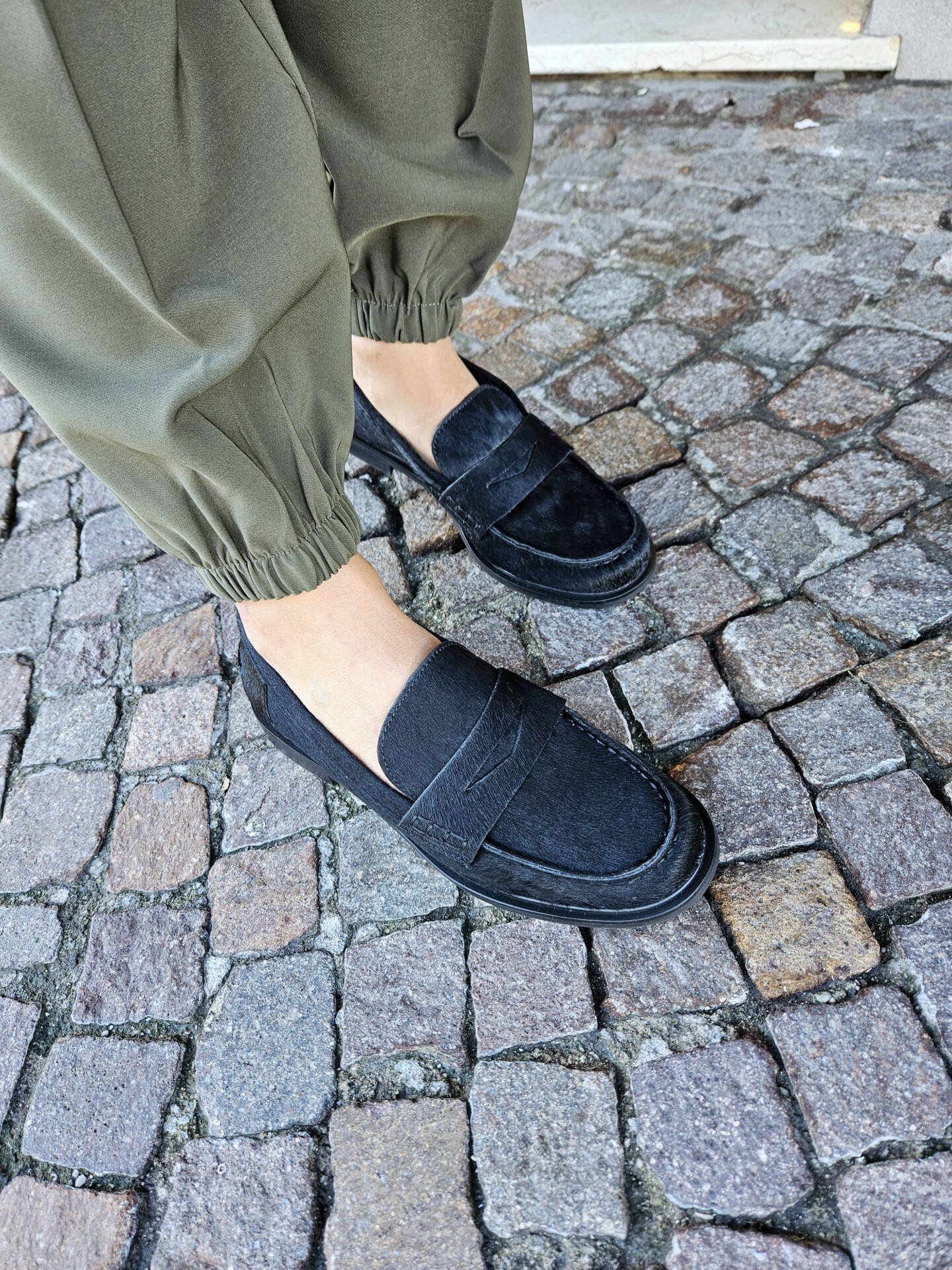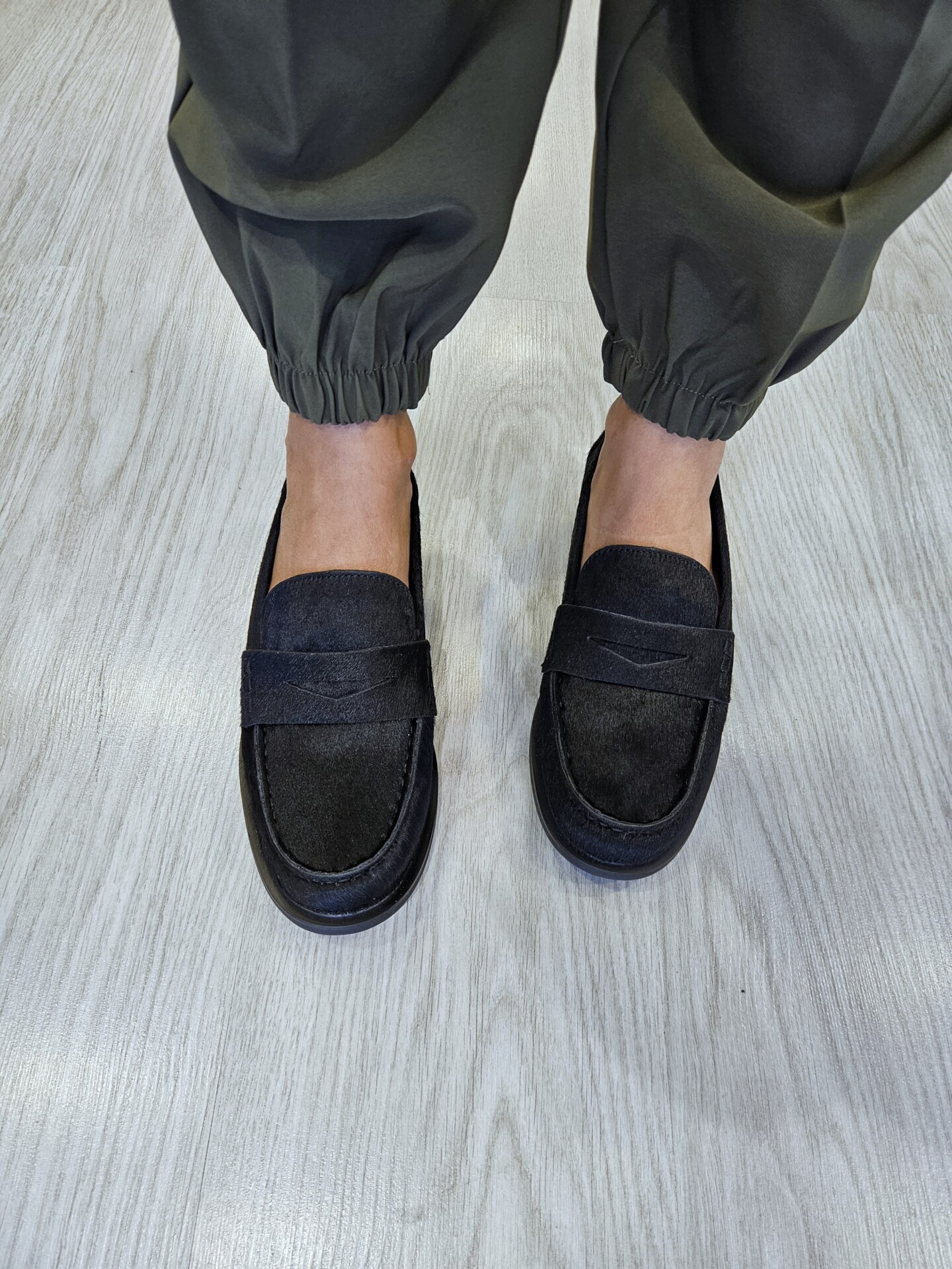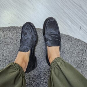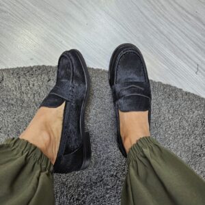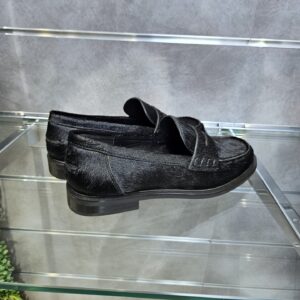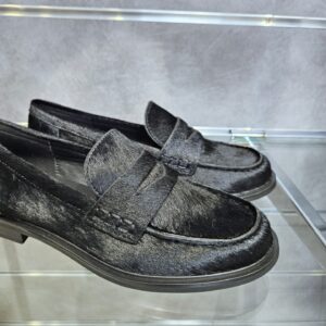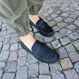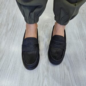 Mocassini da donna in pelle effetto cavallino nero e passante sul collo piede. sottopiede in pelle tacco basso da 2 cm. grinta e stile per ogni look.