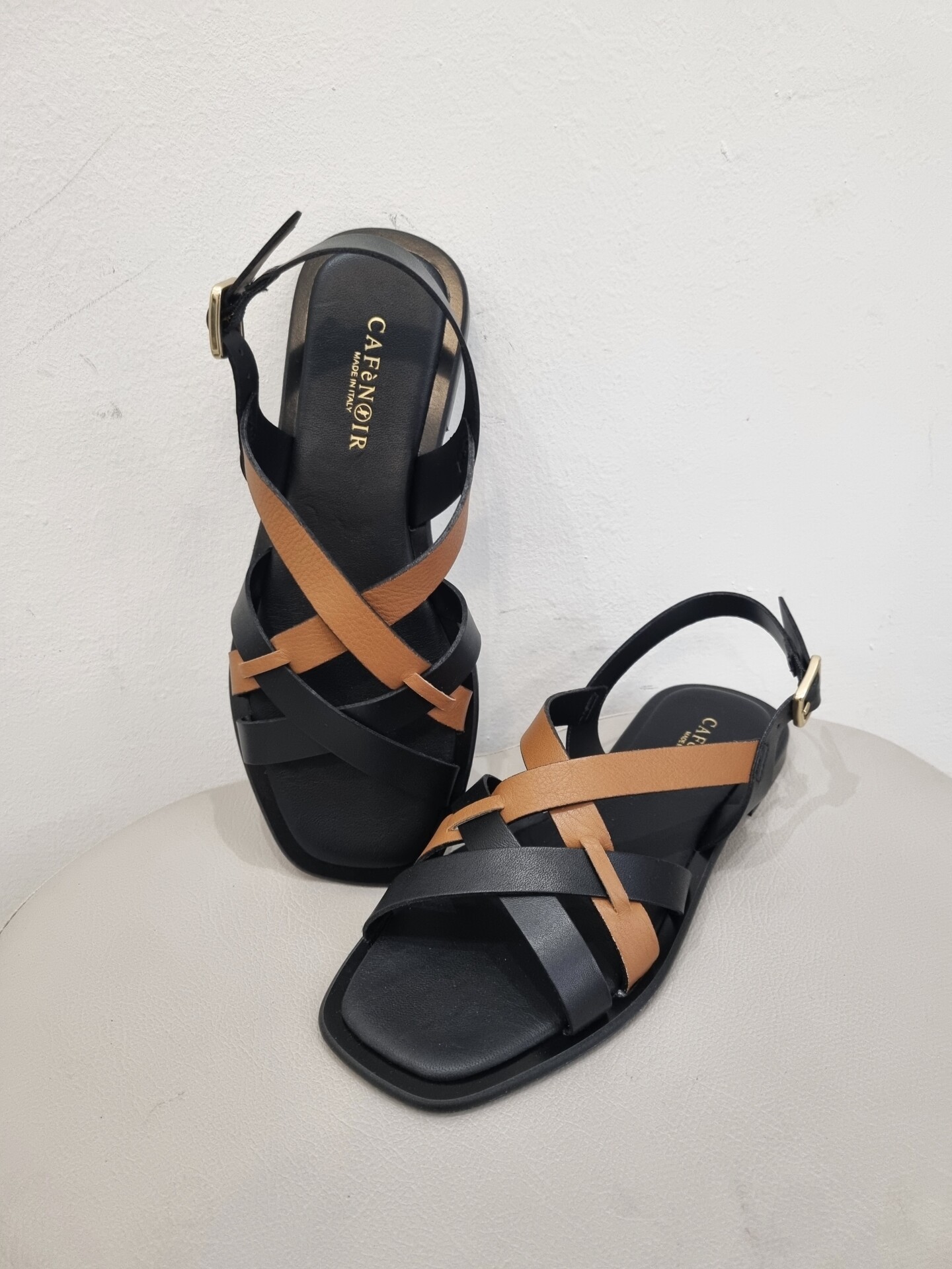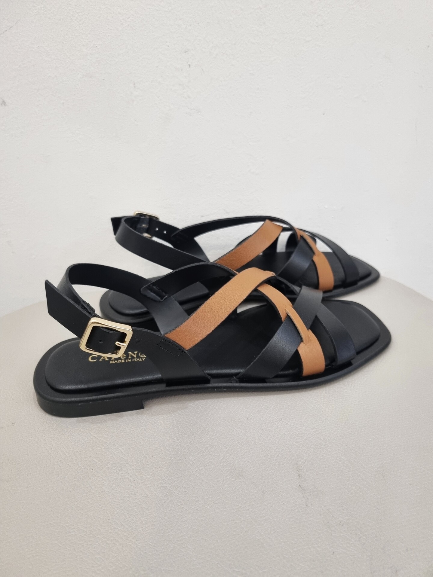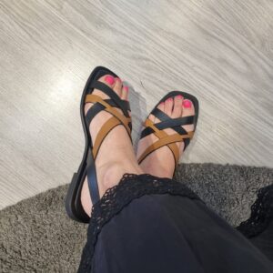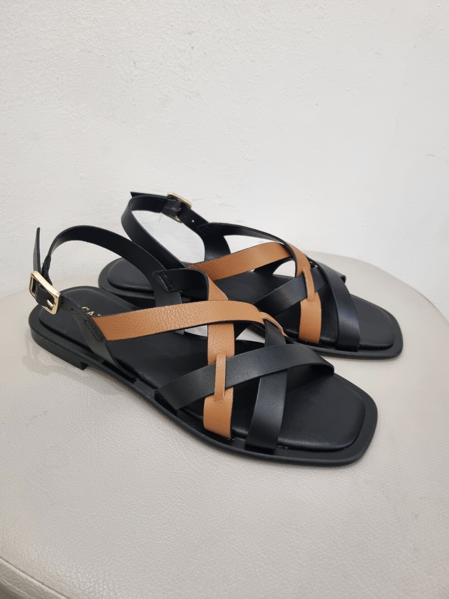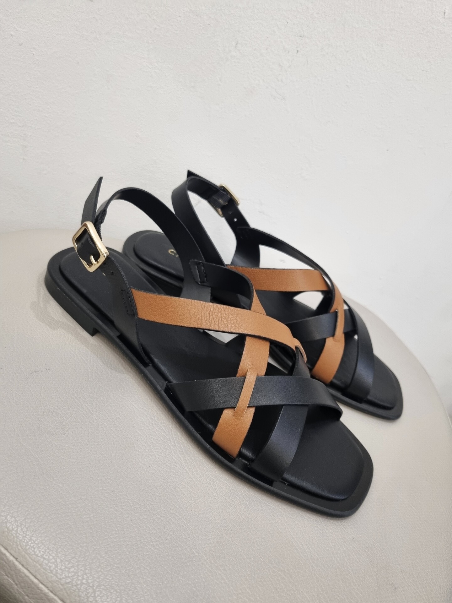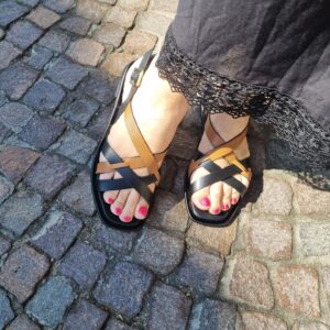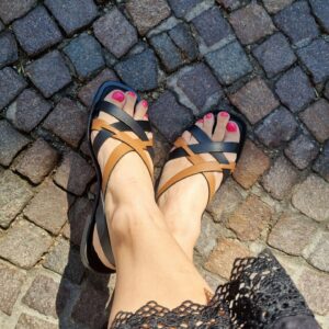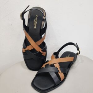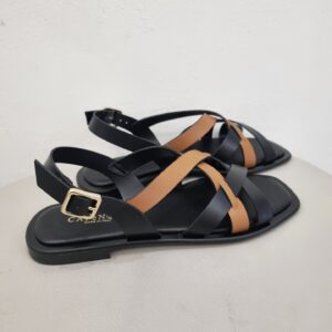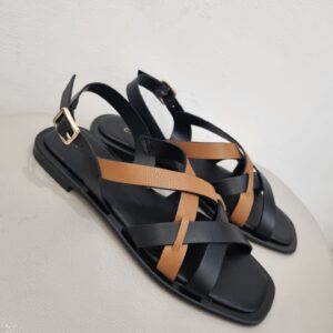 Sandali bassi con gabbia asimmetrica bicolor in pelle che decora il collo del piede.