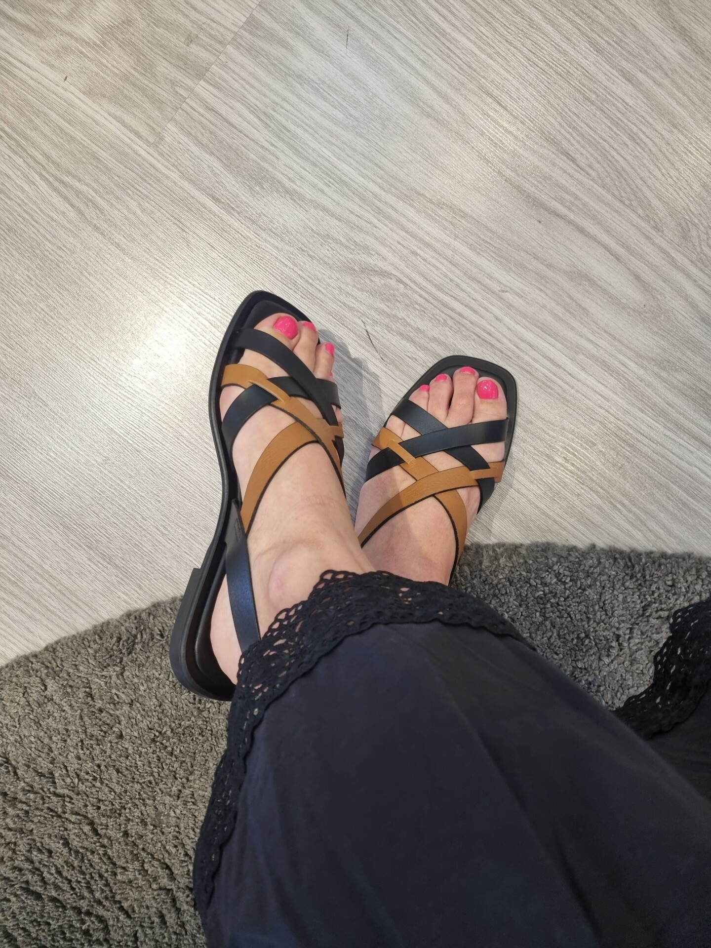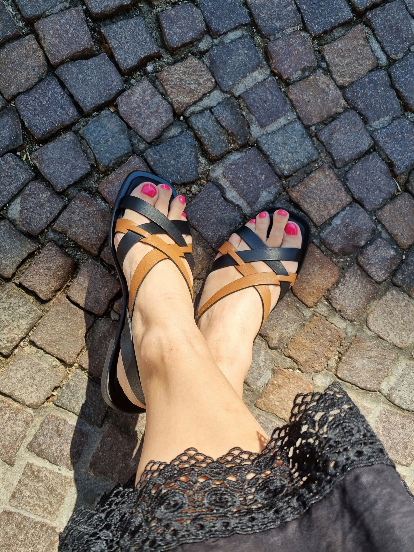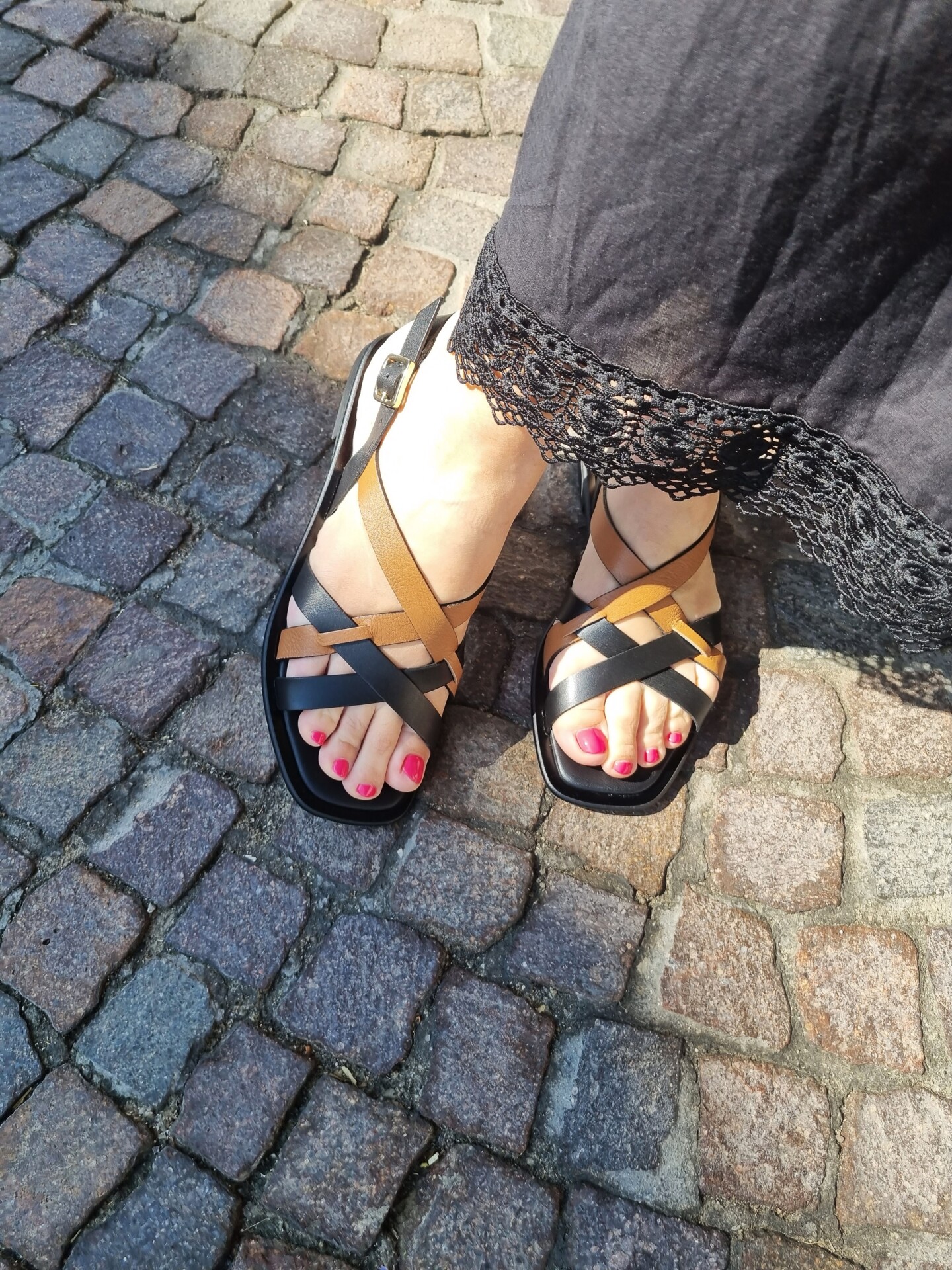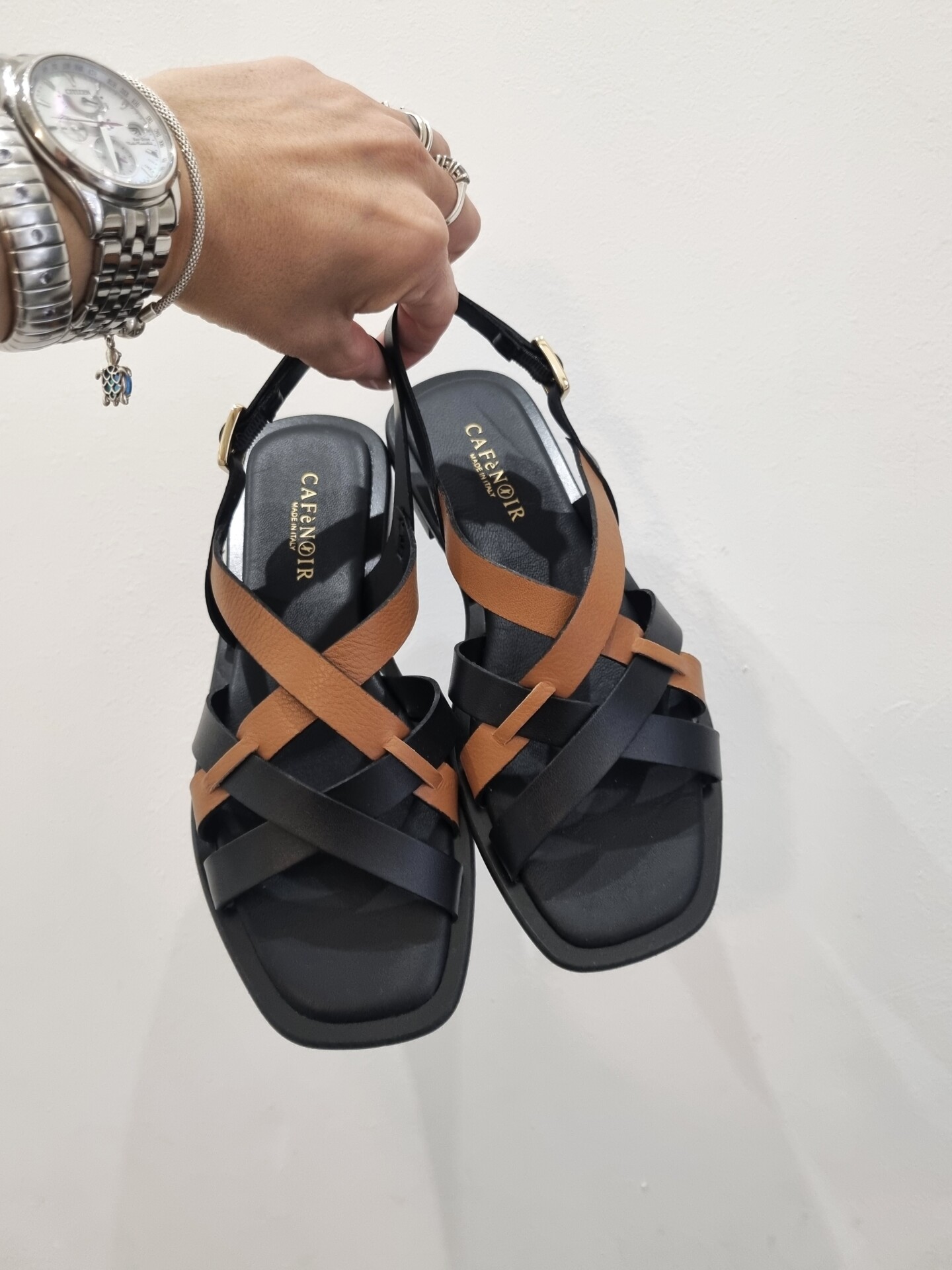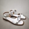Sandali bassi con gabbia asimmetrica bicolor in pelle che decora il collo del piede.