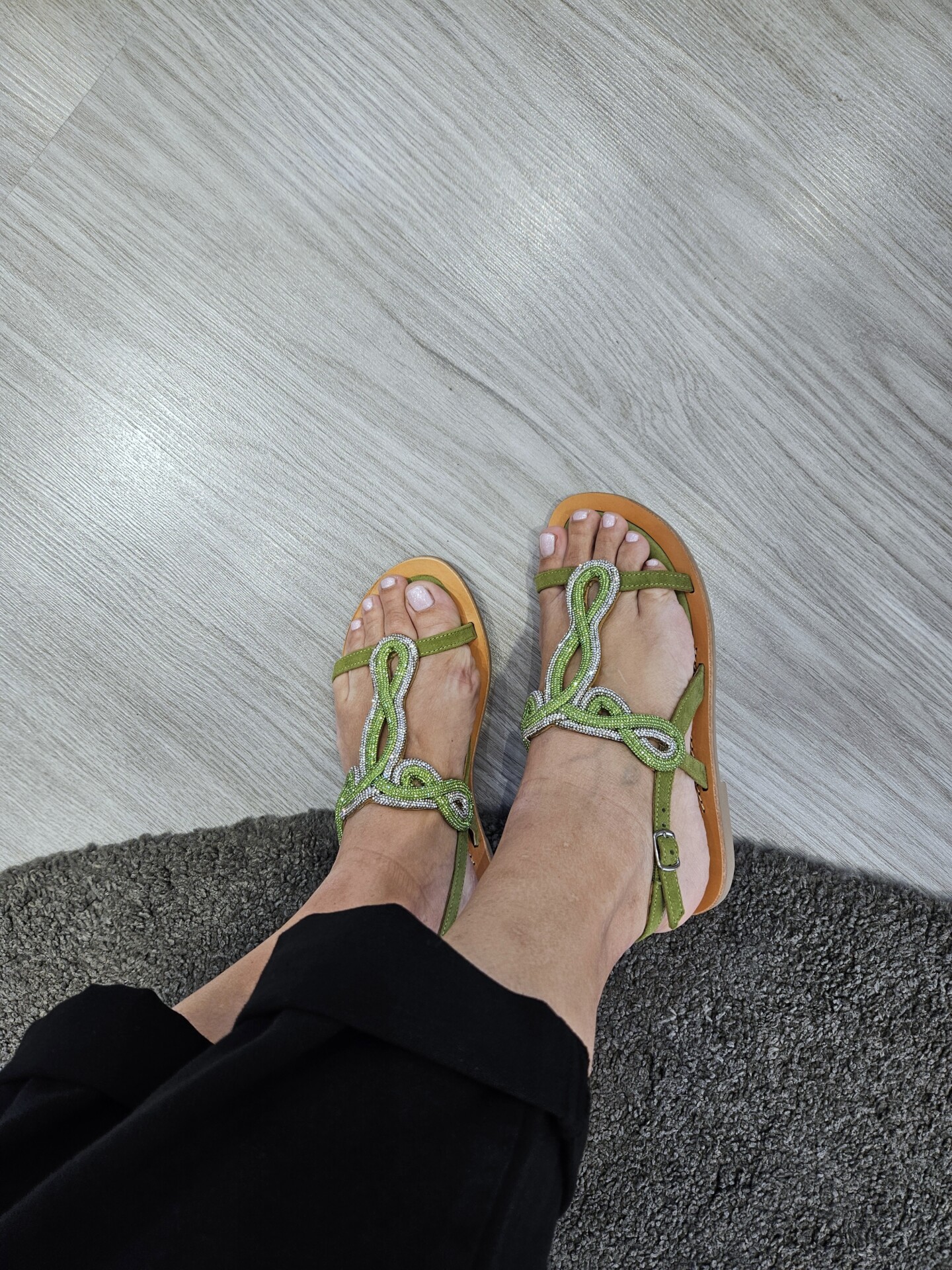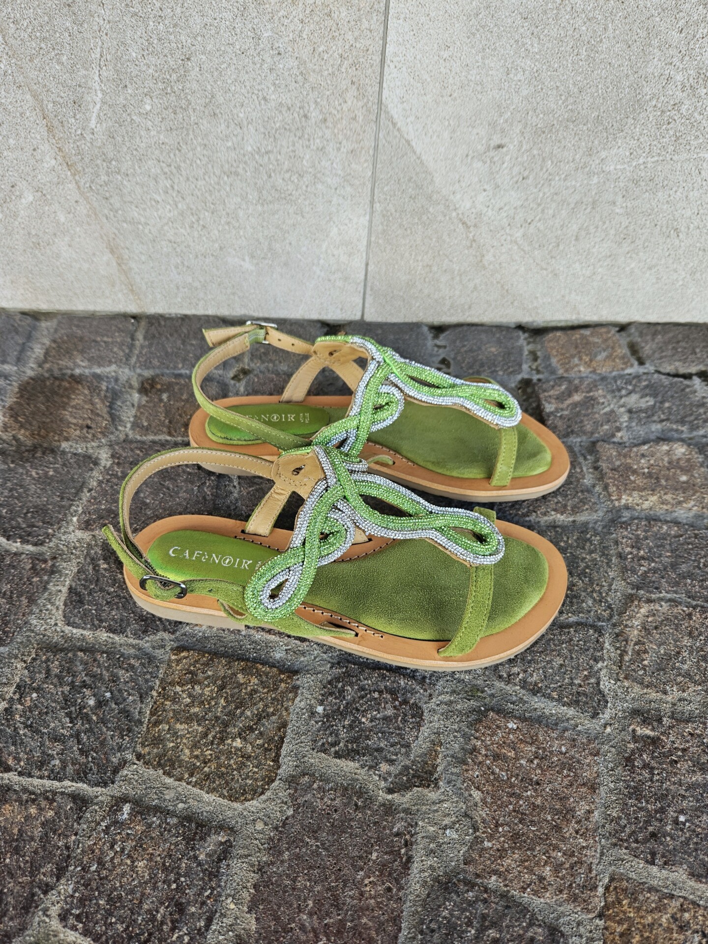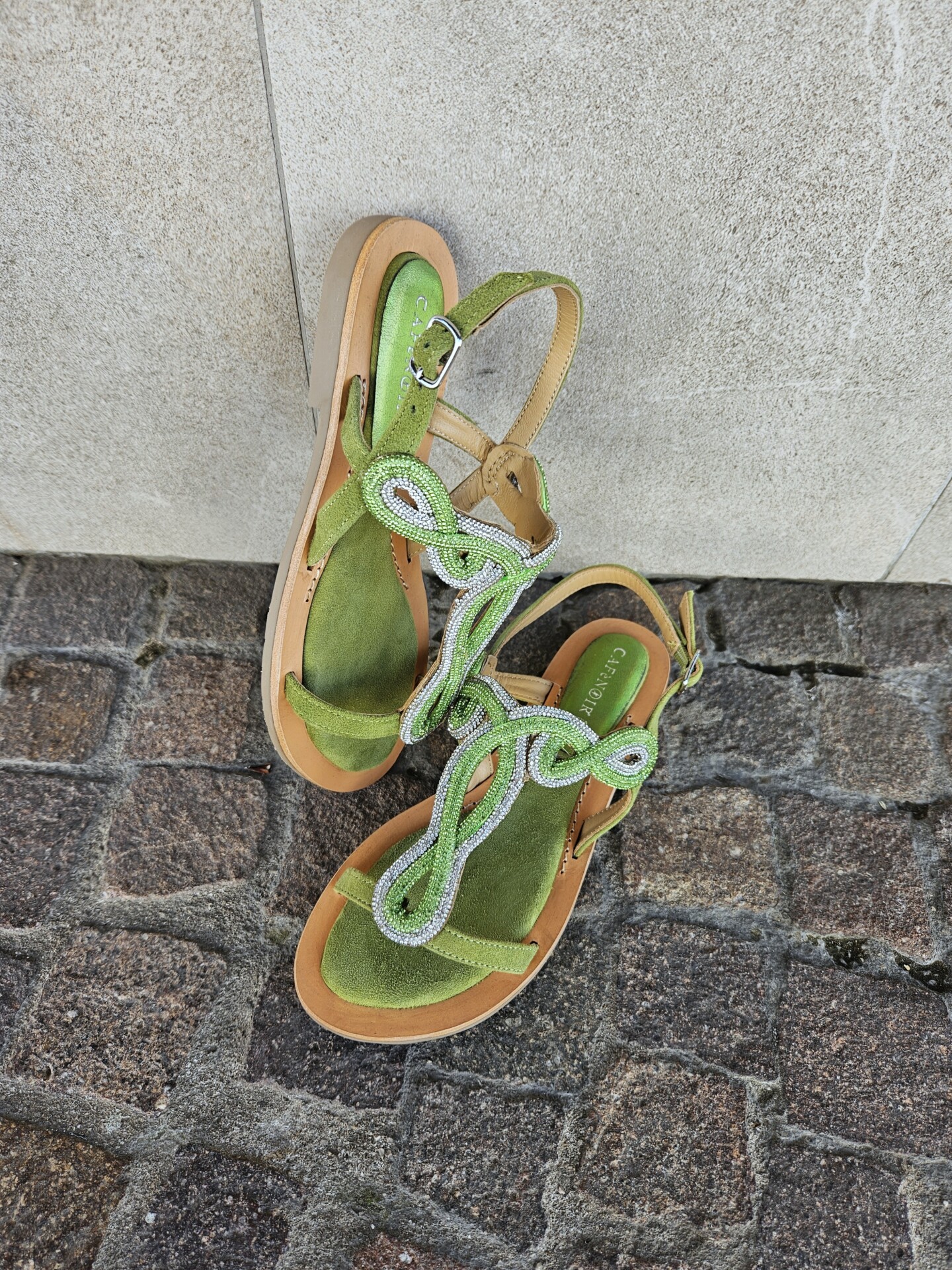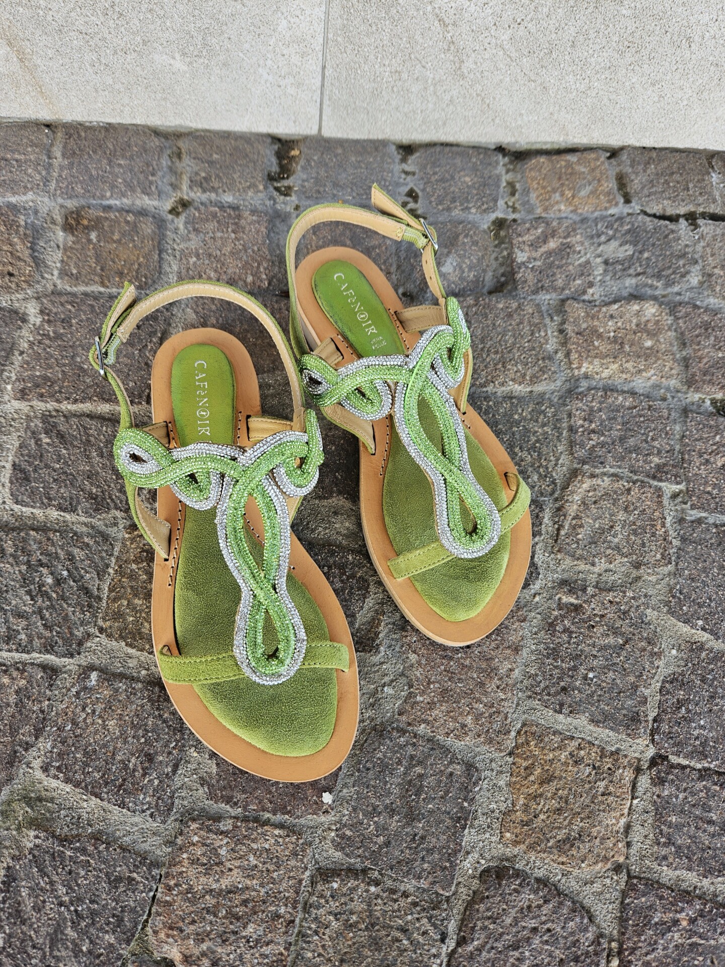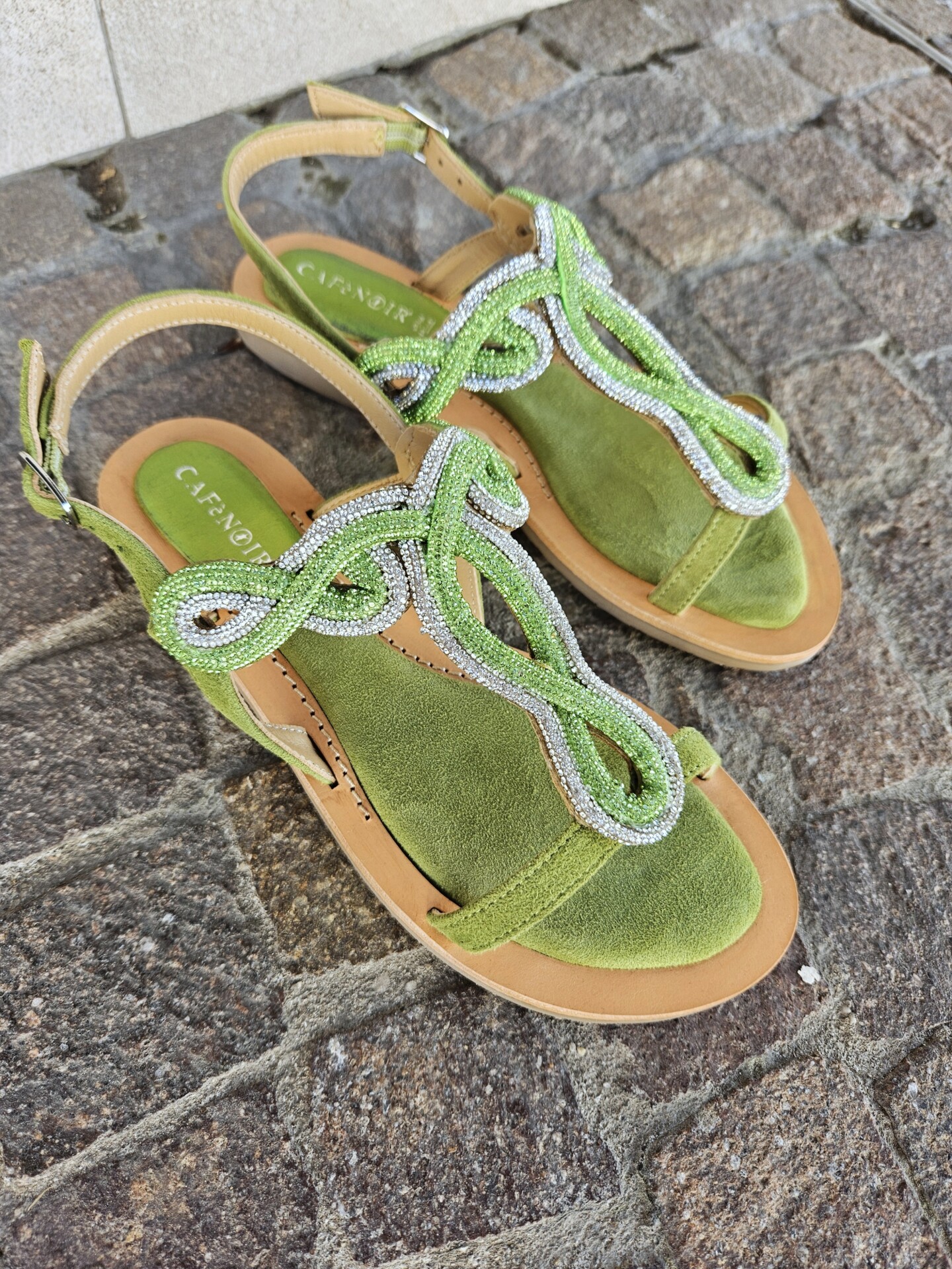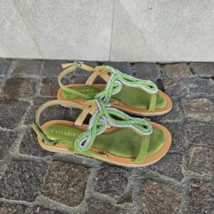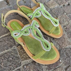Sandali infradito in camoscio con accessorio strass. comodo soletto imbottito per una calzata morbida. tacco alto 15mm. calzatura perfetta da abbinare a molteplici look.