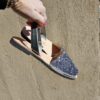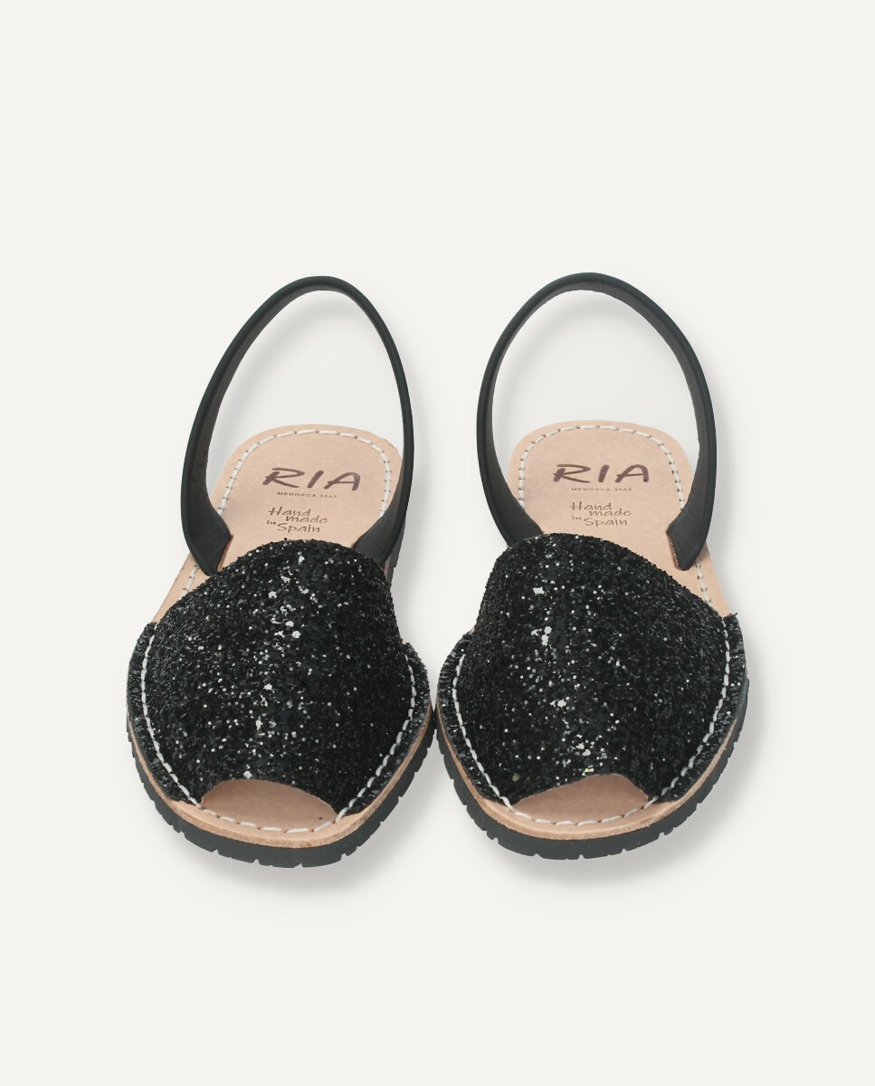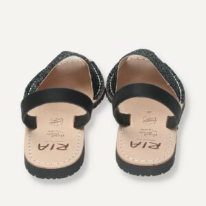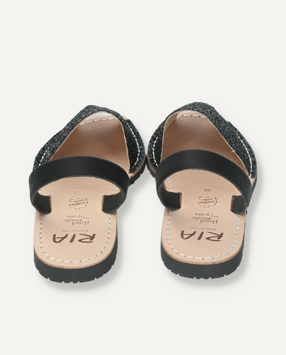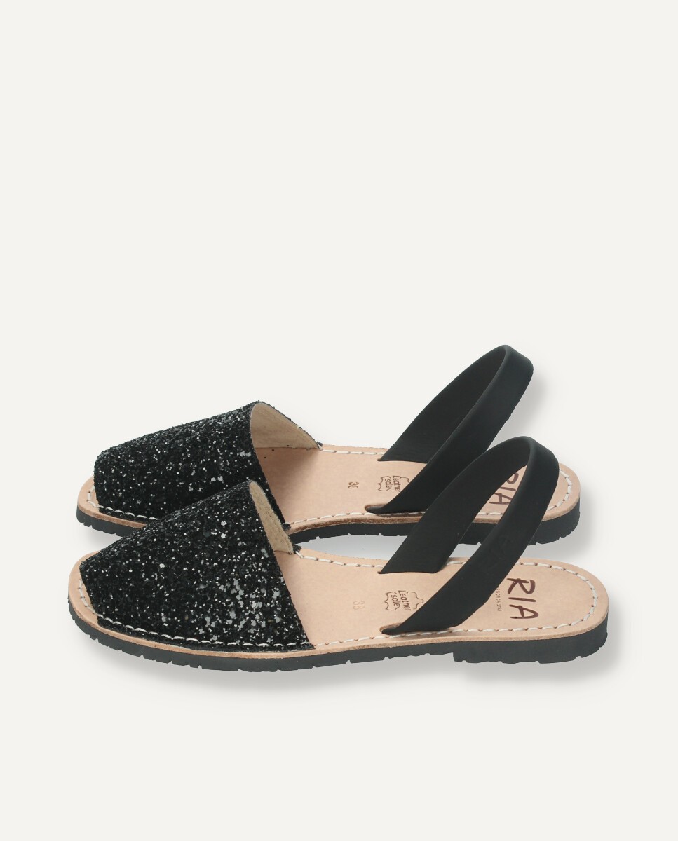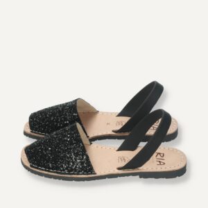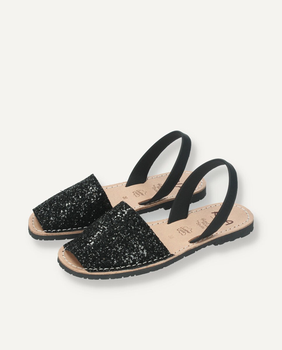 Sandali minorchini con glitter nero sulla tomaia. Una minorchina elegantissima, per il giorno come per la sera.