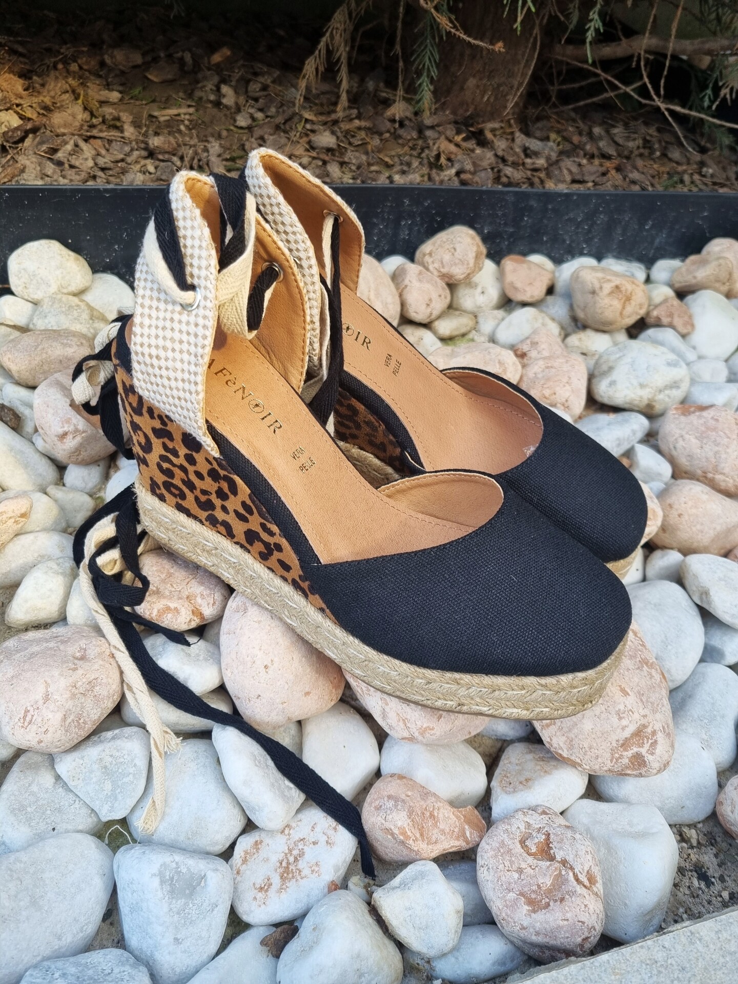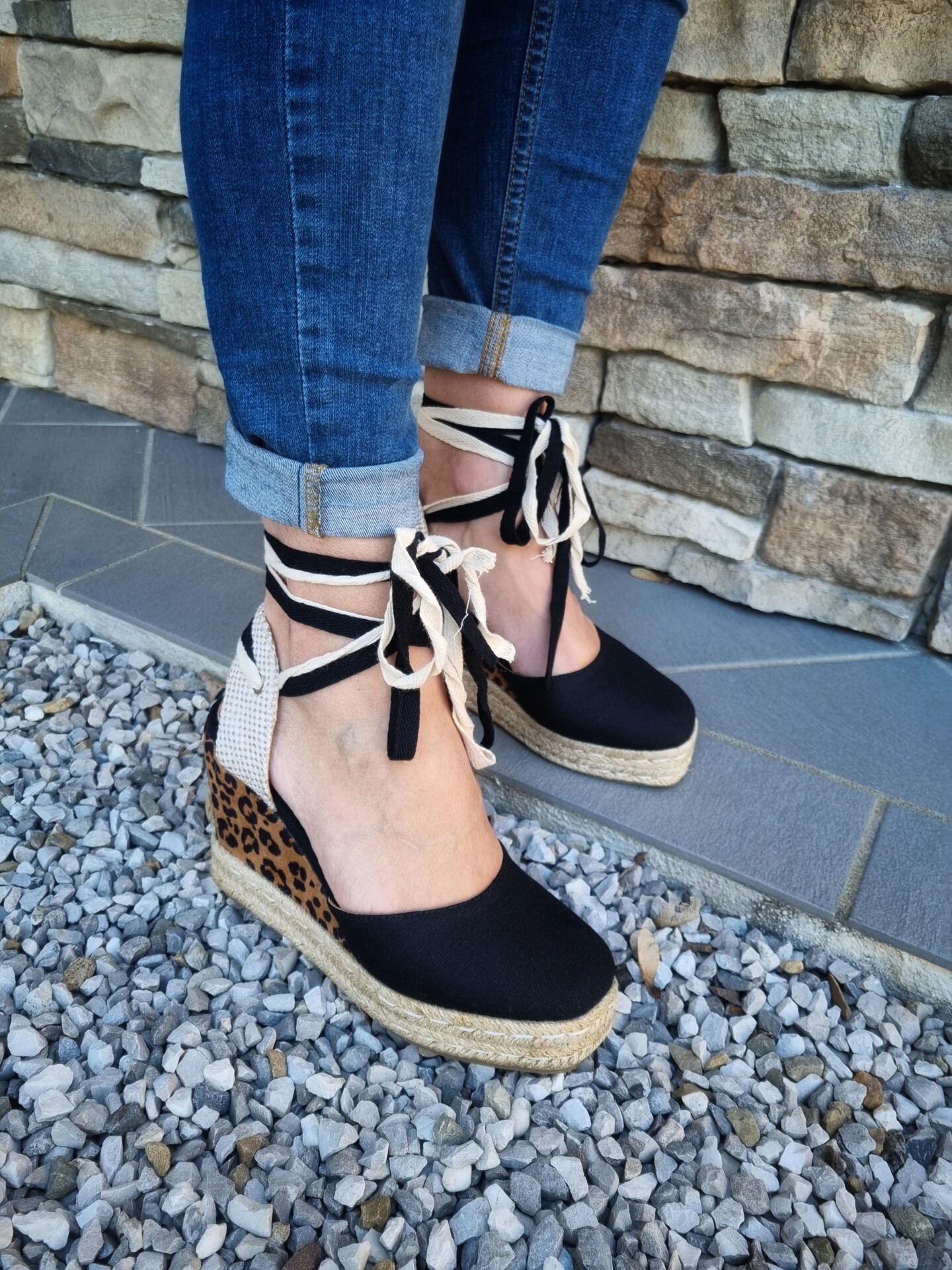 Sandali in cavas con doppio laccio alla schiava e zeppa in corda e tessuto stampa maculato.