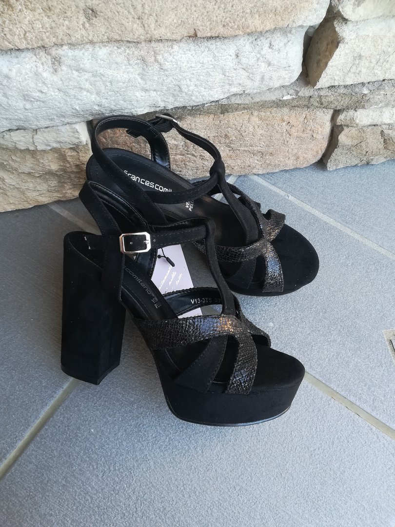 Sandalo con tacco in eco-camoscio con stringhette pitonate nere.