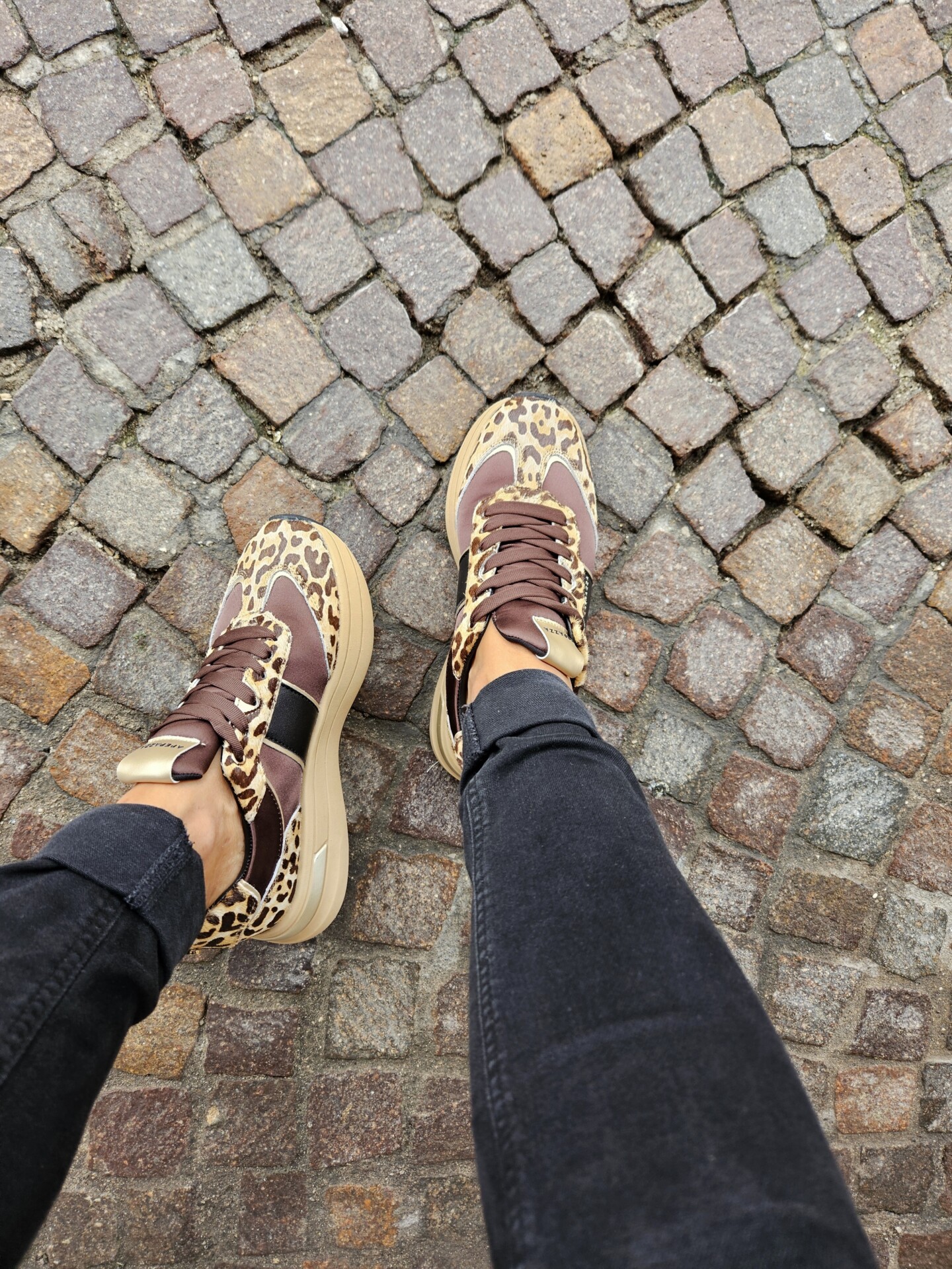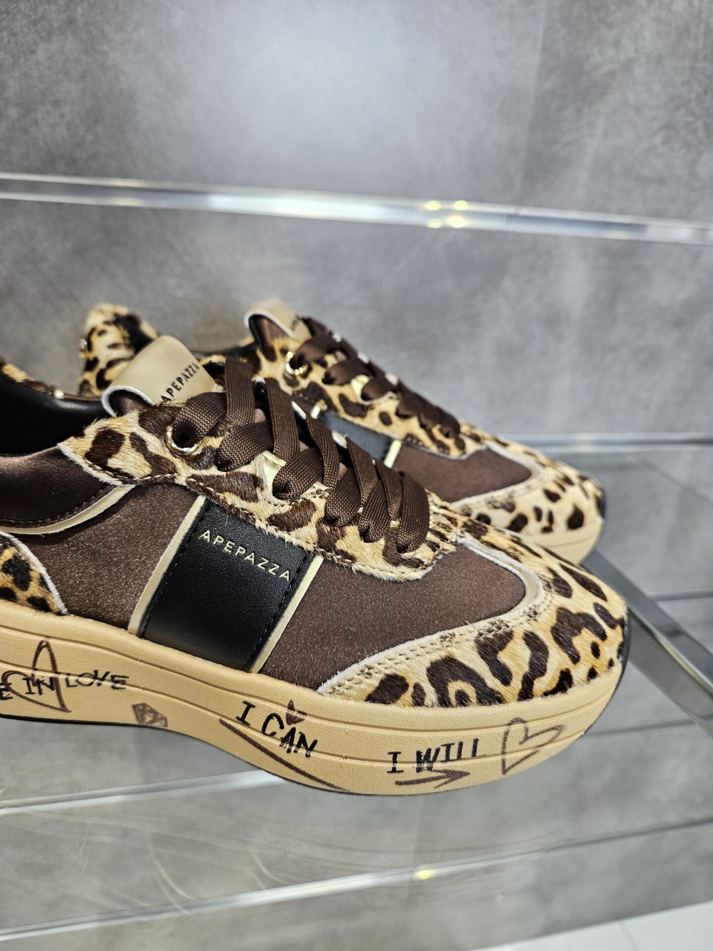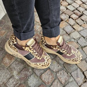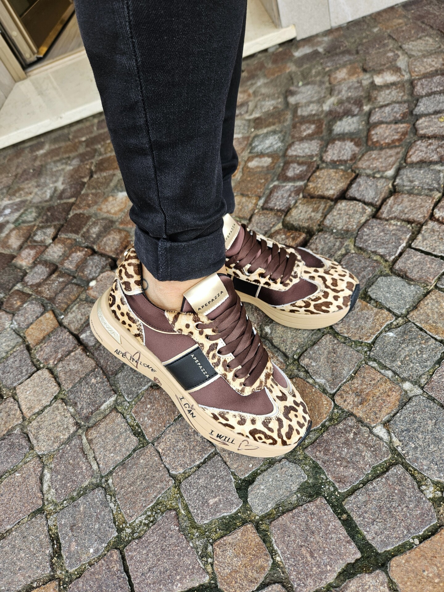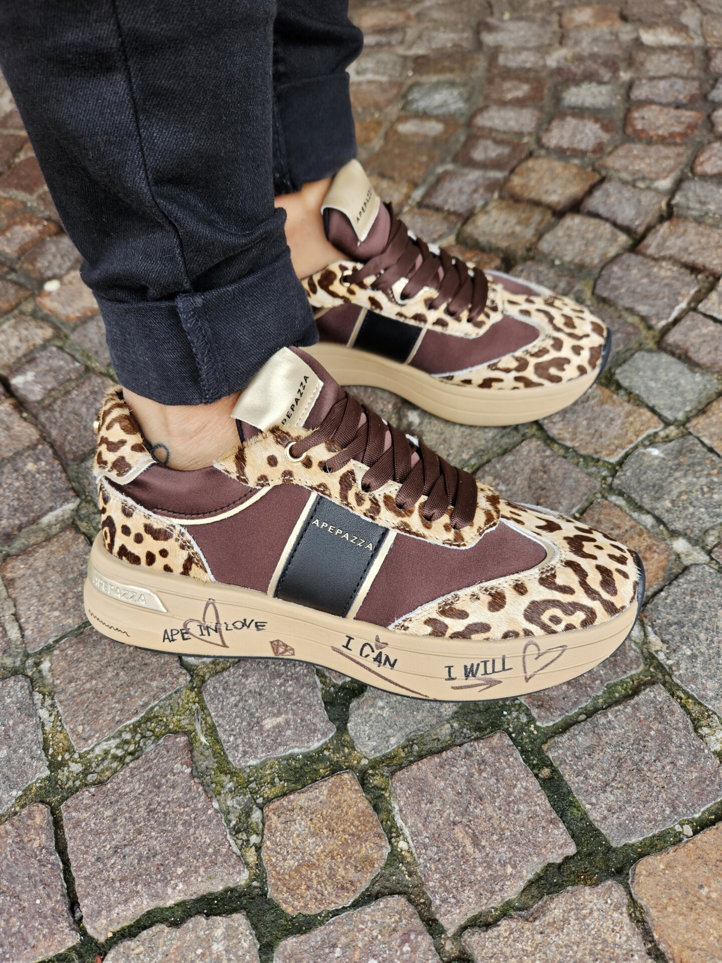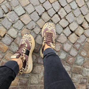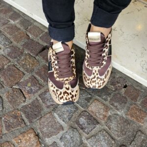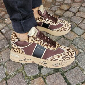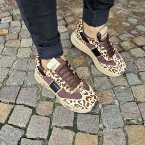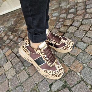 Questa sneaker combina uno stile sportivo e di carattere. La tomaia, in scamosciato marrone e pelle di pony con stampa leopardata, ha un’estetica audace. La suola platform, con un design a strati e scritte a mano, aggiunge un tocco artistico che la rende unica.