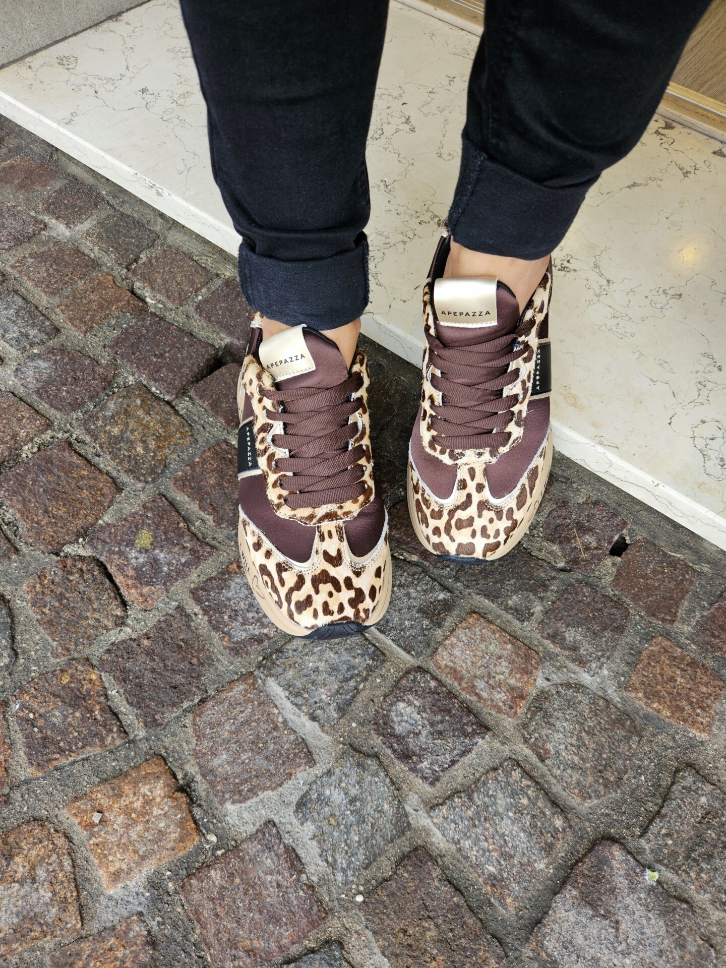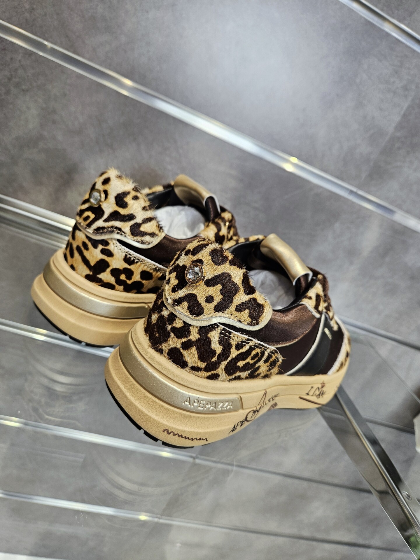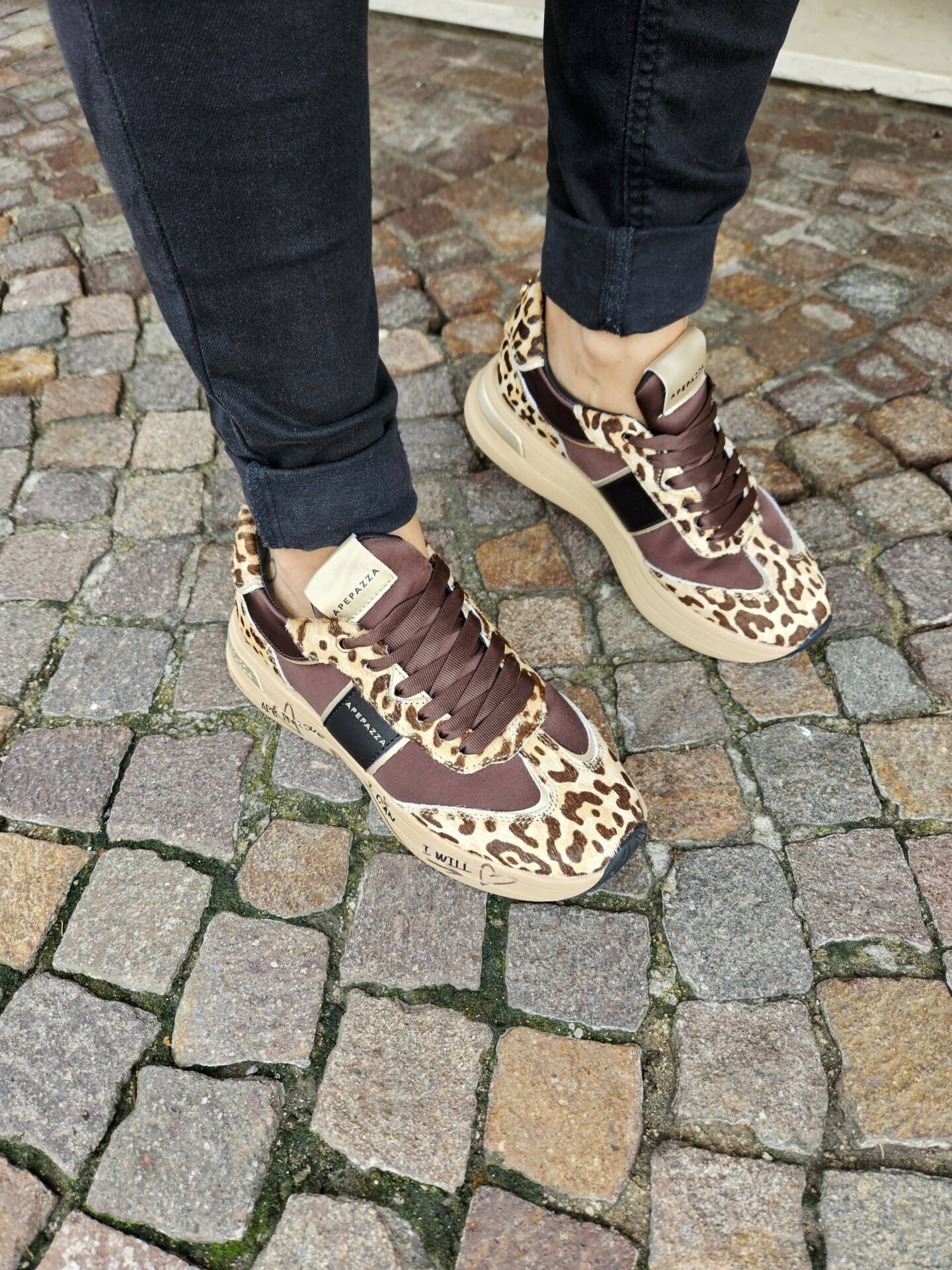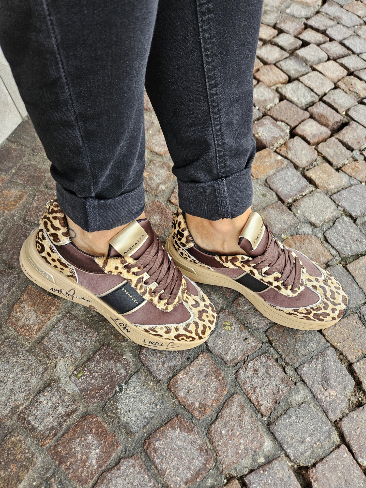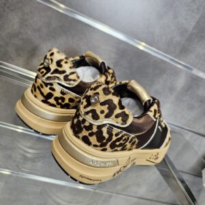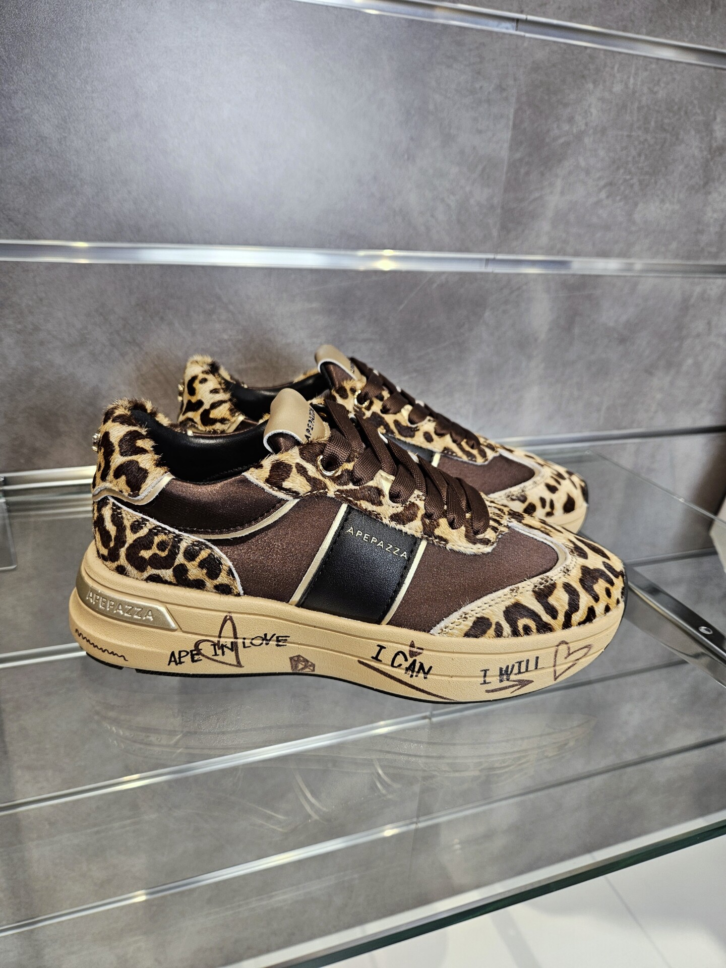 Questa sneaker combina uno stile sportivo e di carattere. La tomaia, in scamosciato marrone e pelle di pony con stampa leopardata, ha un’estetica audace. La suola platform, con un design a strati e scritte a mano, aggiunge un tocco artistico che la rende unica.
