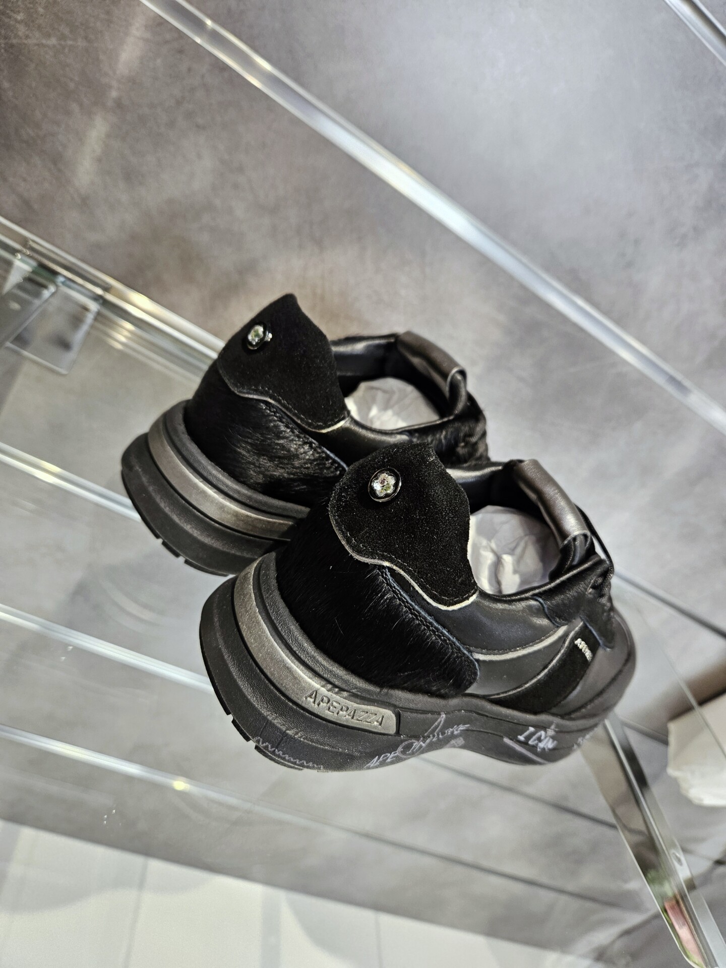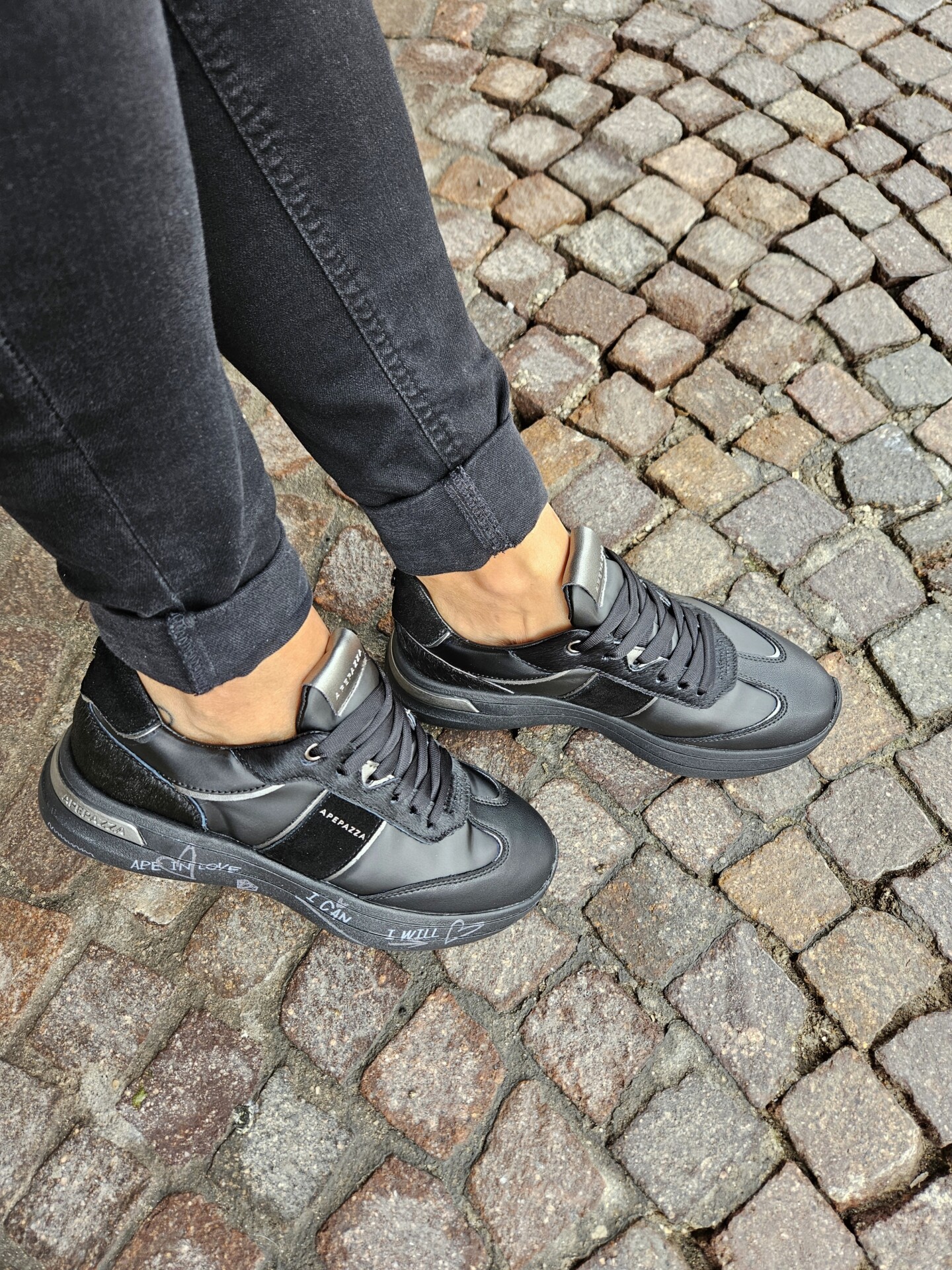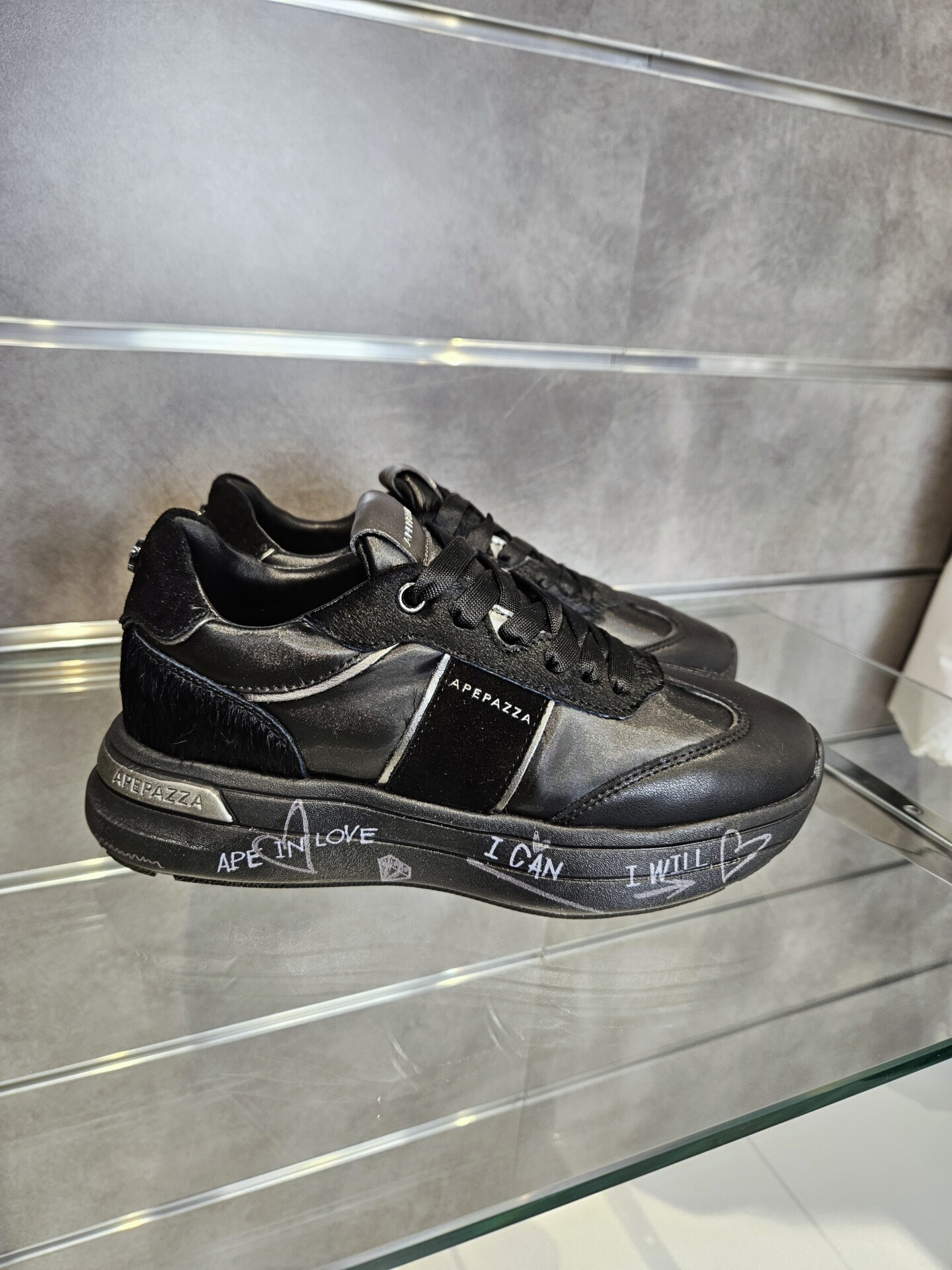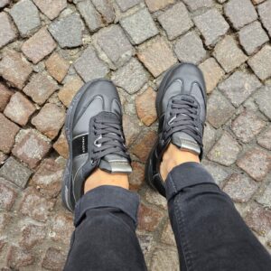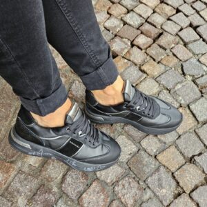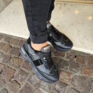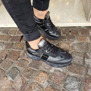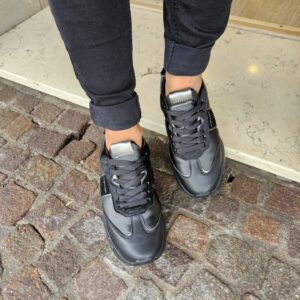 Questa sneaker unisce un look sportivo e di carattere. La tomaia, in pelle nera e pelle pony , è impreziosita da dettagli in argento metallizzato. La suola platform, con scritte a mano, aggiunge un tocco artistico e distintivo.