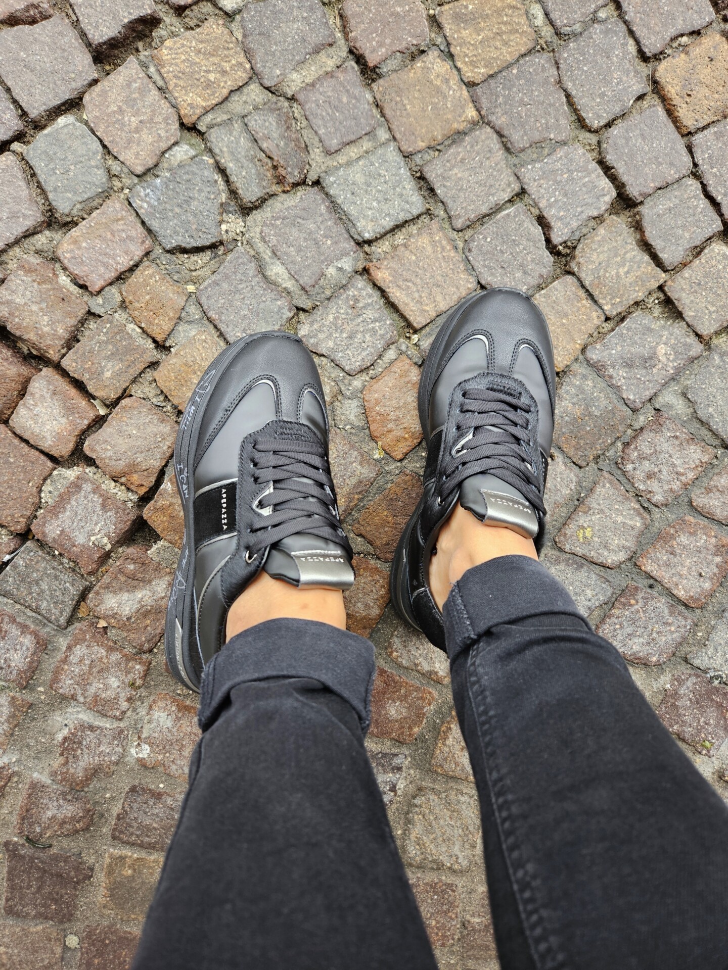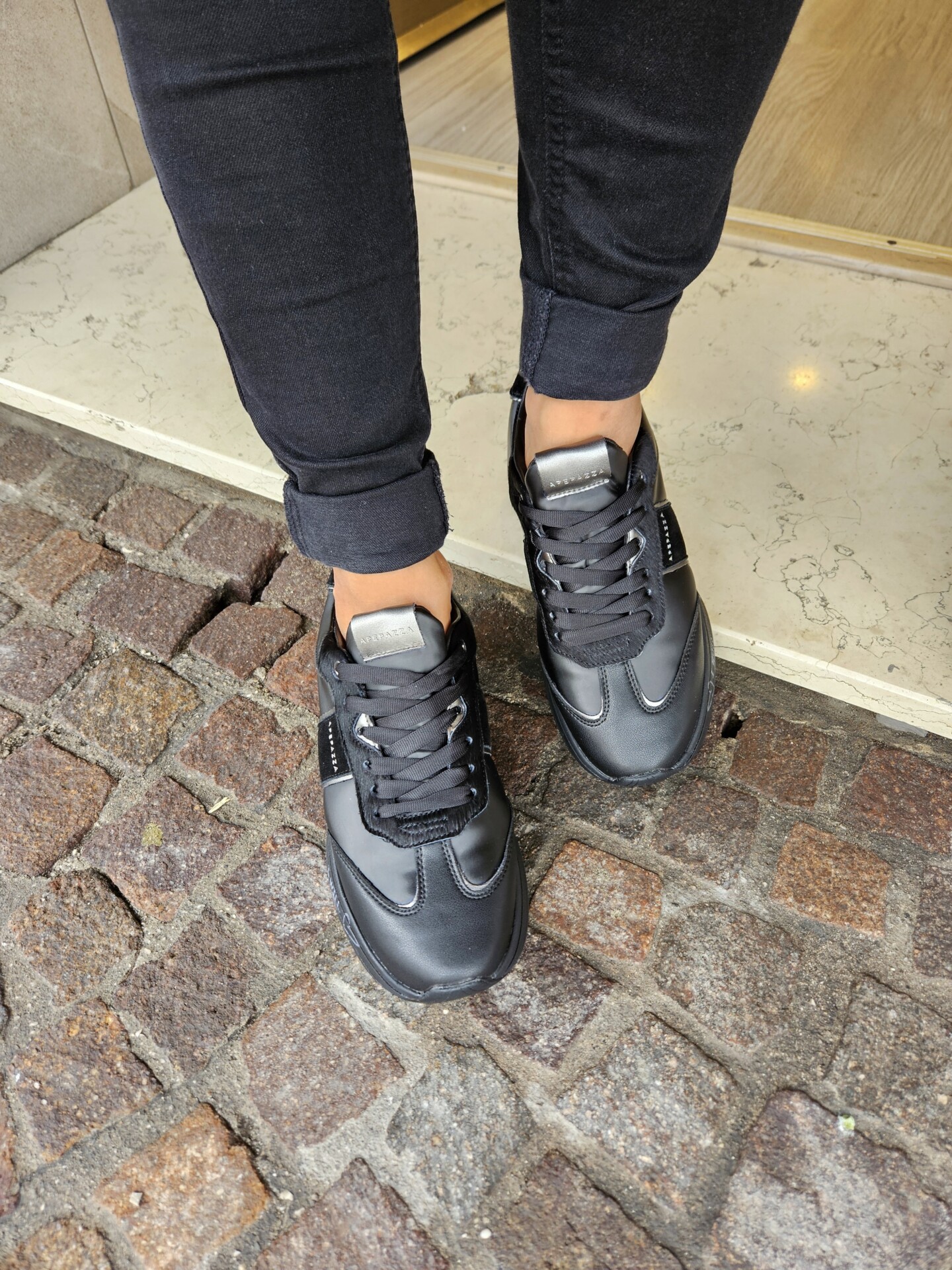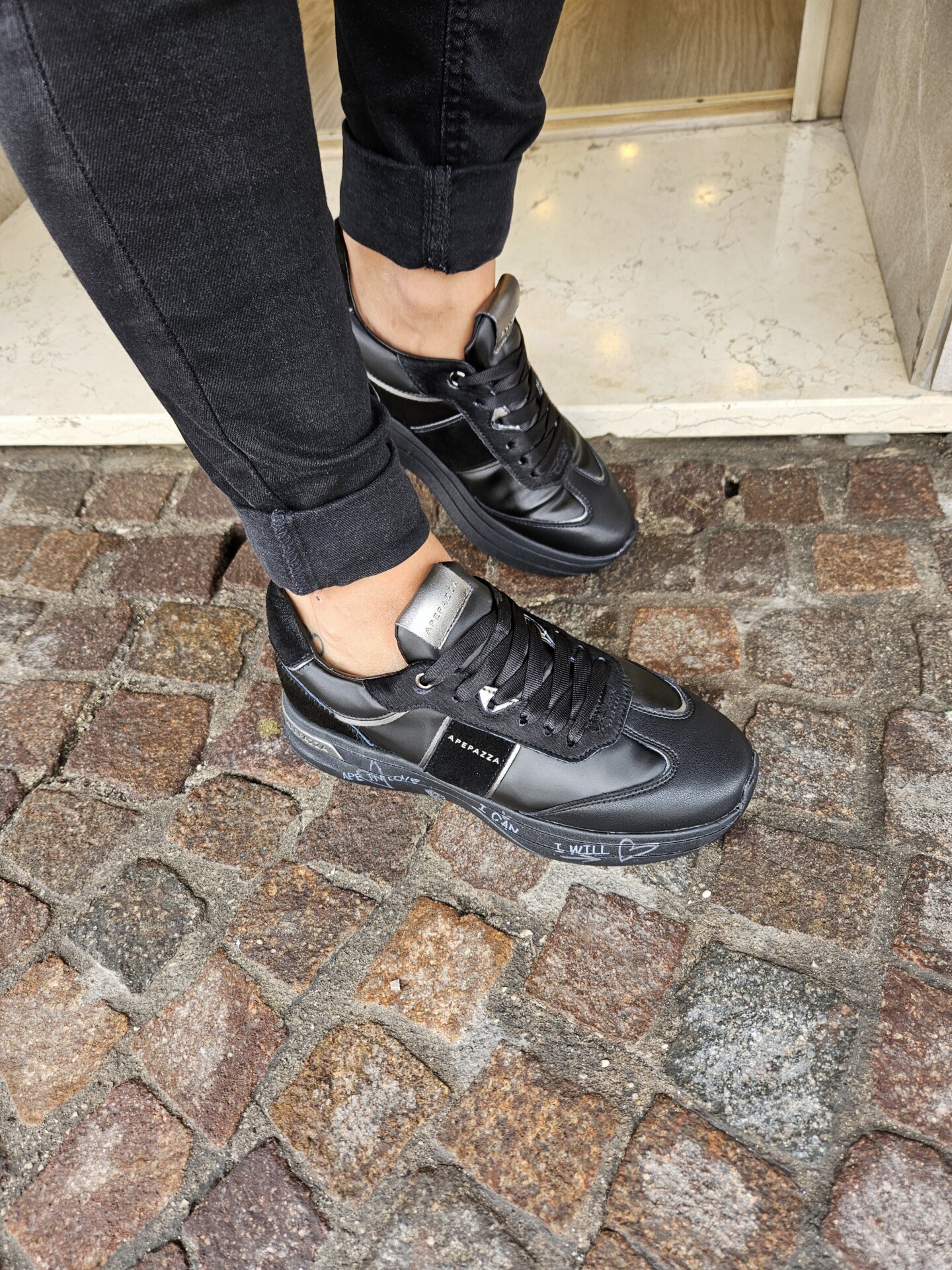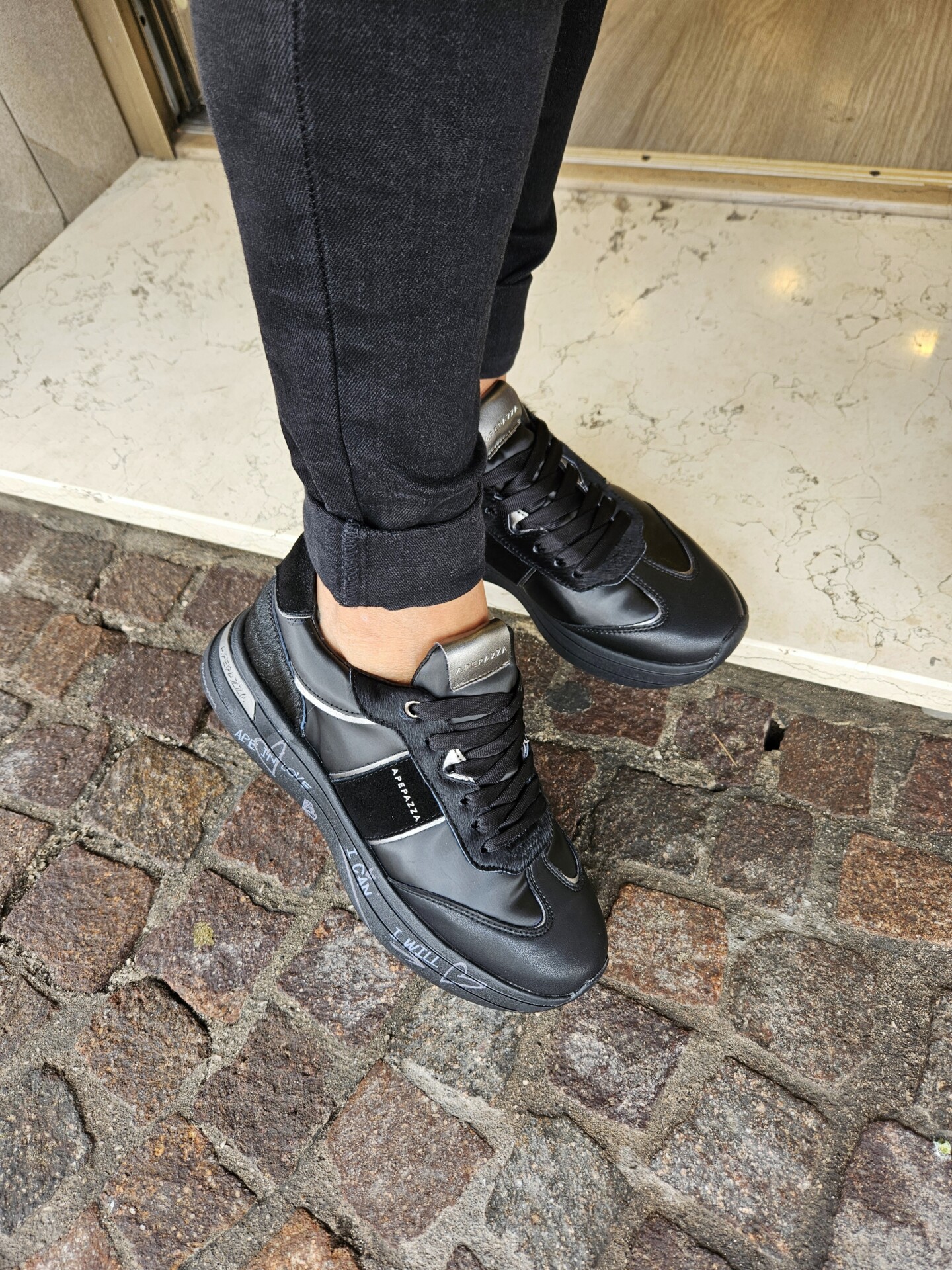 Questa sneaker unisce un look sportivo e di carattere. La tomaia, in pelle nera e pelle pony , è impreziosita da dettagli in argento metallizzato. La suola platform, con scritte a mano, aggiunge un tocco artistico e distintivo.
