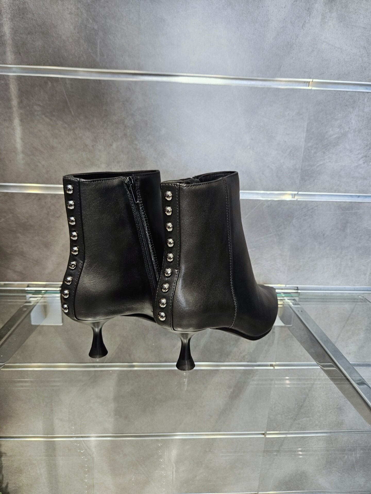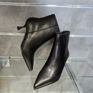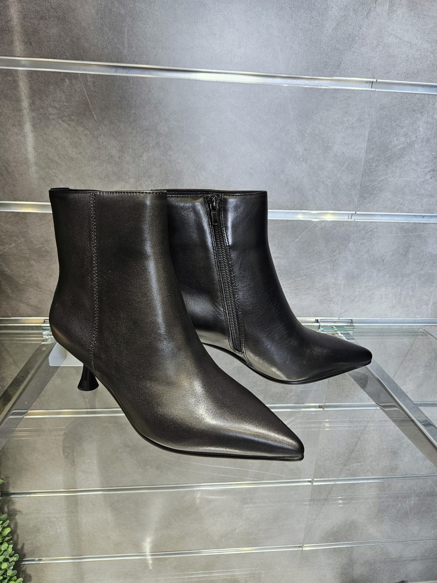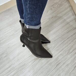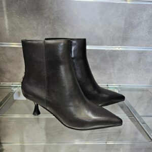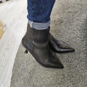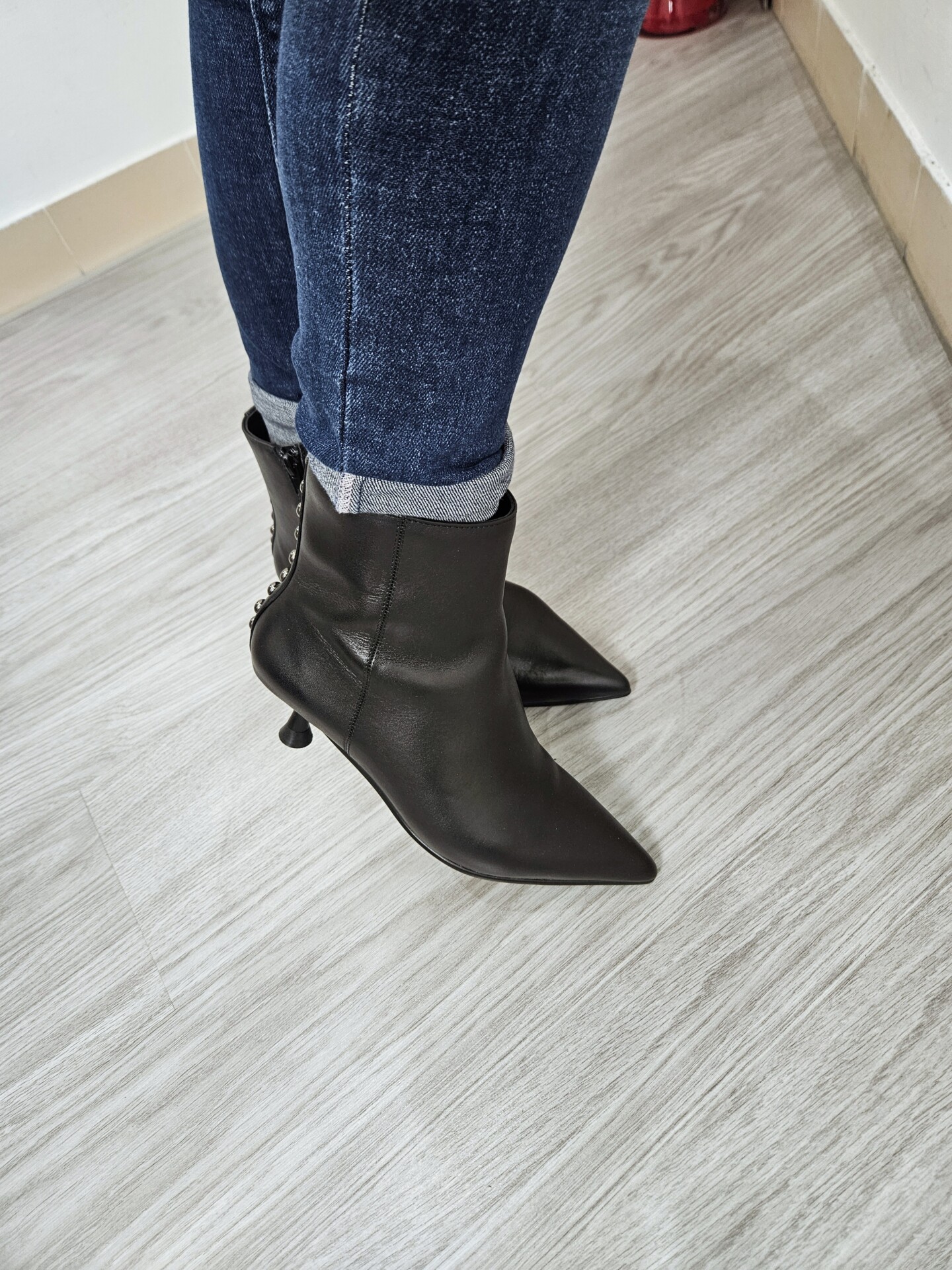 Questo raffinato stivaletto alla caviglia in pelle nera incarna un’eleganza intramontabile. La silhouette slanciata, la punta affusolata e il sottile tacco a rocchetto creano un look classico e sofisticato. Un accessorio versatile, perfetto sia per il giorno che per la sera, che aggiunge un tocco di classe a ogni outfit.