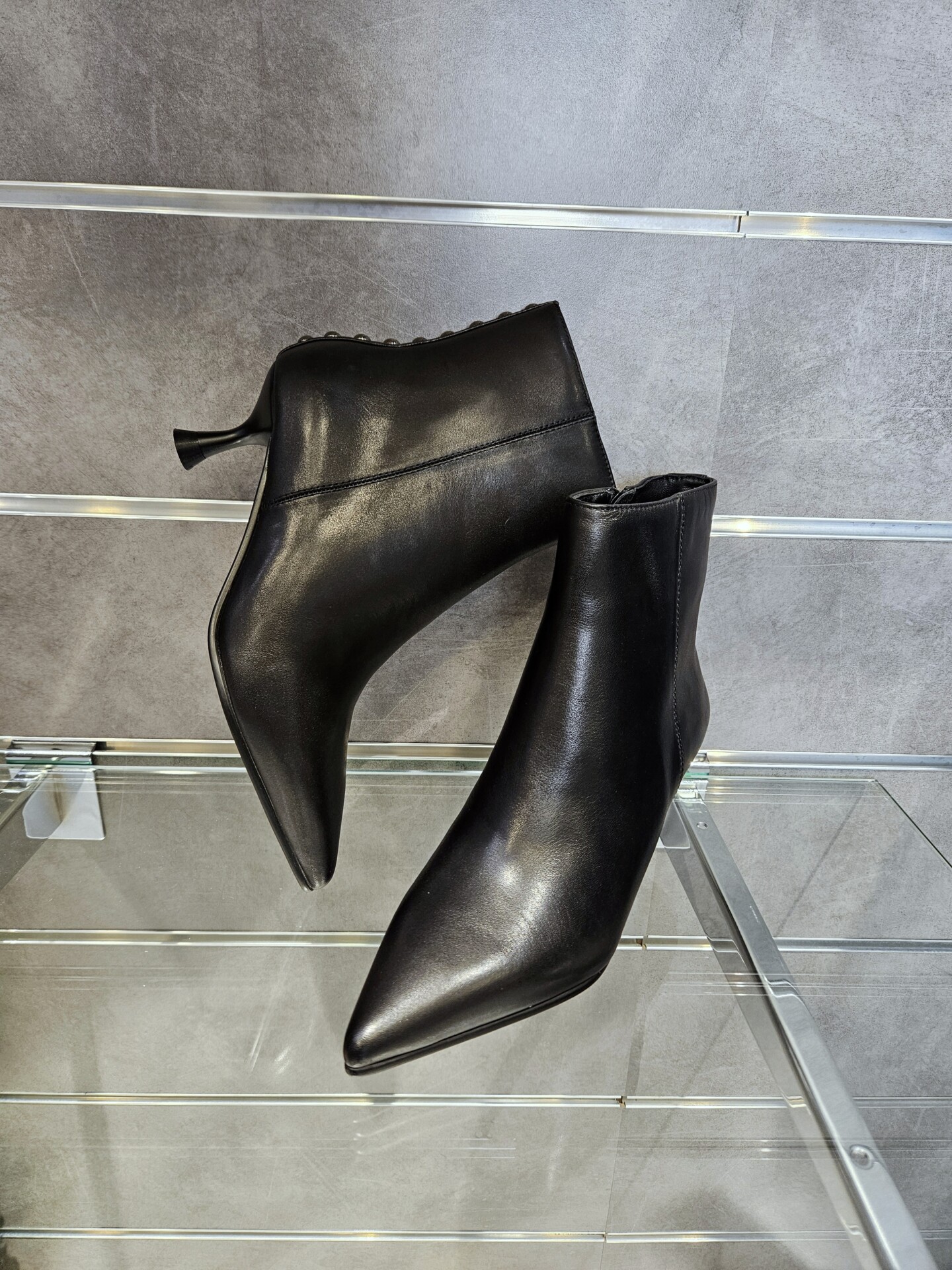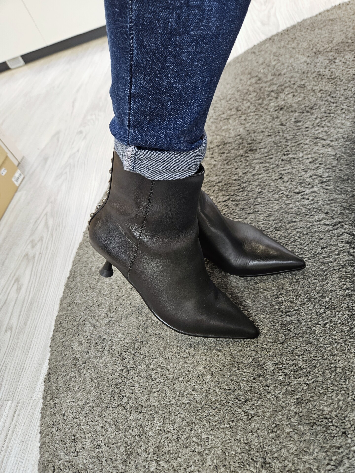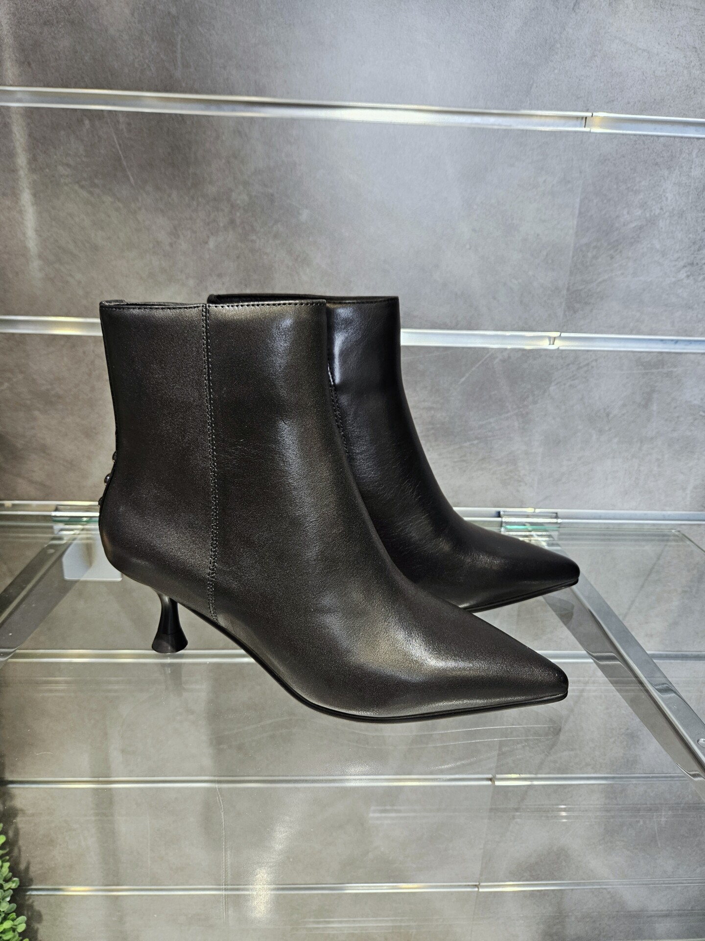 Questo raffinato stivaletto alla caviglia in pelle nera incarna un’eleganza intramontabile. La silhouette slanciata, la punta affusolata e il sottile tacco a rocchetto creano un look classico e sofisticato. Un accessorio versatile, perfetto sia per il giorno che per la sera, che aggiunge un tocco di classe a ogni outfit.