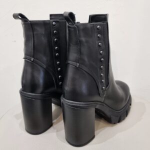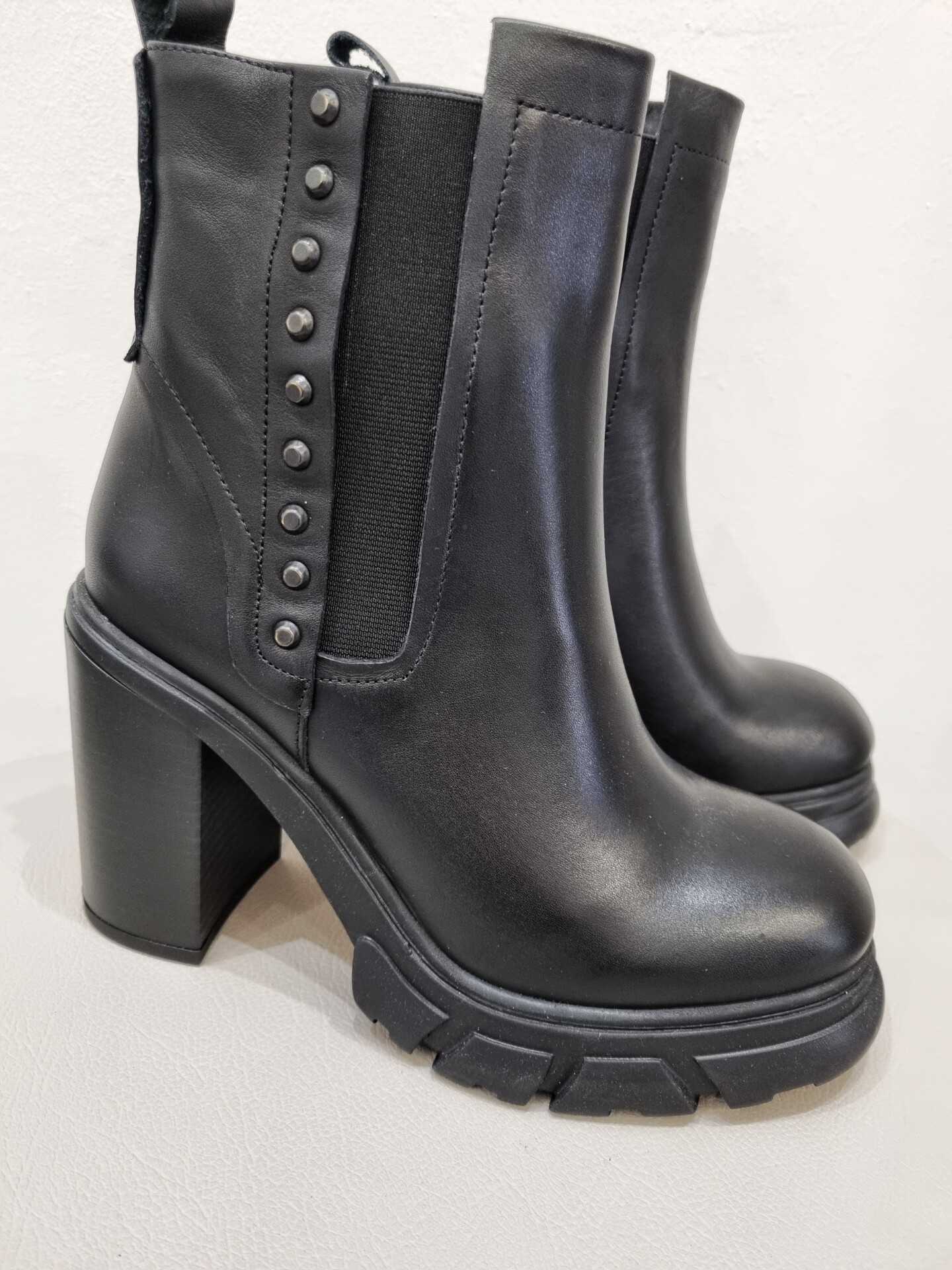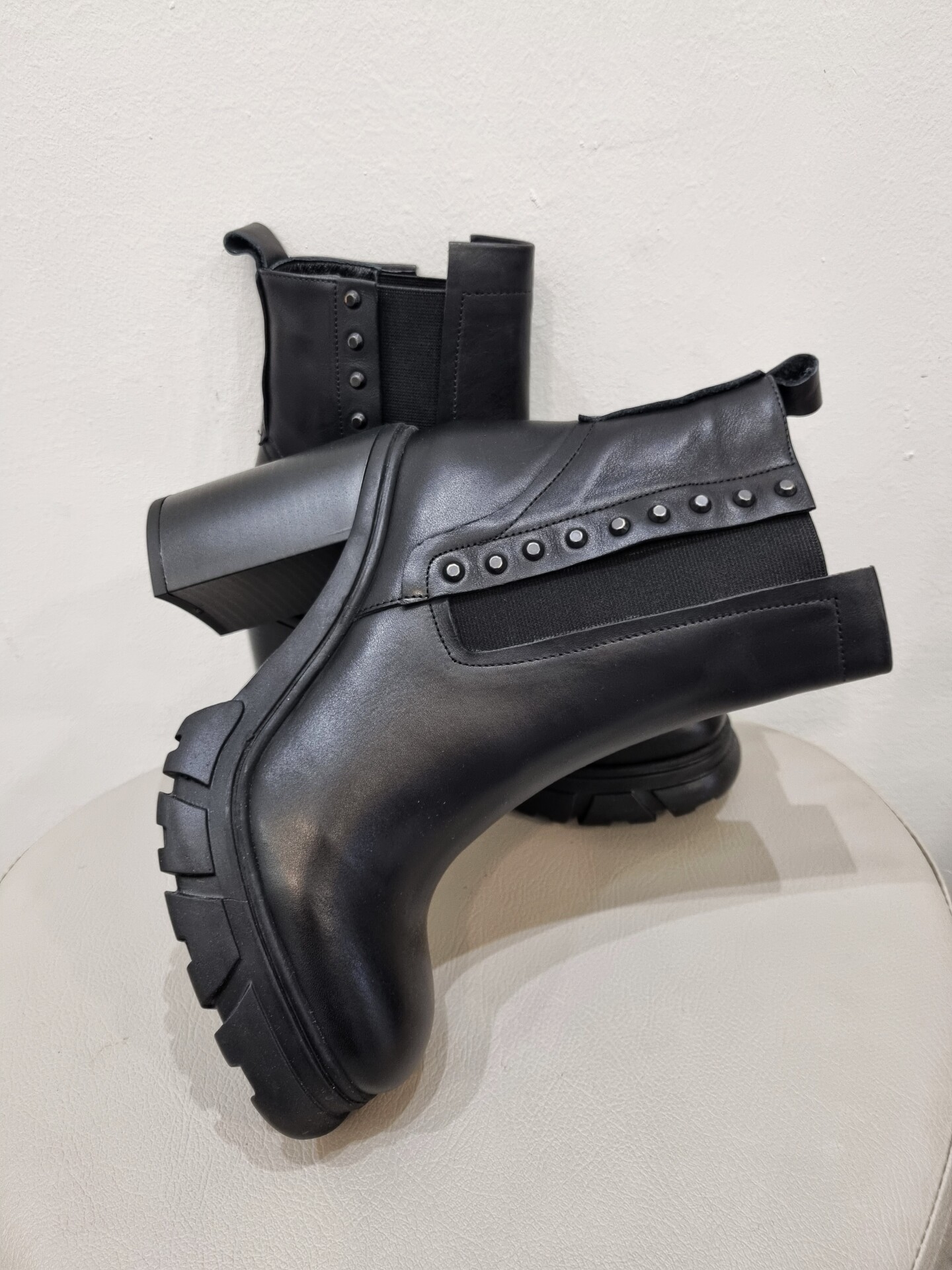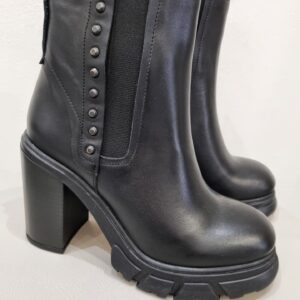 Tronchetti con tacco e plateau in pelle con elastico e borchie. Plateau in gomma decorato con un motivo che richiama il mondo dello sport.