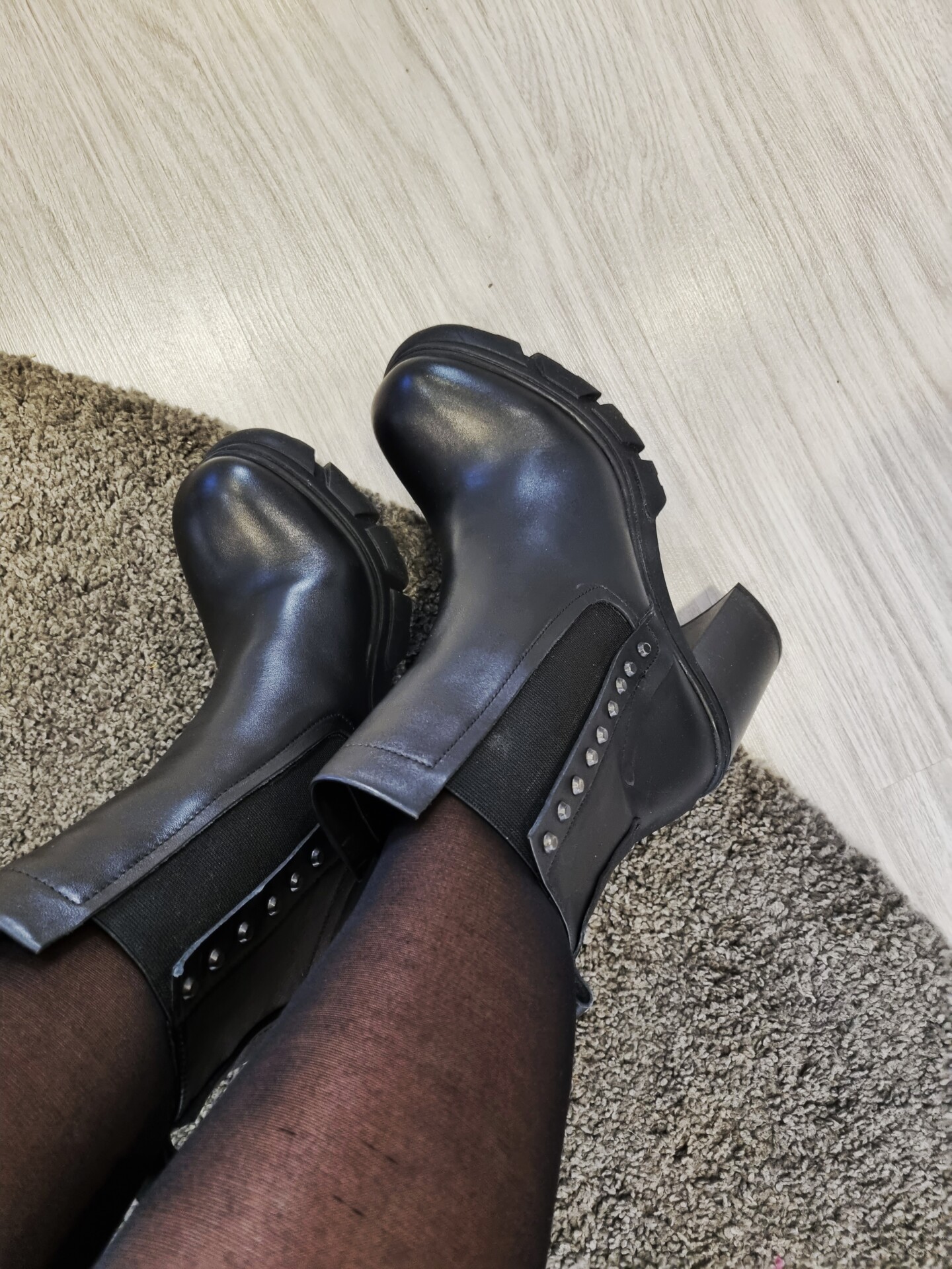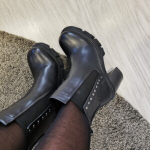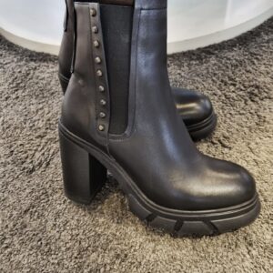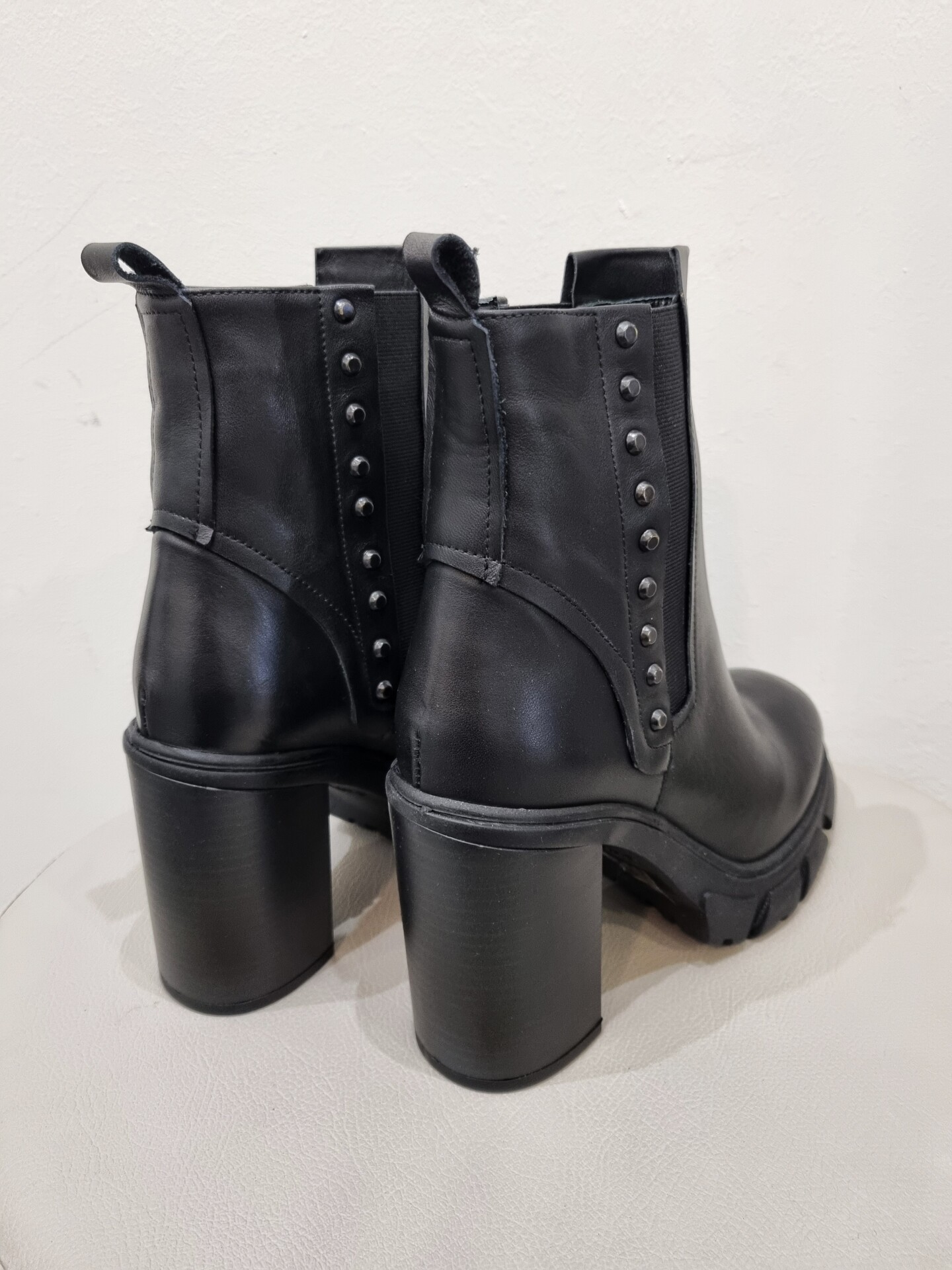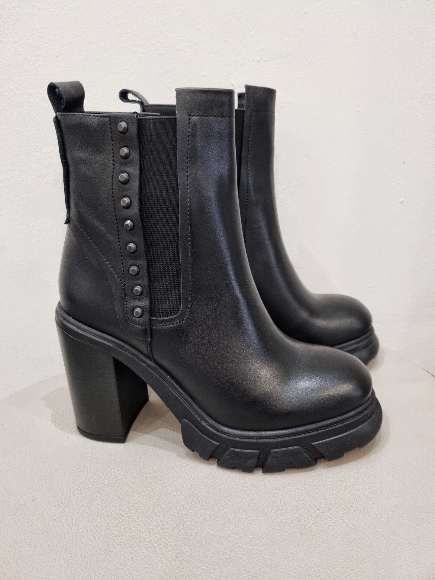 Tronchetti con tacco e plateau in pelle con elastico e borchie. Plateau in gomma decorato con un motivo che richiama il mondo dello sport.