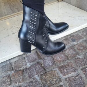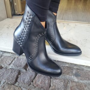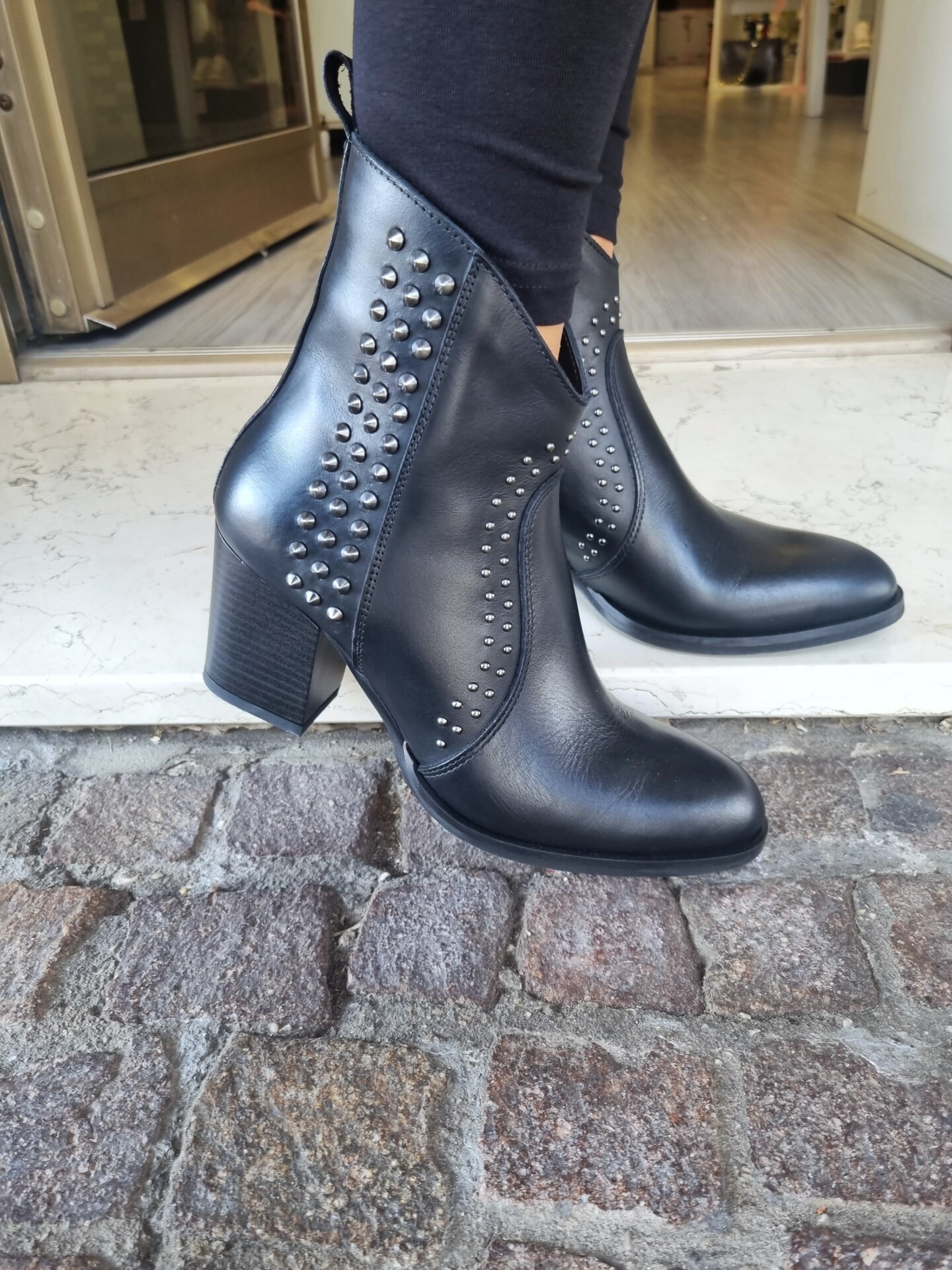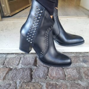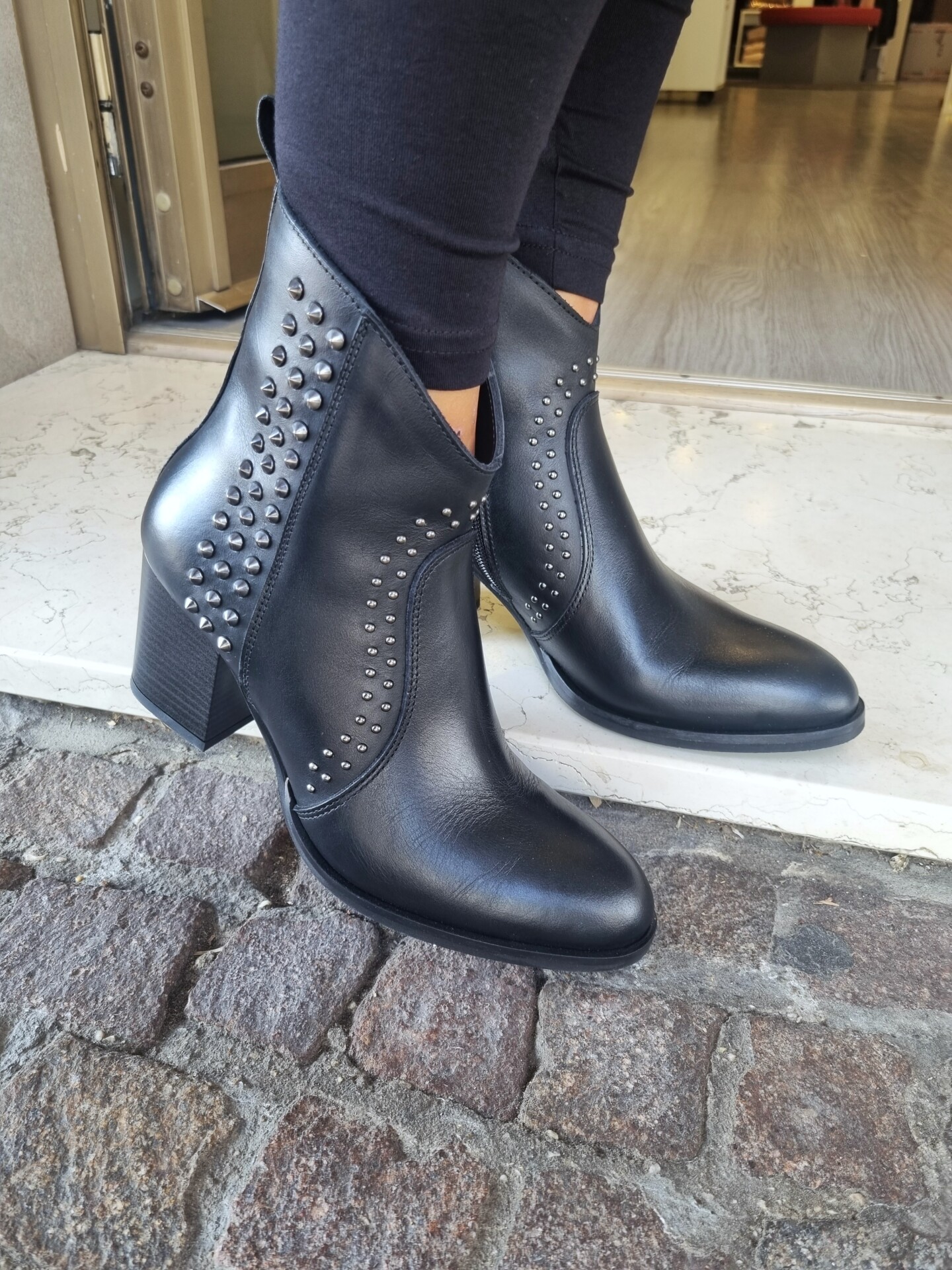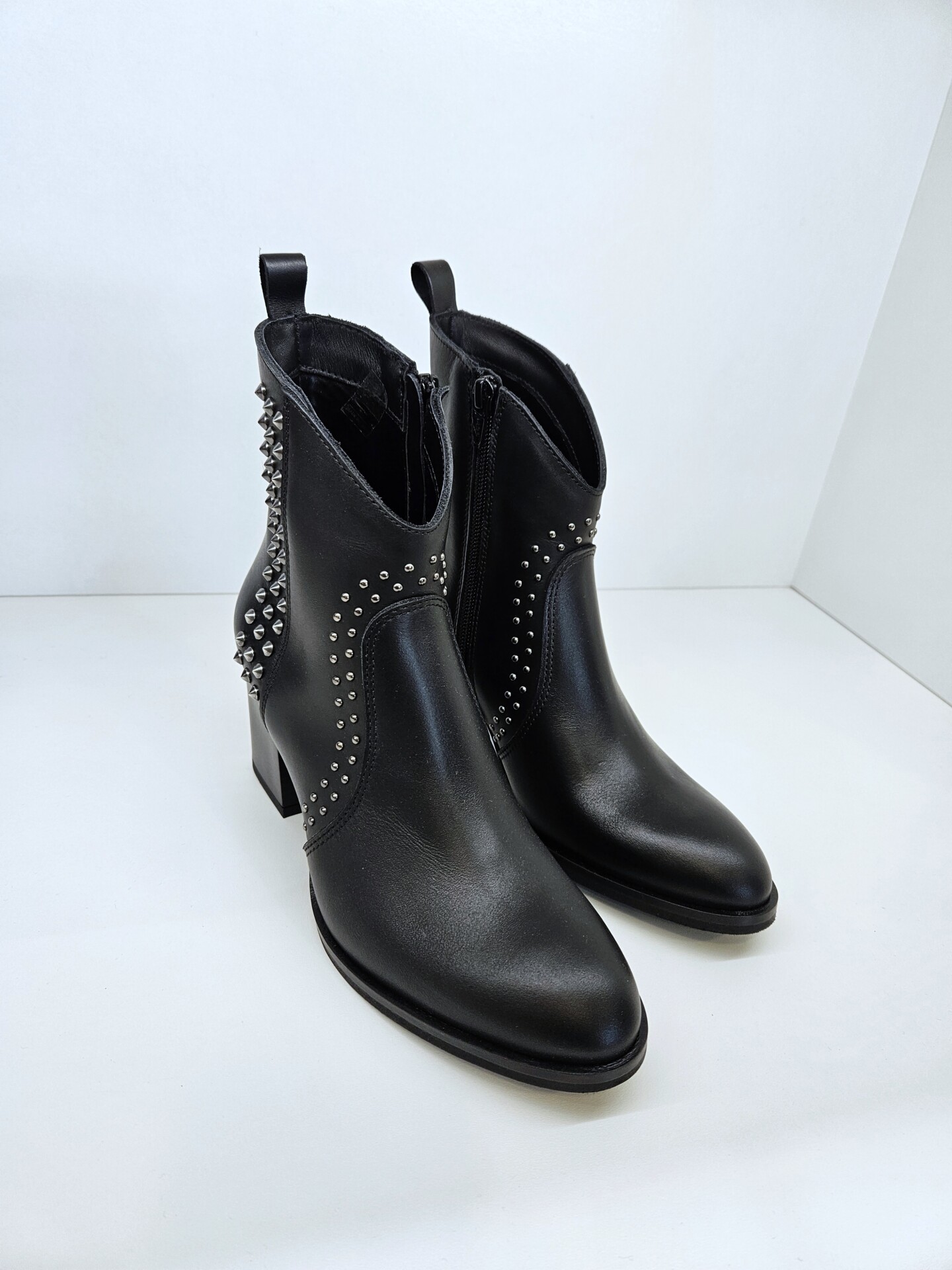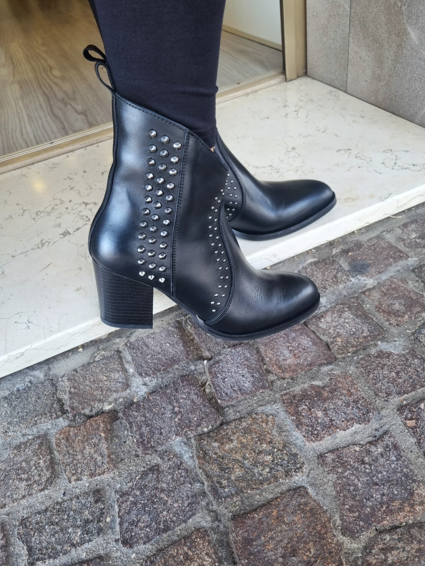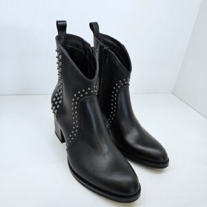 Tronchetto da donna in pelle in stile texano con fantasia di borchie a decoro. tacco 80mm. il soletto è in pelle. una calzatura dal carattere grintoso che garantirà una marcia in più ai vostri look.