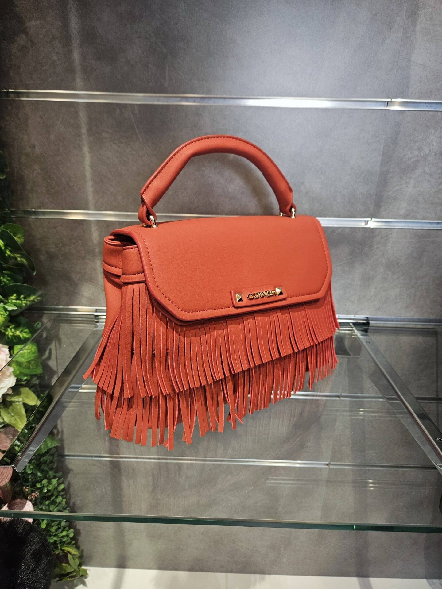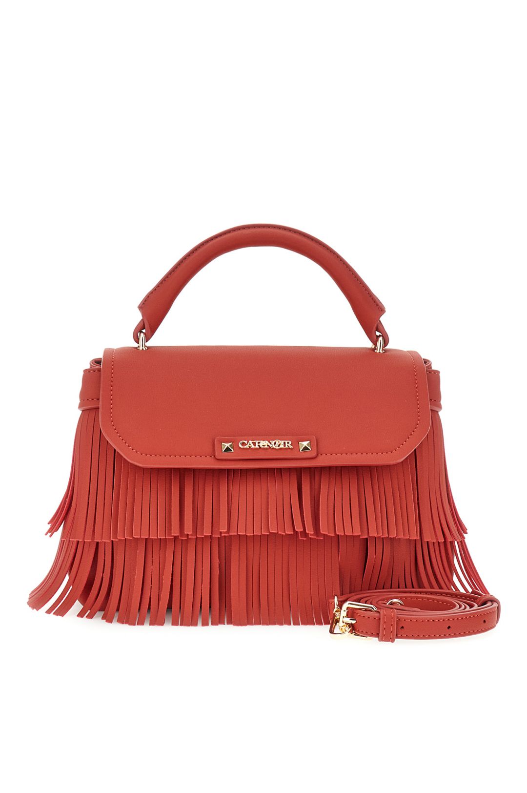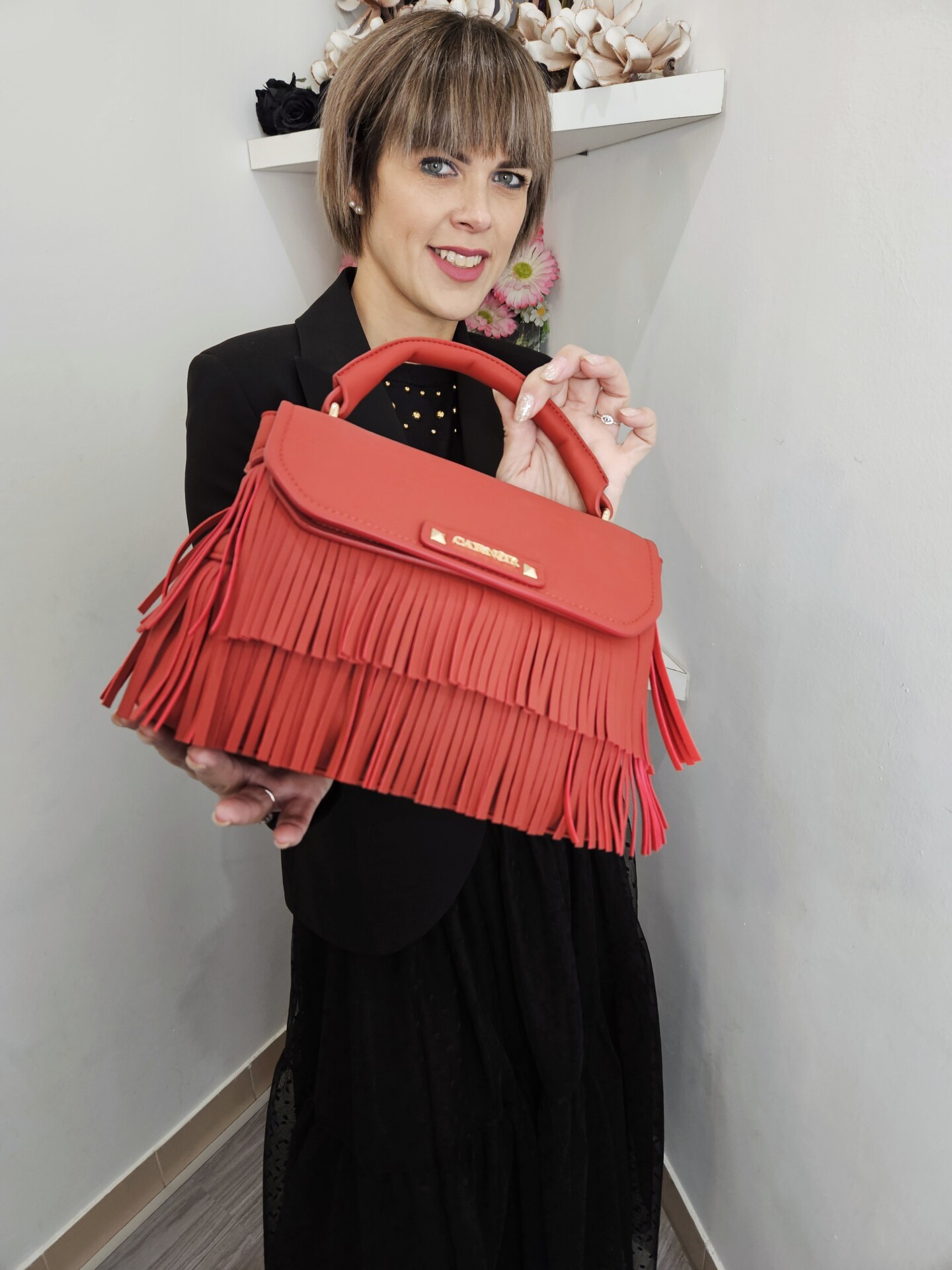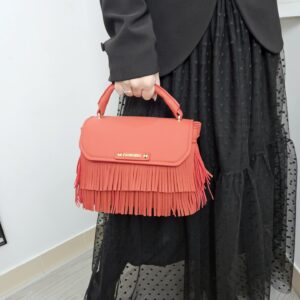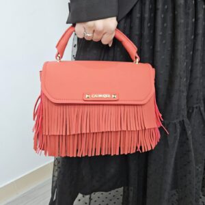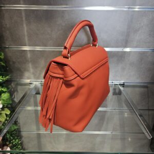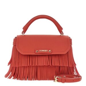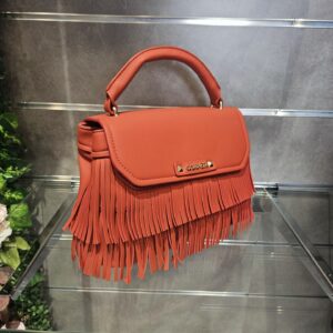 Borsa a mano in similpelle con pattina e frange decorative logo frontale in metallo. tramezza interna e tracolla removibile per uno stile versatile e grintoso.