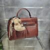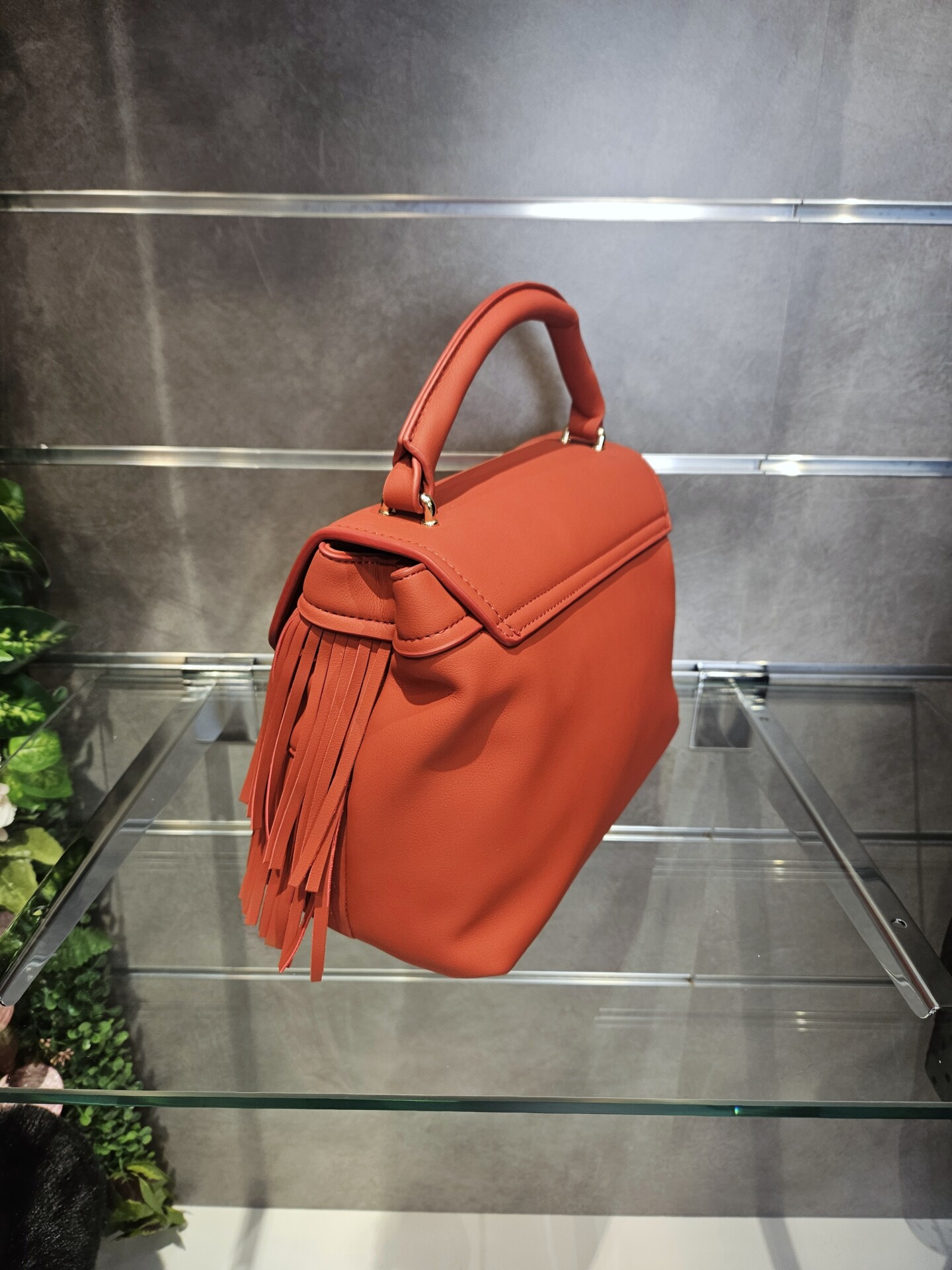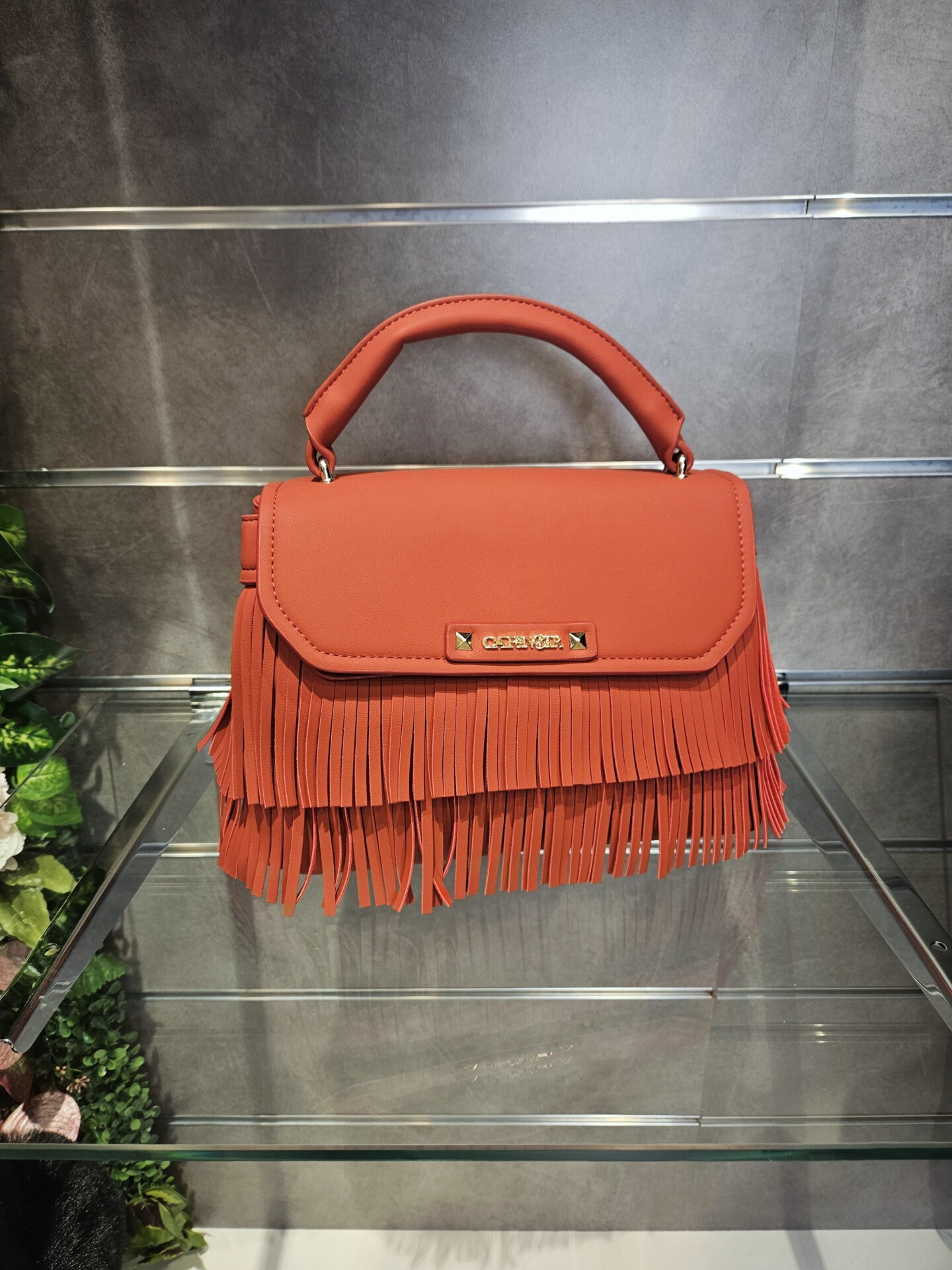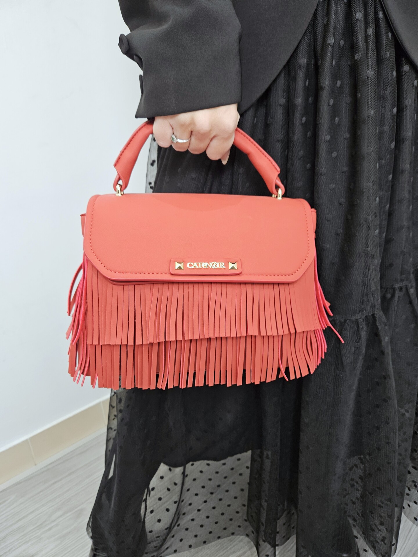 Borsa a mano in similpelle con pattina e frange decorative logo frontale in metallo. tramezza interna e tracolla removibile per uno stile versatile e grintoso.