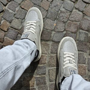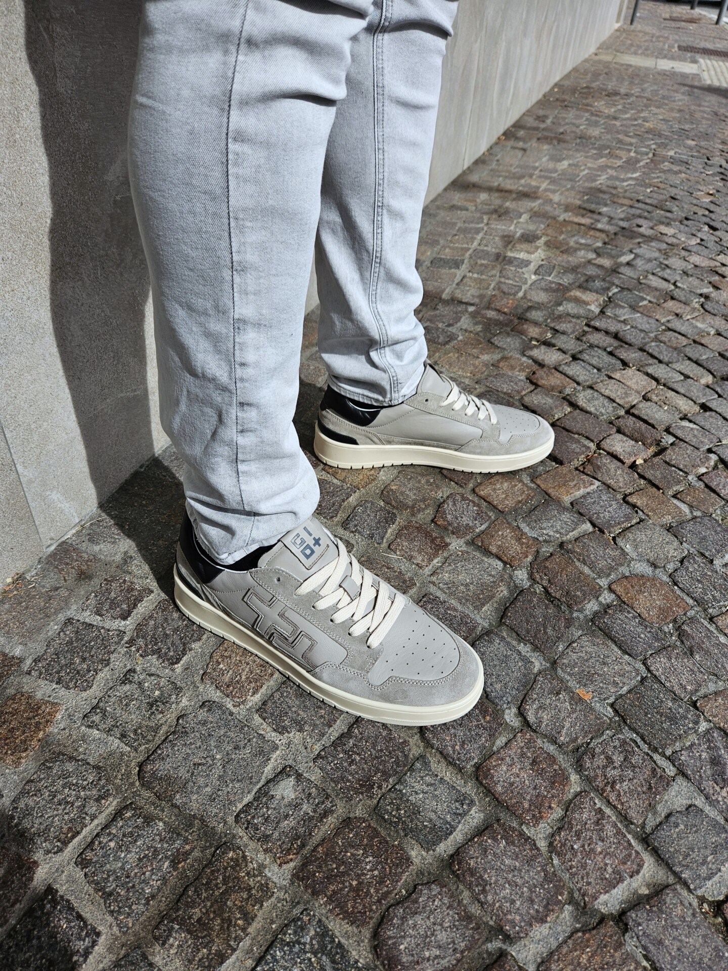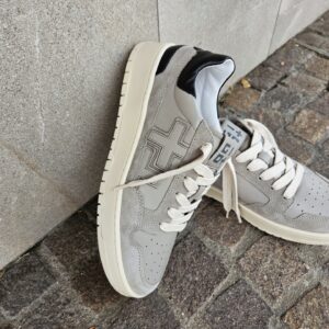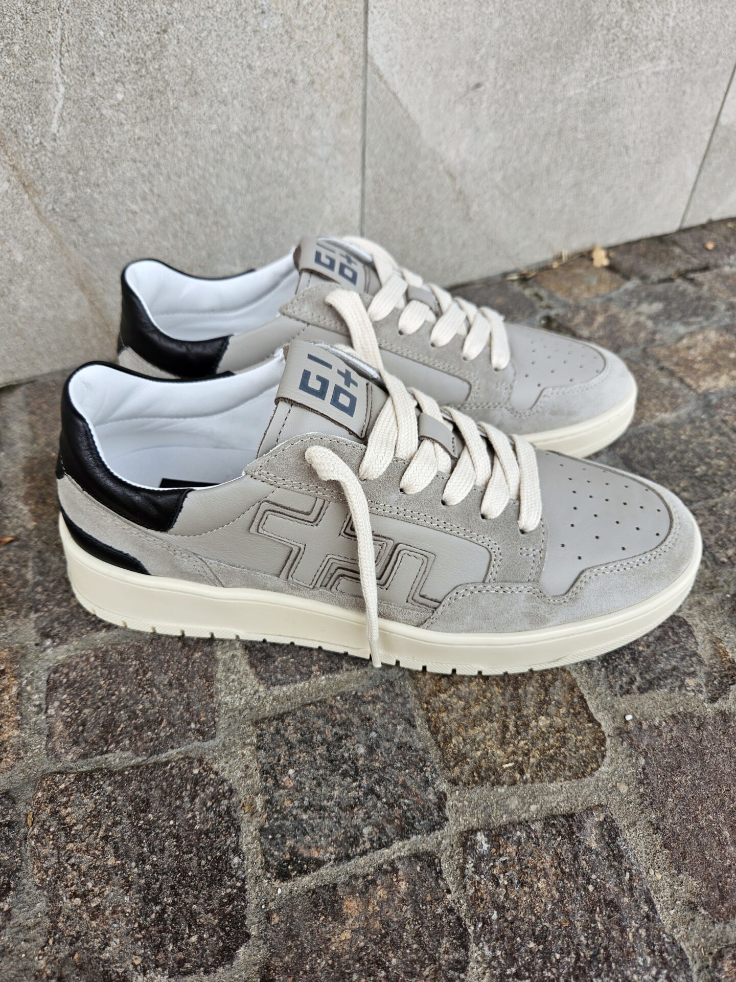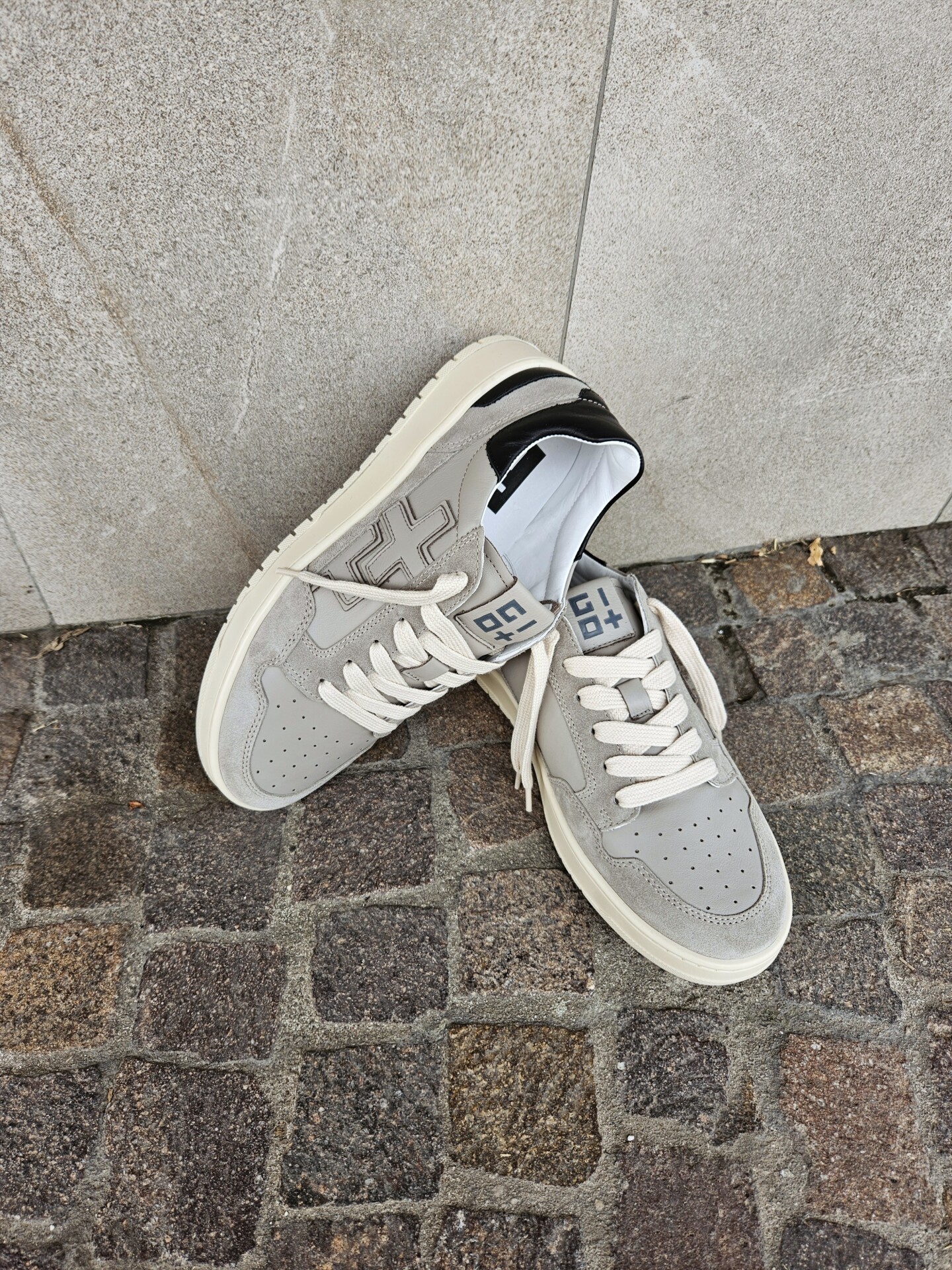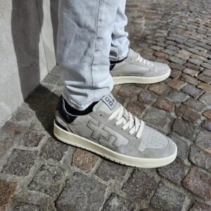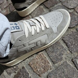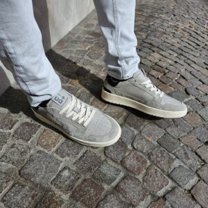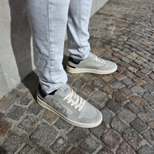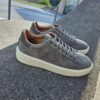 Sneakers GIO+ in pelle di vitello di colore grigio. Caratterizzata dal + + sulla parte esterna, targhetta sulla linguetta con il logo in grigio, lacci piatti in cotone beige.