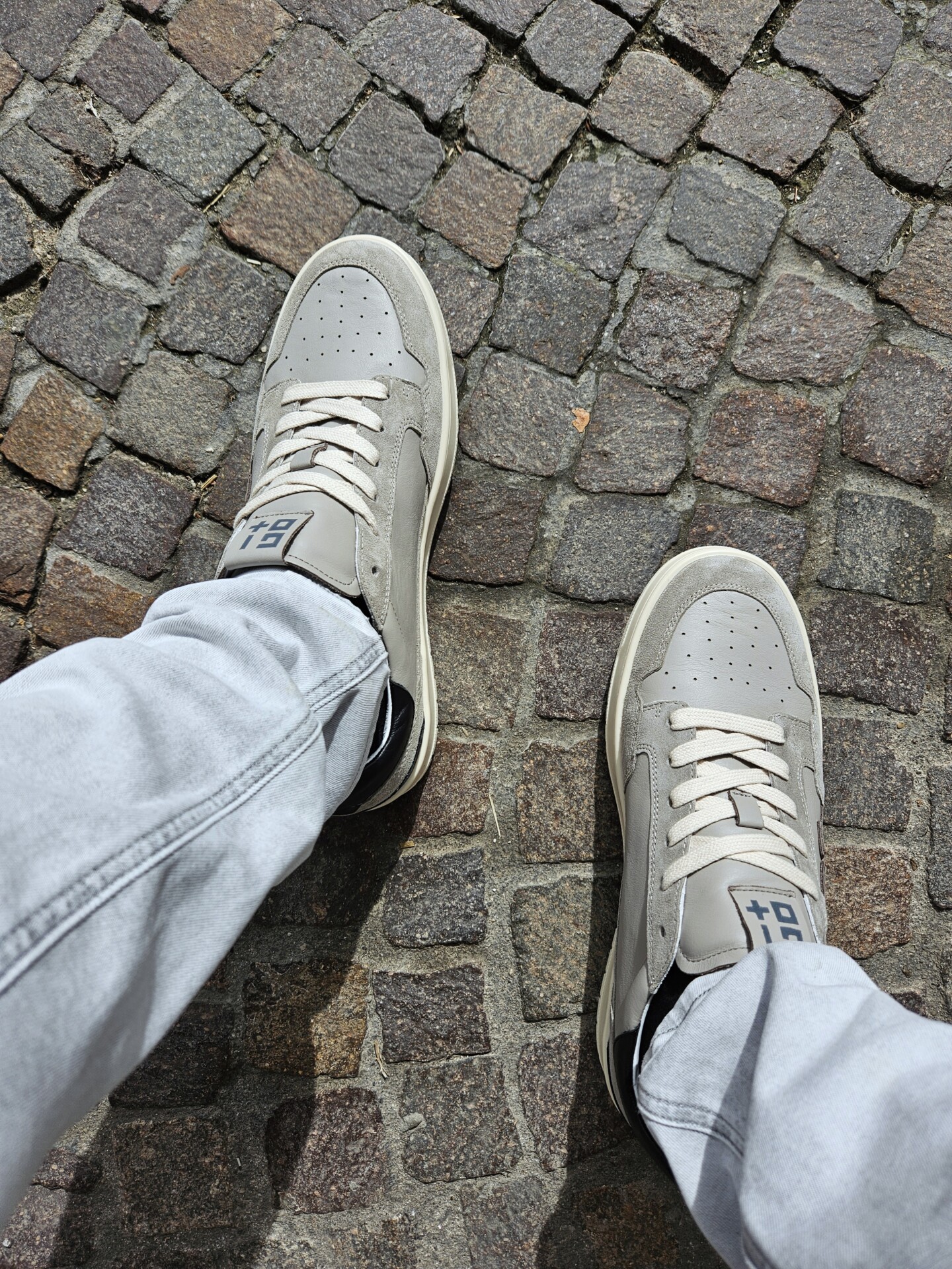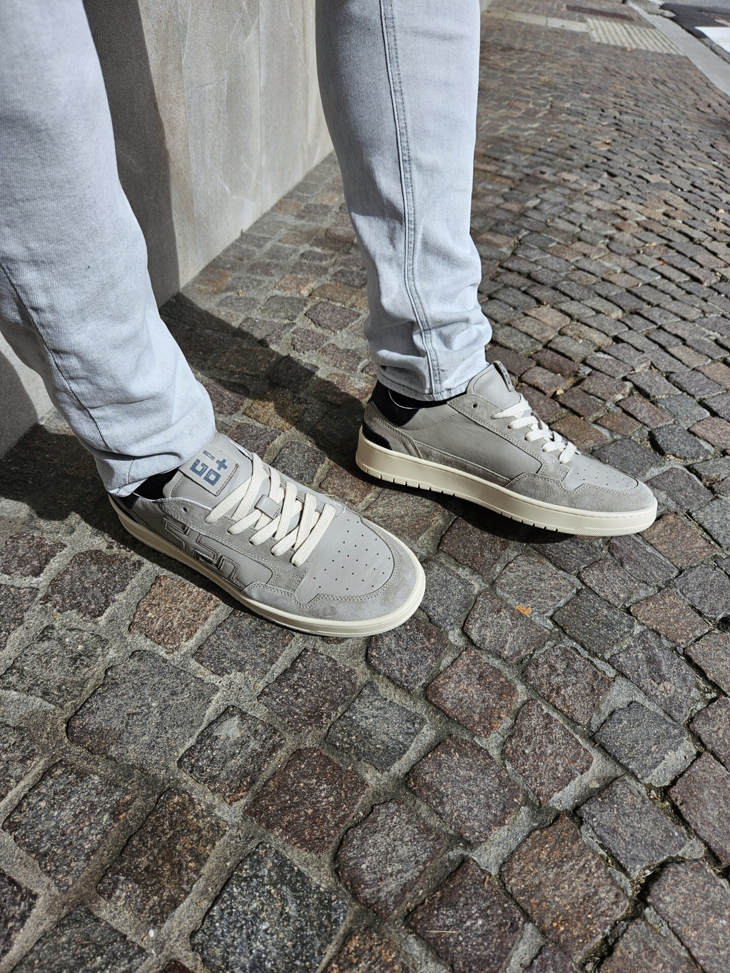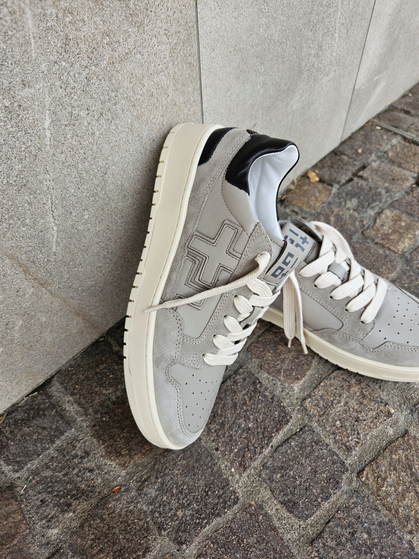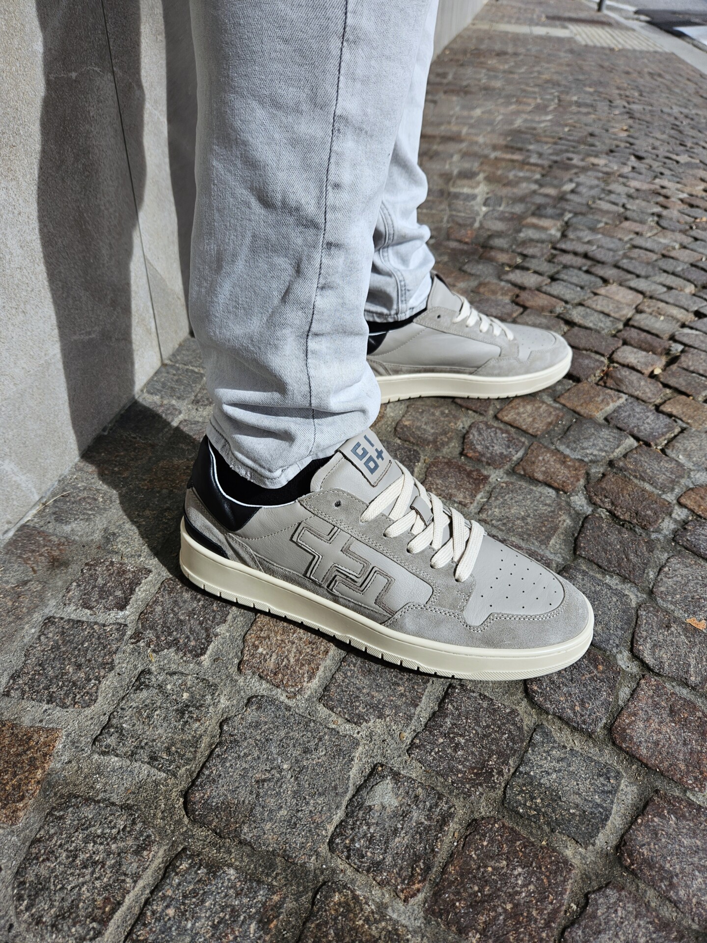 Sneakers GIO+ in pelle di vitello di colore grigio. Caratterizzata dal + + sulla parte esterna, targhetta sulla linguetta con il logo in grigio, lacci piatti in cotone beige.